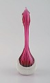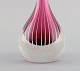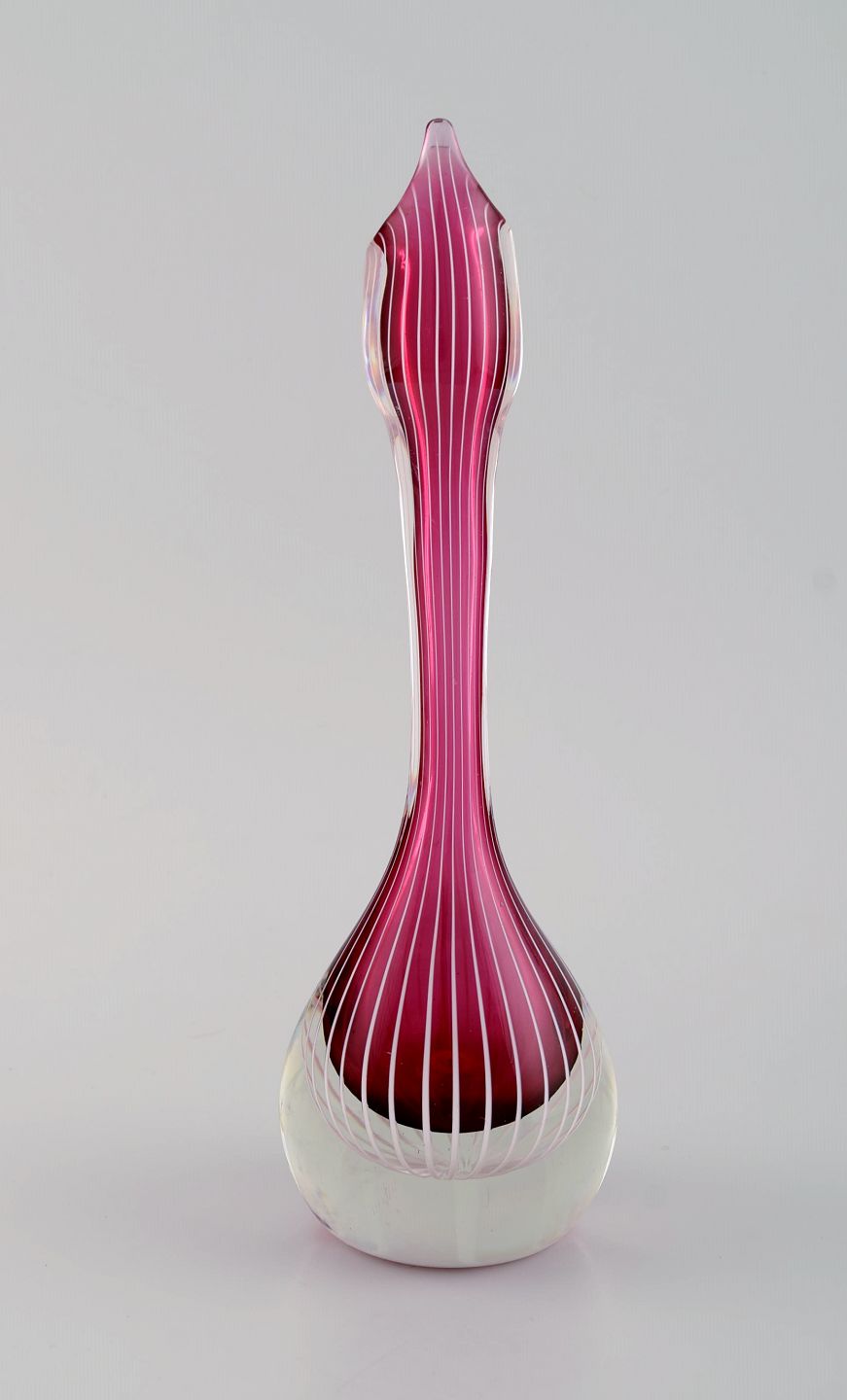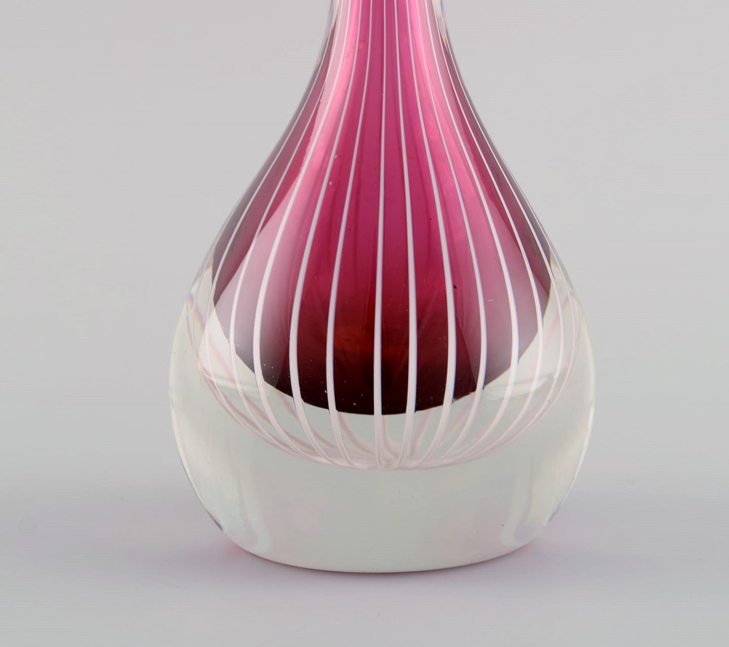 Svensk glaskunstner. Organisk formet vase i violet og klart mundblæst kunstglas med hvide striber. Svensk design, midt 1900-tallet. Måler: 25 x 8 cm. I flot stand.
