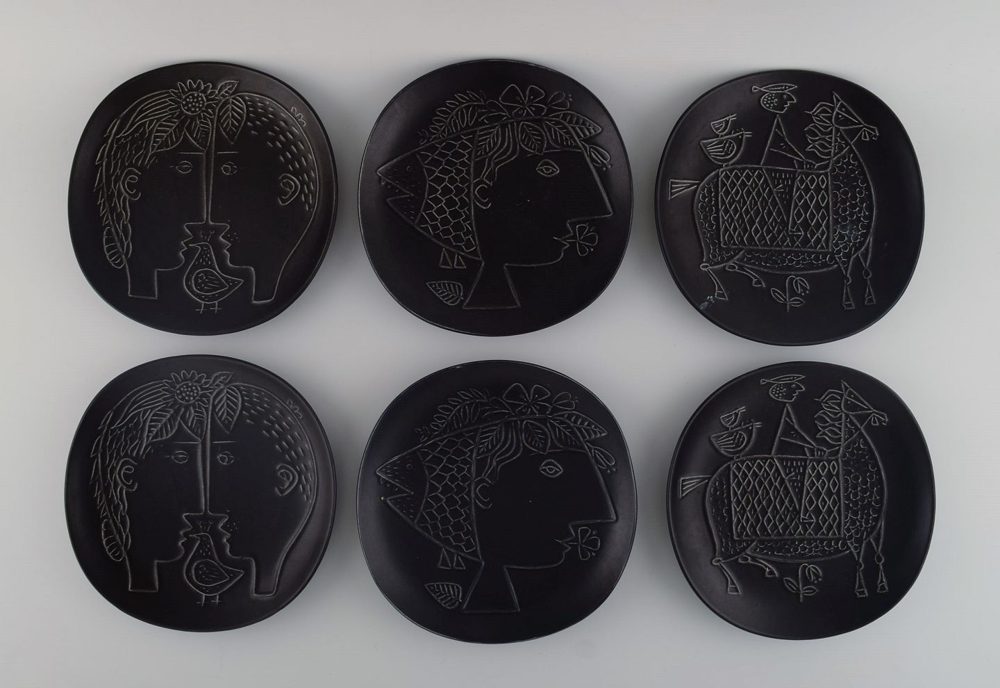 Stig Lindberg (1916-1982) for Gustavsberg. Seks Piazza tallerkener i glaseret stentųj. Svensk design, 1960'erne. Diameter: 19,5 cm. I flot stand. Stemplet.