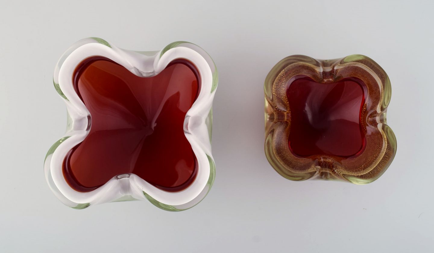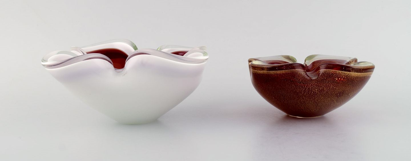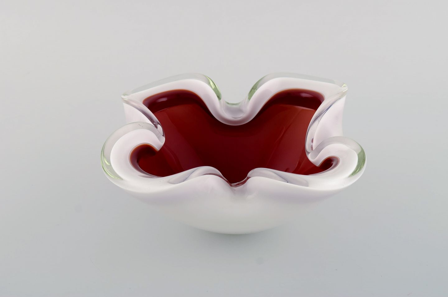 To Murano skåle i rødt og hvidt mundblæst kunstglas. Italiensk design, 1960'erne.