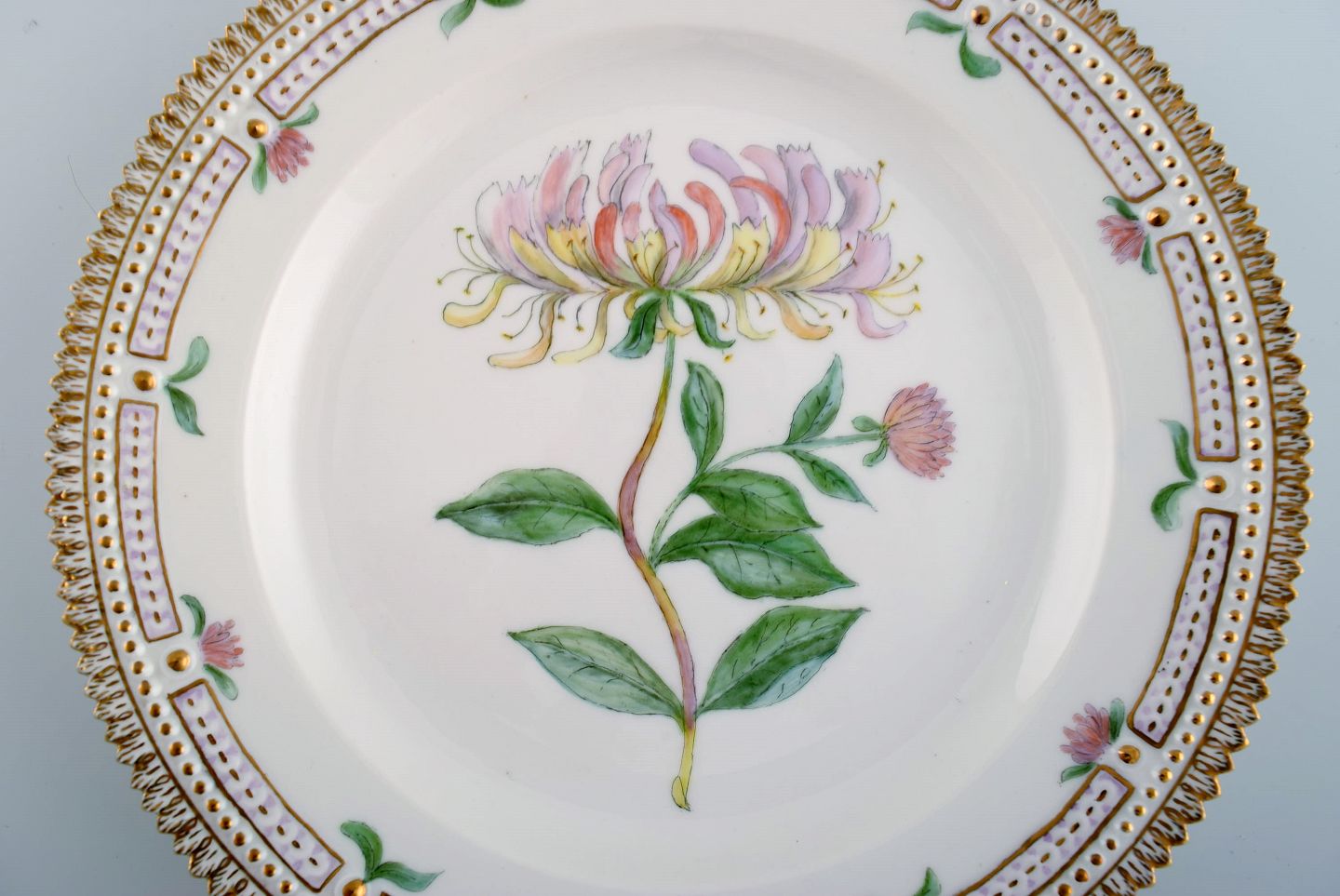 Royal Copenhagen Flora Danica tallerken i håndmalet porcelæn med blomster og gulddekoration. Dateret 1948.
