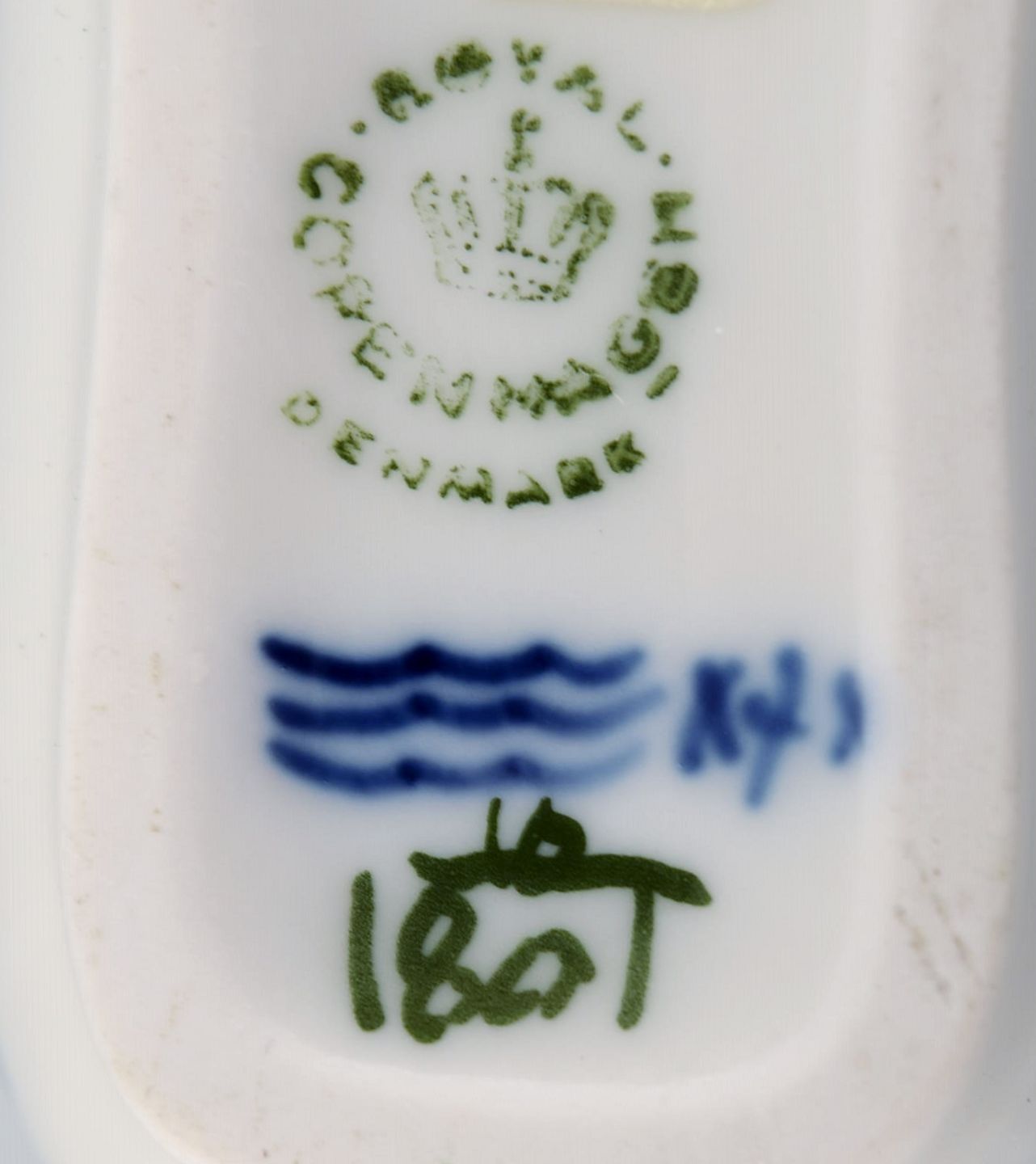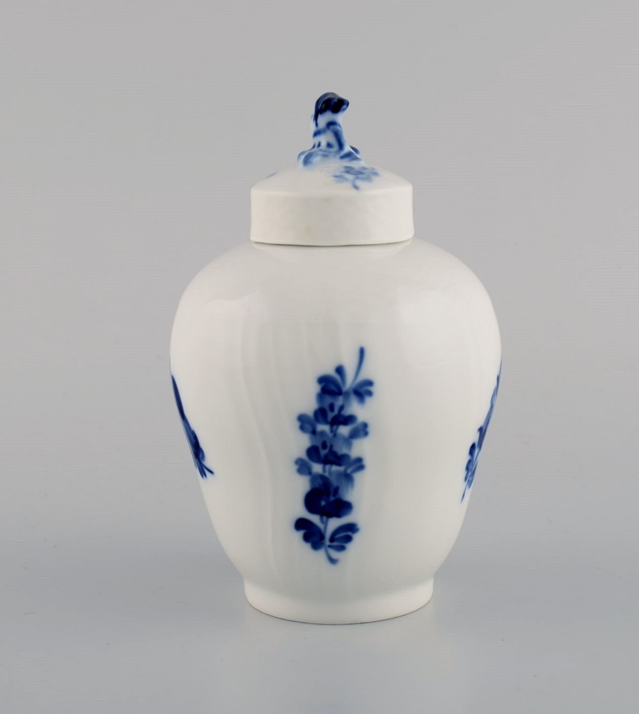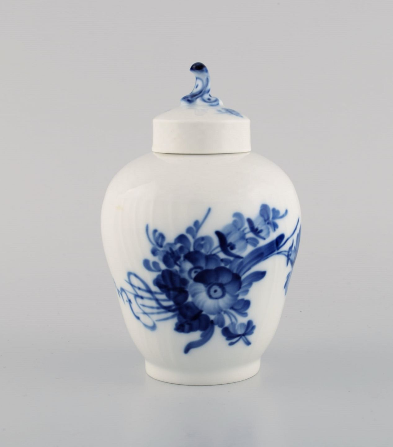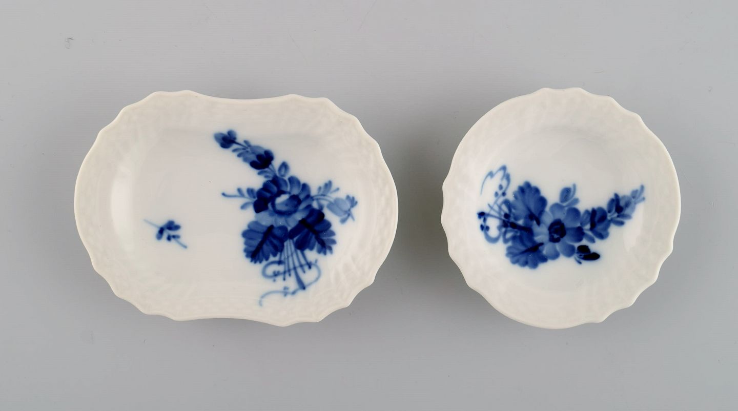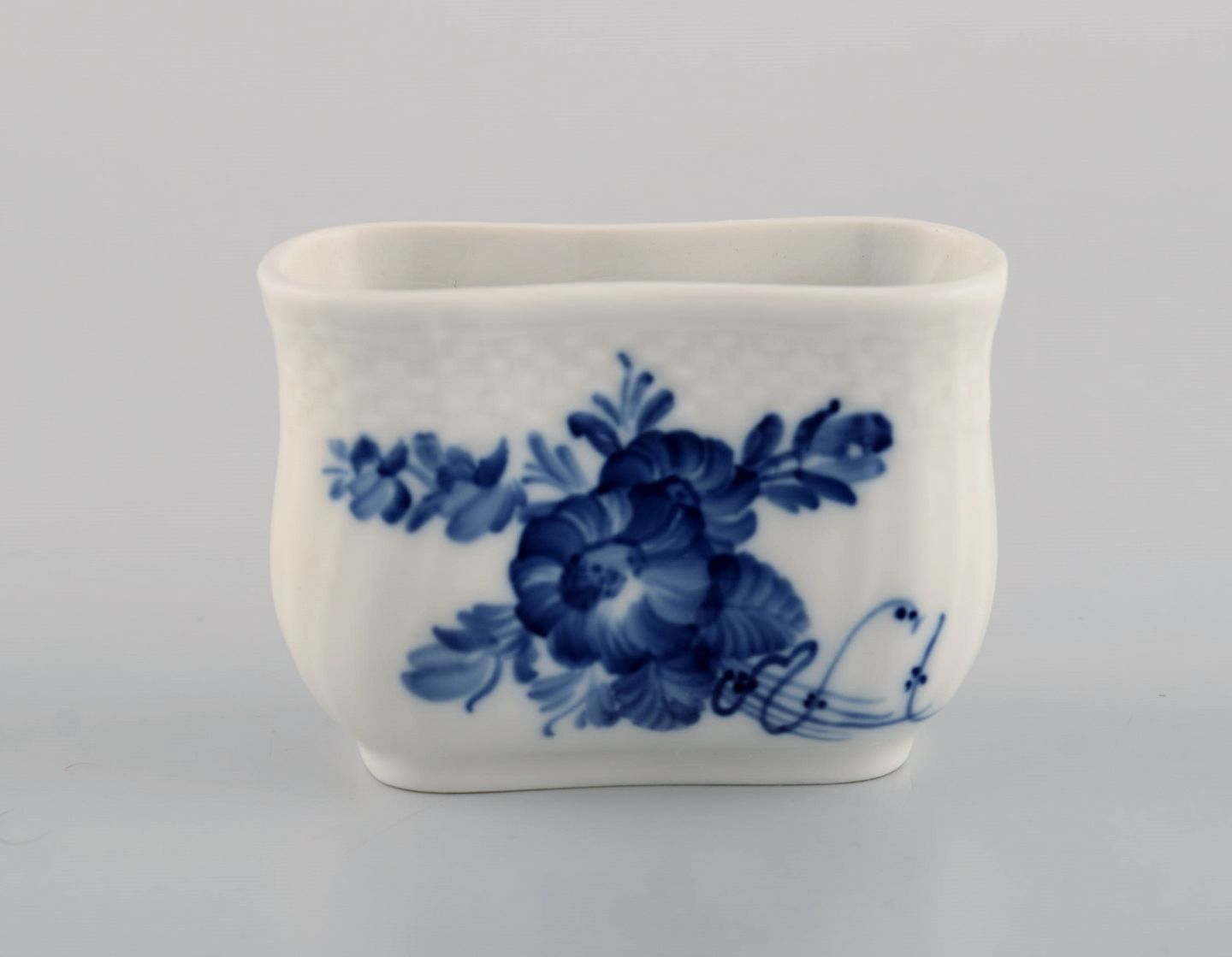Royal Copenhagen Blå Blomst Svejfet. Tandstikholder, tedåse og fem kuvertsmør i porcelæn med blomsterdekoration. Tedåsen måler: 13,5 x 9 cm. I flot stand. 1. Sortering. Stemplet.