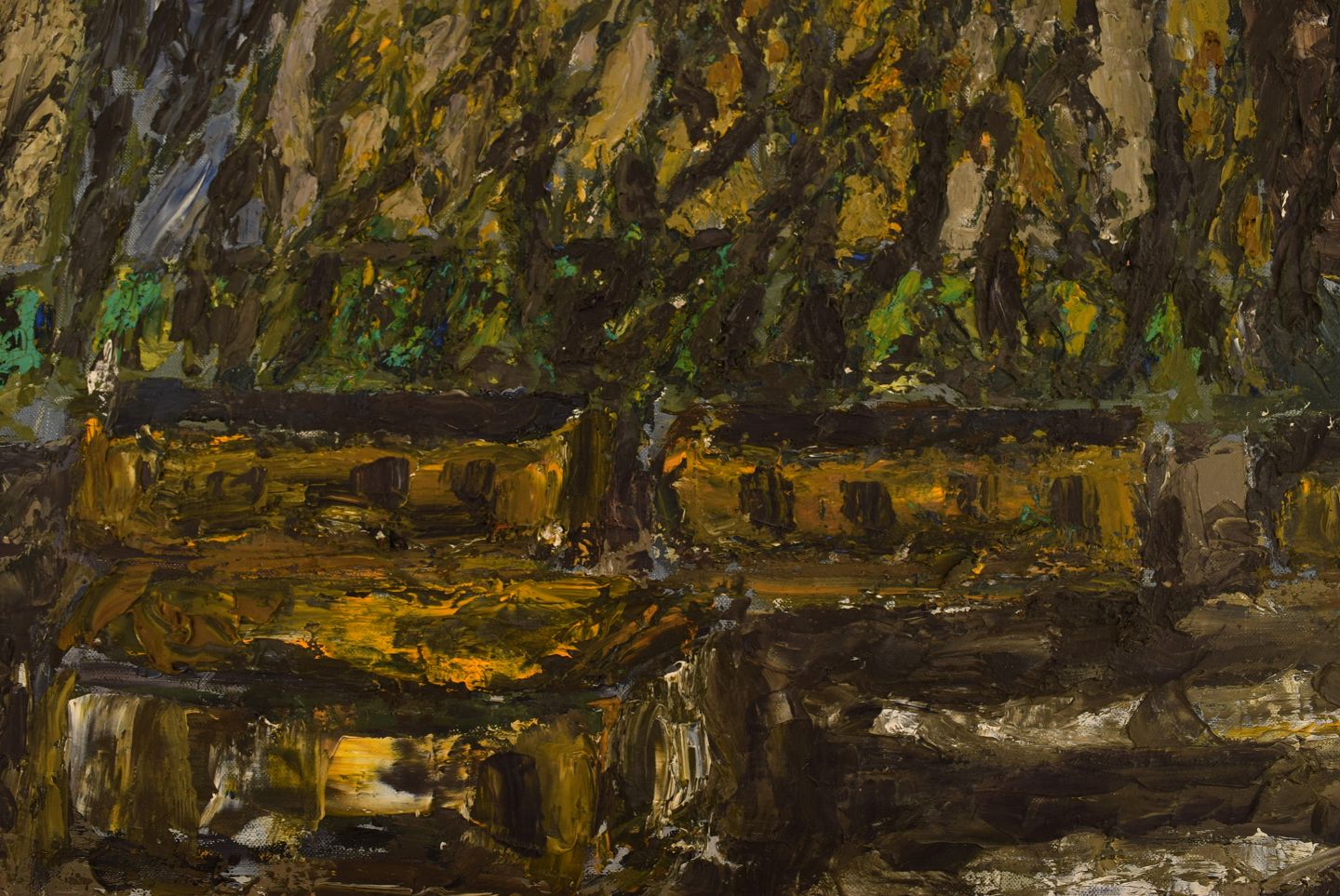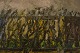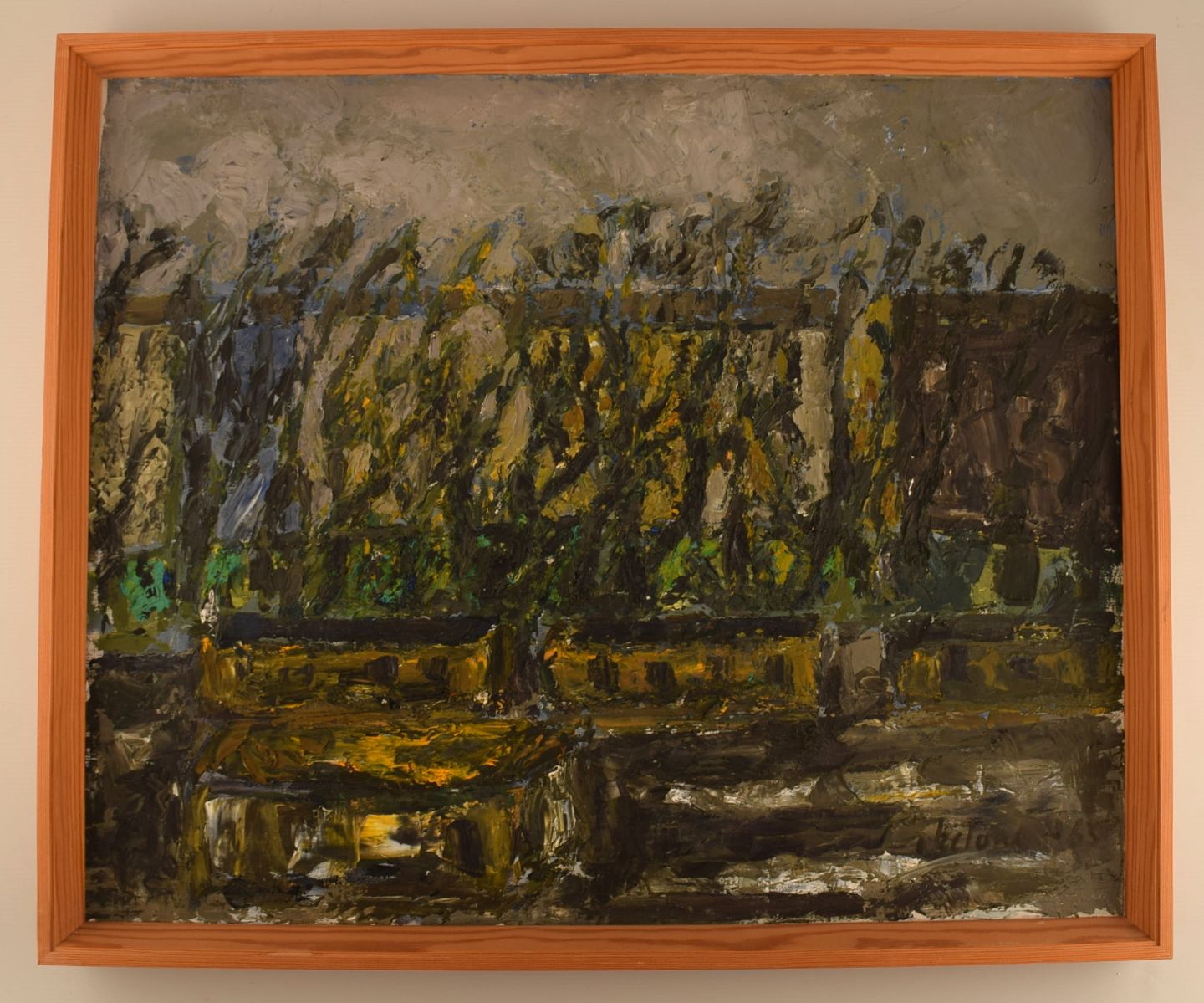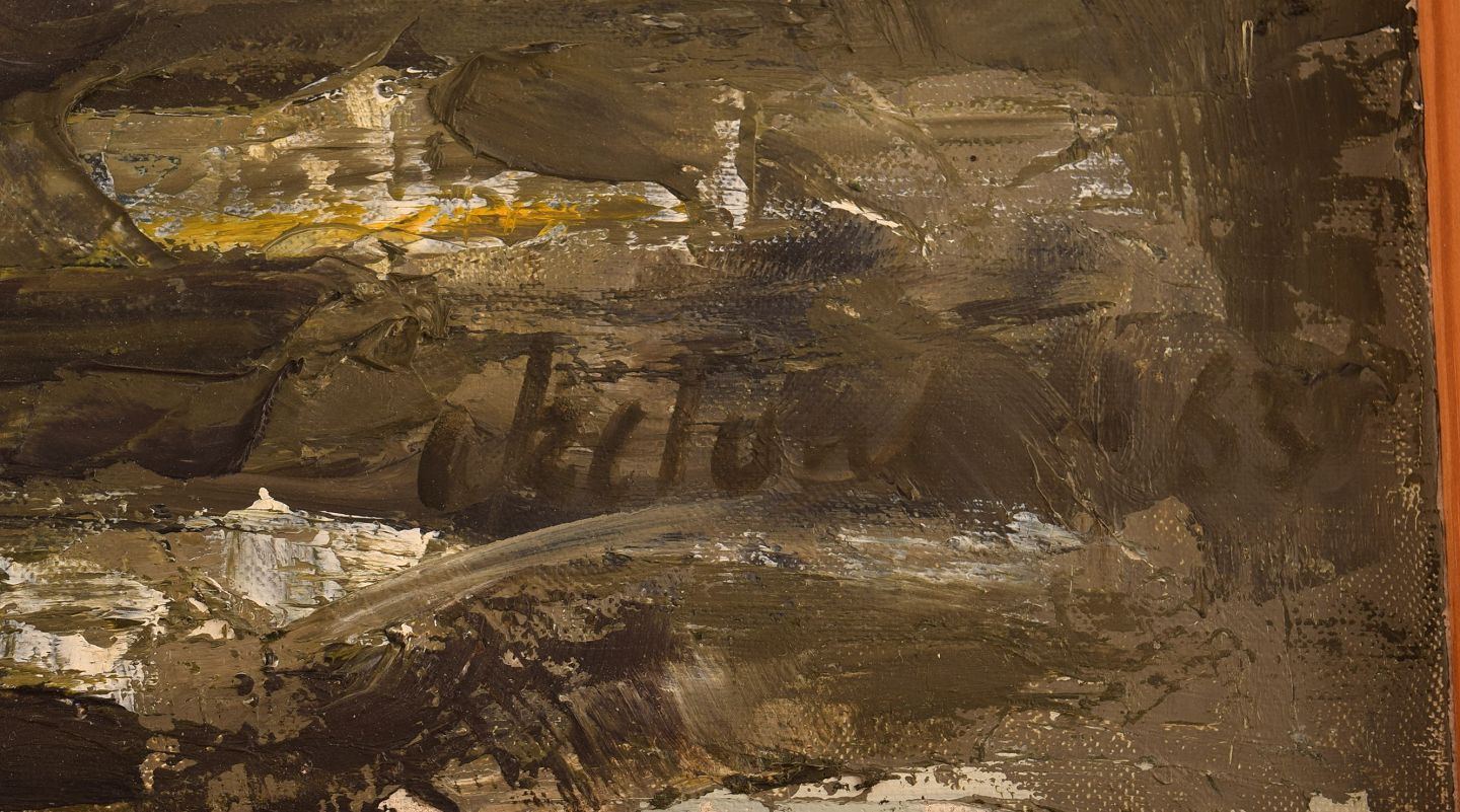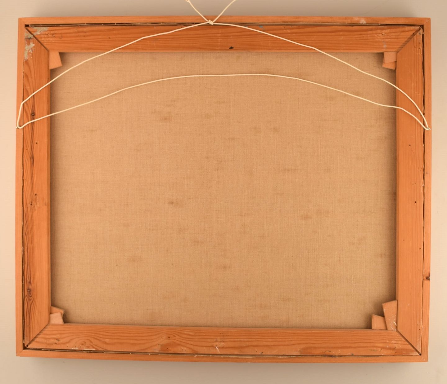 Poul Ekelund (1921-1976), Danmark. Olie på lærred. Modernistisk landskab med gule huse. Dateret 1965. Lærredet måler: 66 x 54 cm. Rammen måler: 2,5 cm. I flot stand. Signeret.