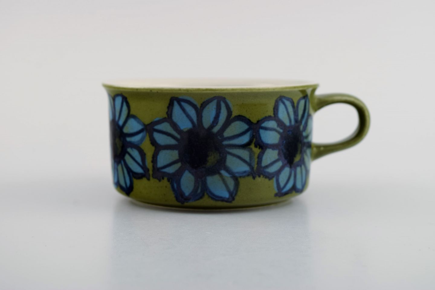 Hilkka-Liisa Ahola (1920-2009) for Arabia. Seks retro tekopper med underkopper i glaseret stentøj. 1960'erne.