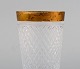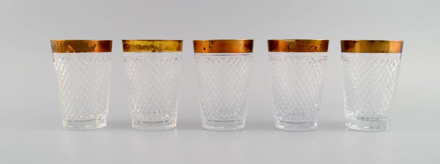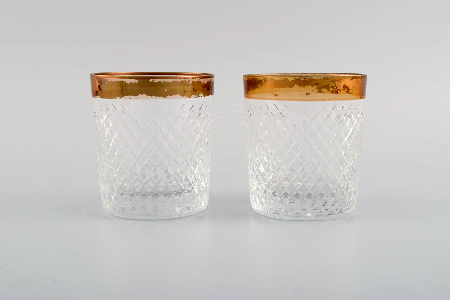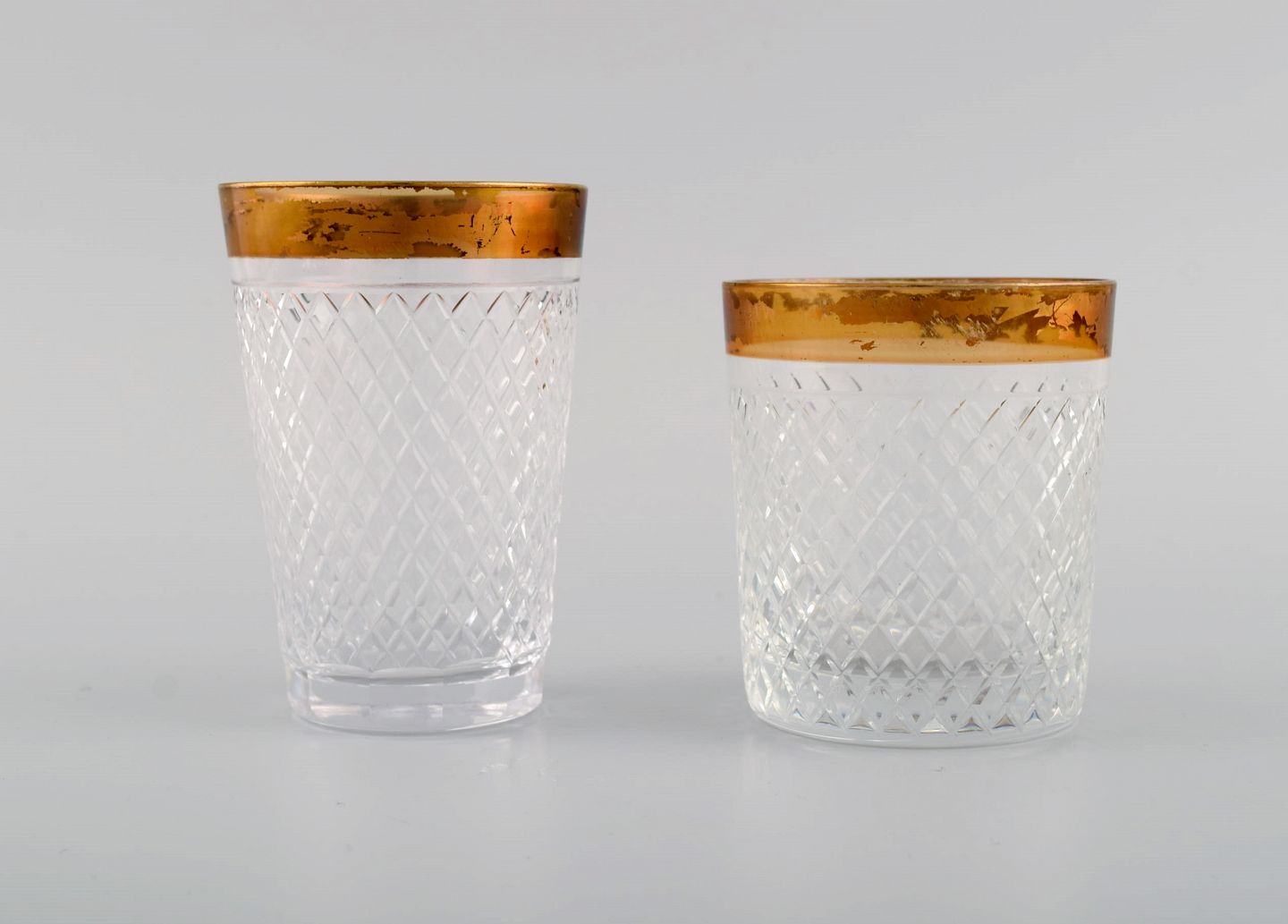 Syv drikkeglas i mundblæst krystalglas med guldkant. Frankrig, 1930'erne. Mindste måler: 9 x 8 cm. Største måler: 10,7 x 7,5 cm. I flot stand med slid på guldkanten.