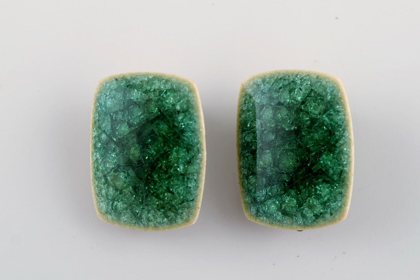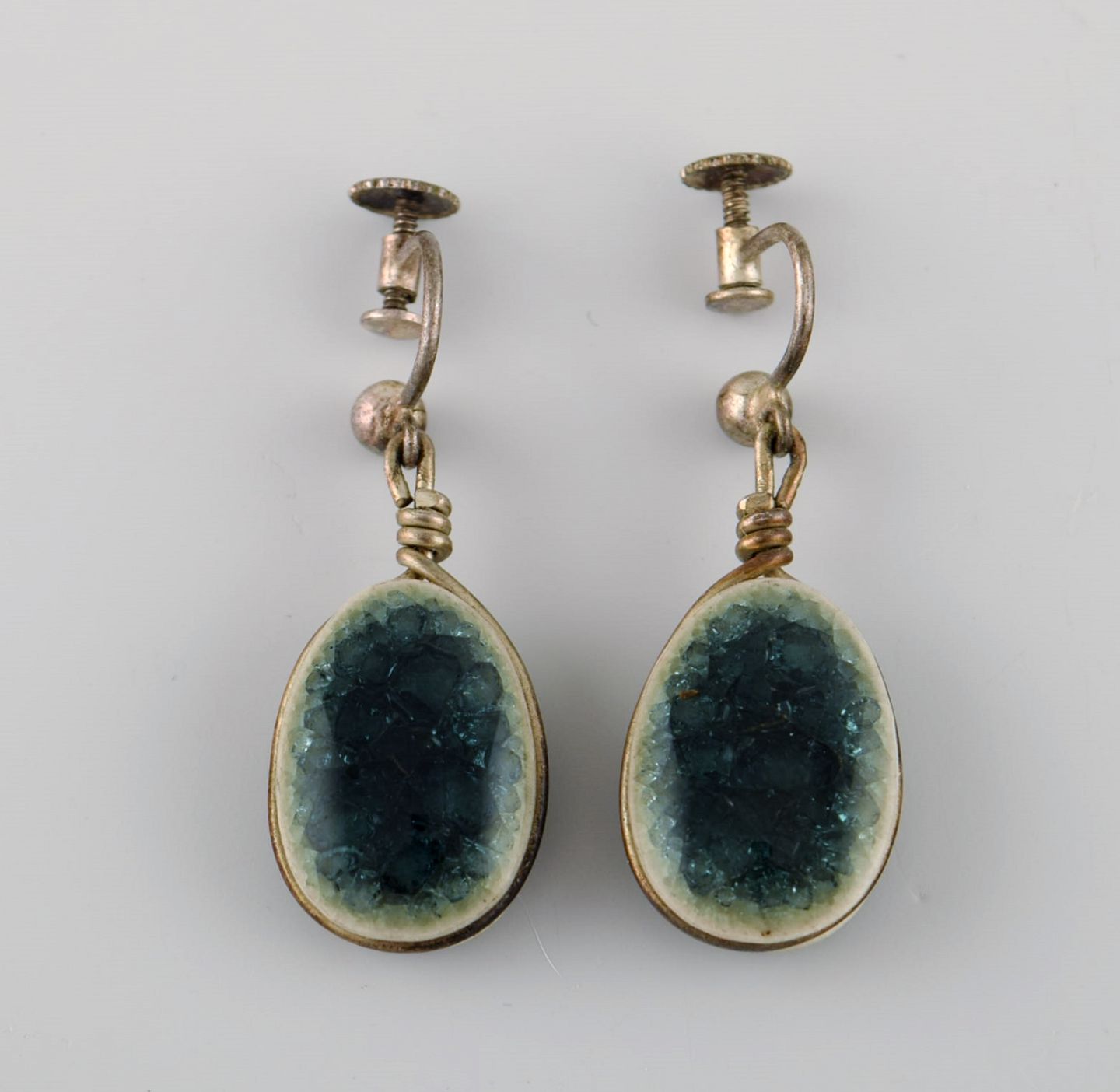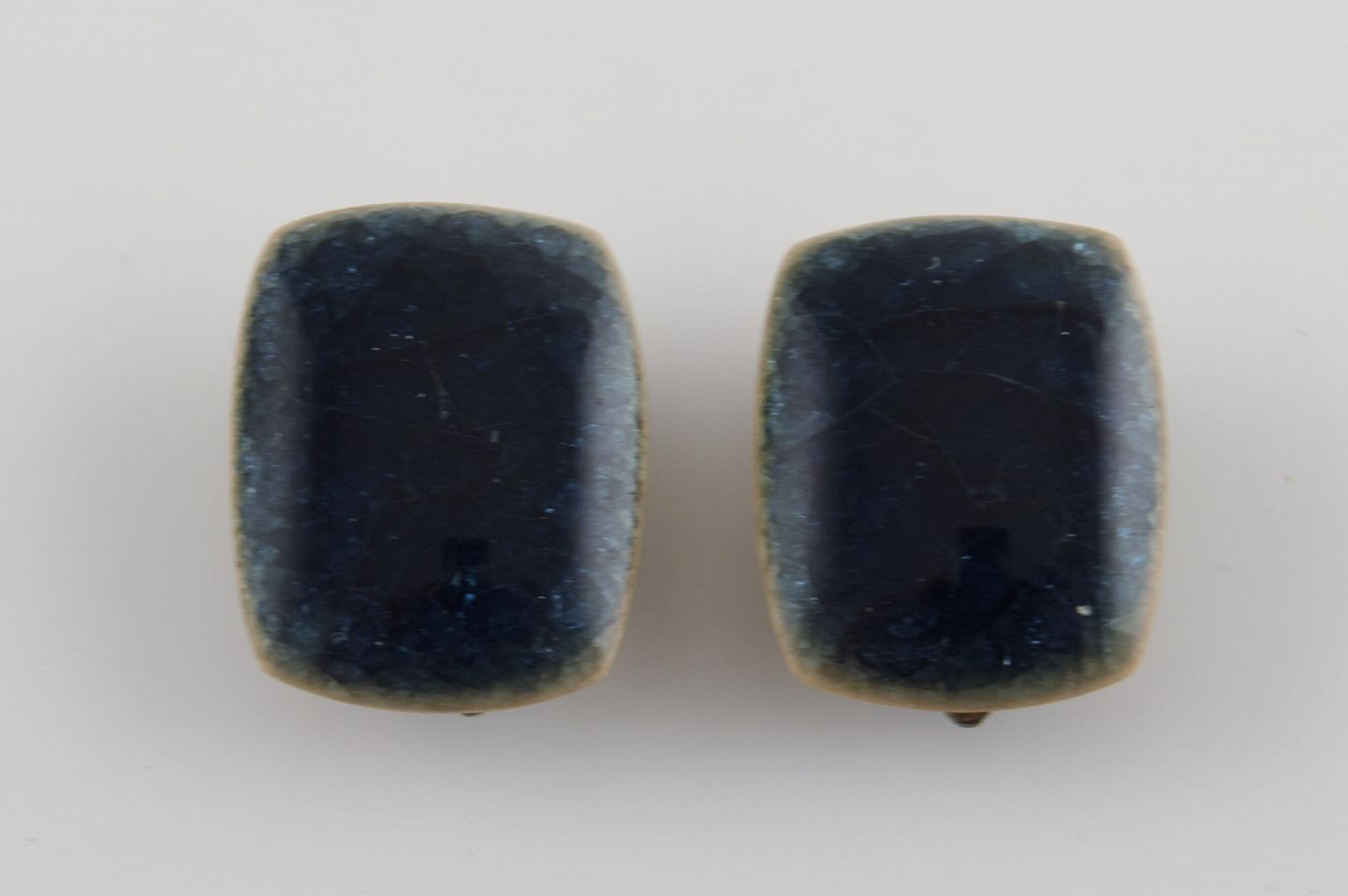 Ole Bjørn Krüger (1922-2007), dansk billedhugger og keramiker. Tre par unika øreclips i glaseret stentøj. Smuk glasur i blå og grønne toner. 1960/70'erne.