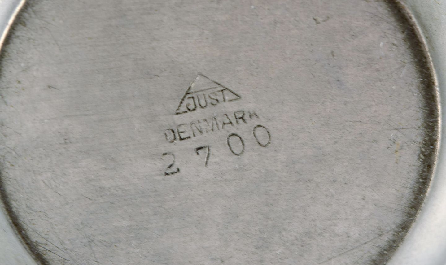 Just Andersen. To lysestager, otte flaskebakker og et krus i tin. 1930/40'erne. I god stand med brugspræg. Største lysestage måler: 8,5 x 8 cm. Koppen måler: 7 x 6 cm. Stemplet. Modelnummer: 2700, m.fl.