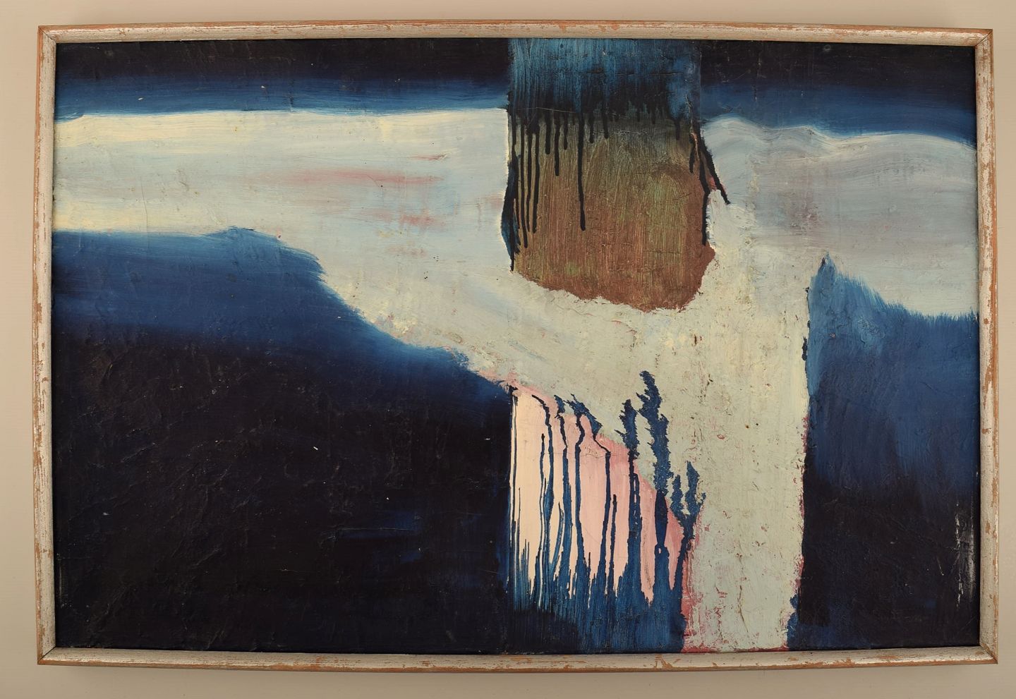 Svensk kunstner. Olie på lærred. Abstrakt komposition. 1960'erne. Lærredet måler: 63,5 x 41,5 cm. Rammen måler: 1,5 cm. I flot stand. Usigneret.