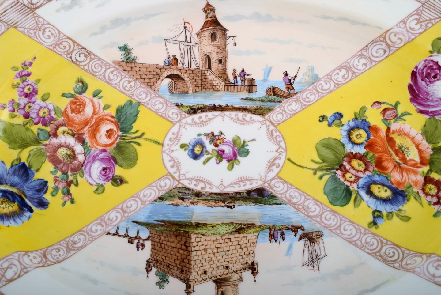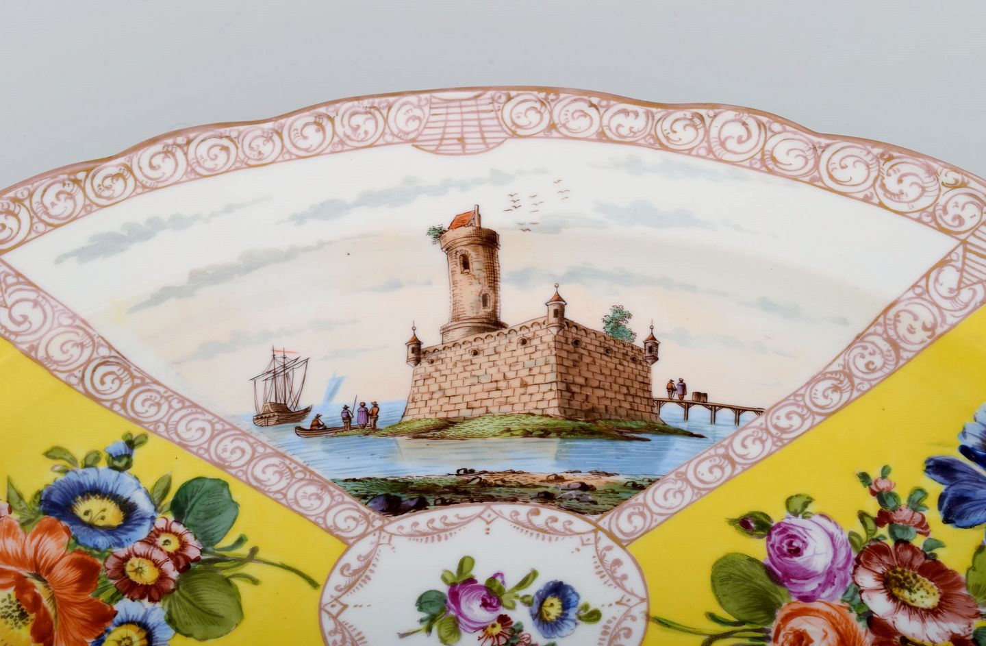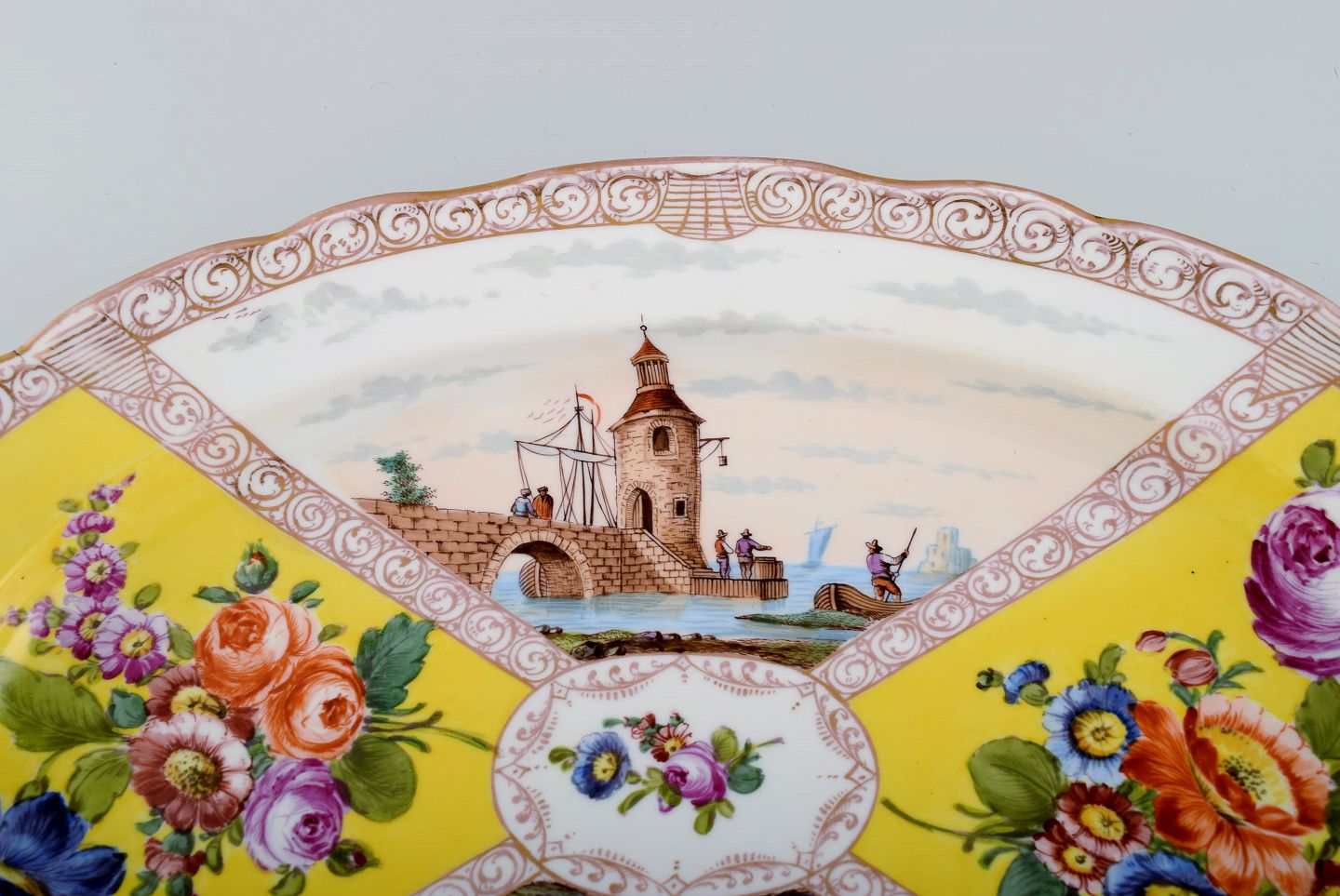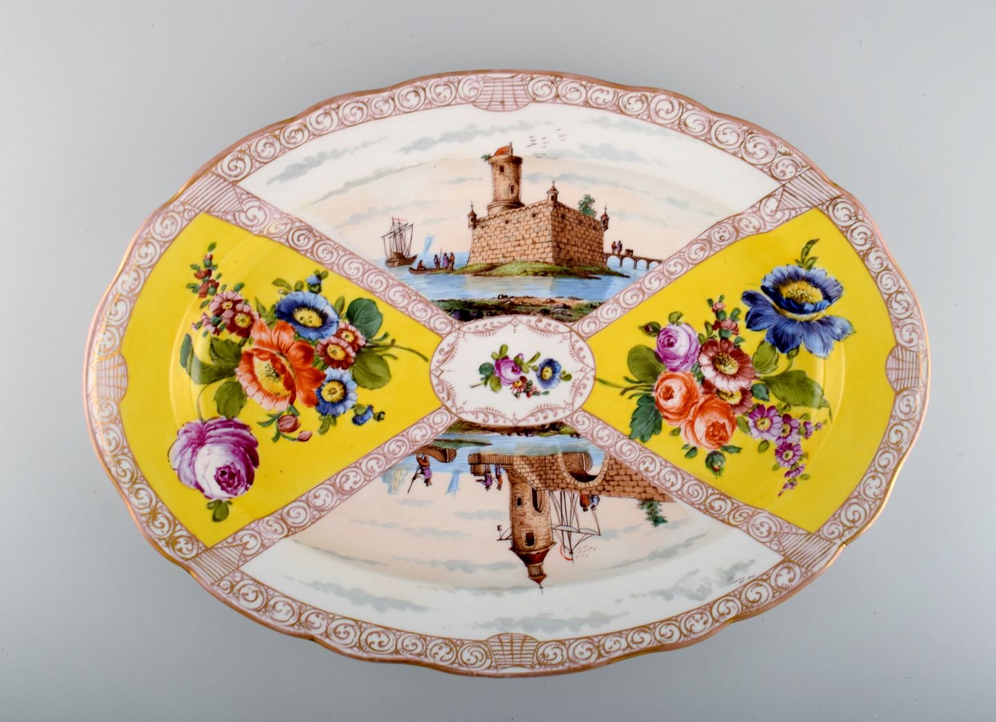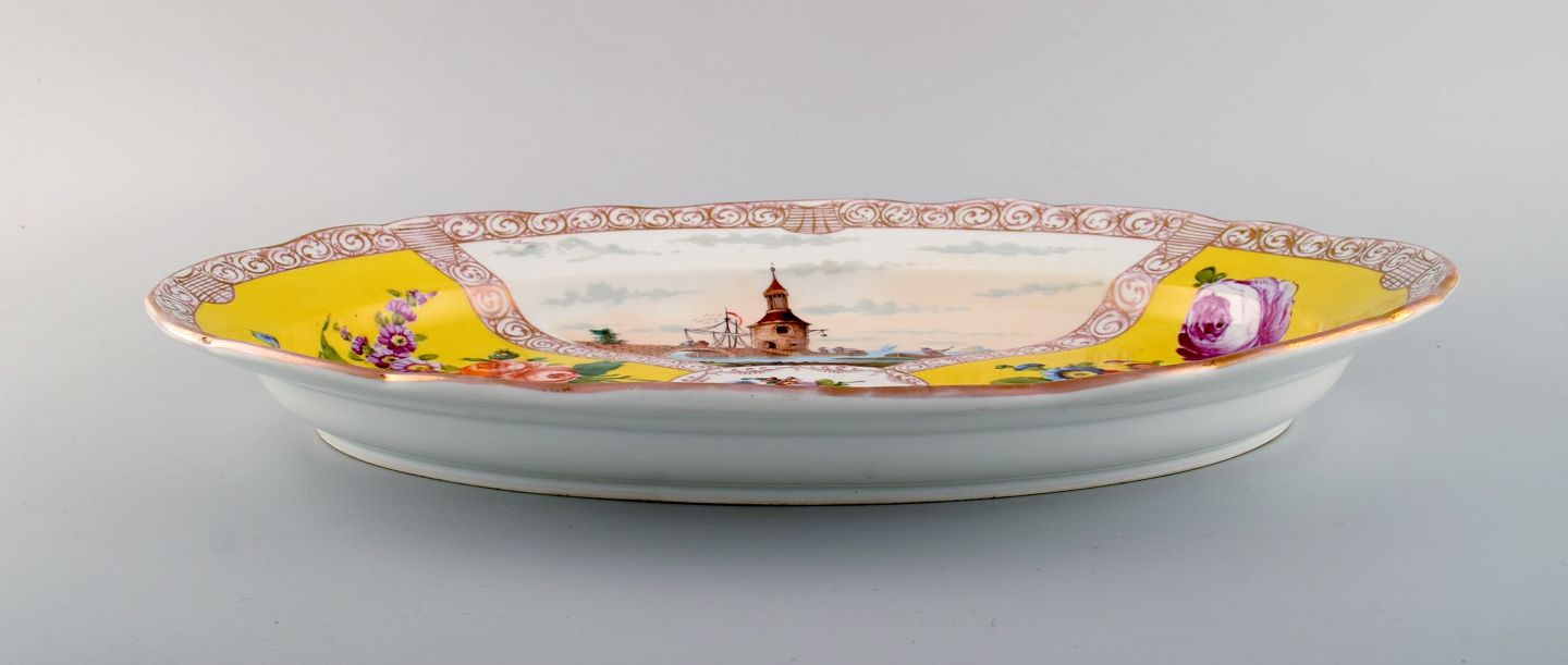 Stort antikt Meissen serveringsfad i håndmalet porcelæn med handelsstationer og blomster. 1800-tallet.
