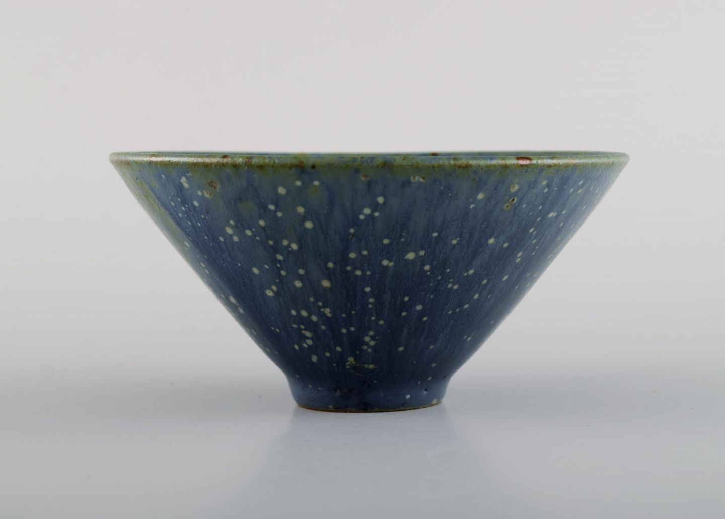 Arne Bang (1901-1983), Danmark. Skål i glaseret keramik. Modelnummer 146. Smuk spættet glasur i blå og grå nuancer. 1940/50'erne.