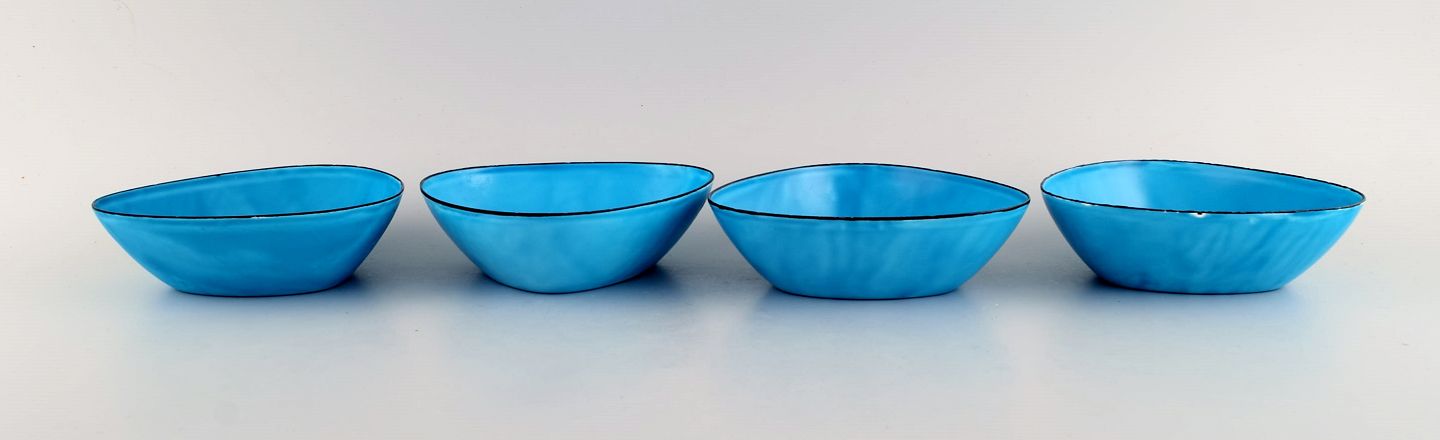 Kockum, Sverige. Fire skåle i turkis emalje. 1970'erne. Måler: 15 x 4,8 cm. I flot stand med brugspræg. Stemplet.