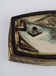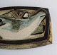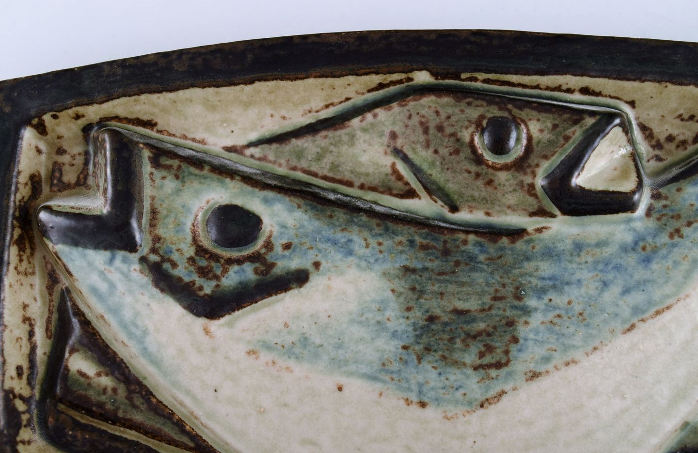 Jørgen Mogensen for Royal Copenhagen. Vægplakette i i glaseret stentøj med fisk i relief. Dateret 1967. Måler: 26 x 16 cm. I flot stand. Signeret og stemplet.