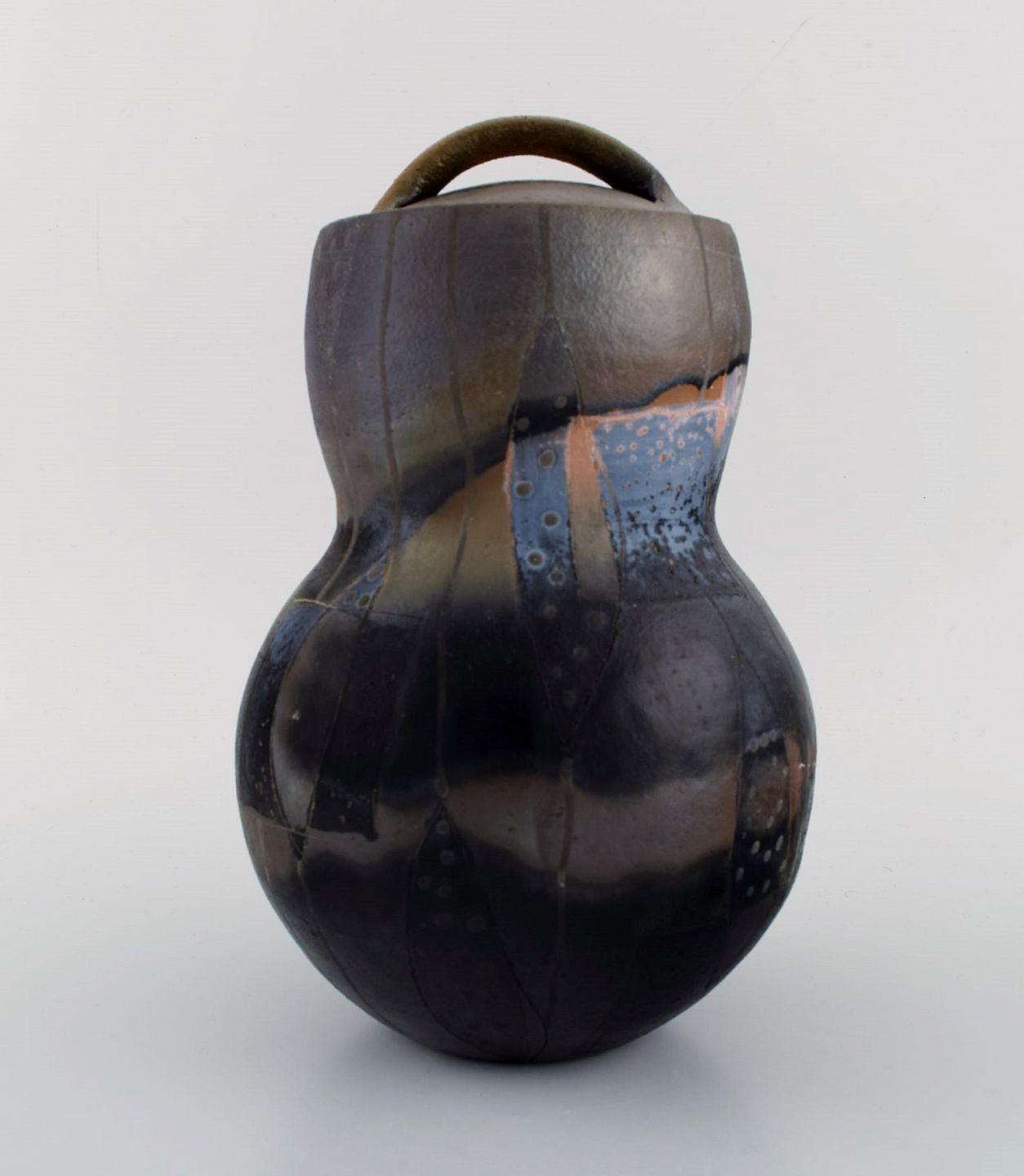 Europæisk studiokeramiker. Stor unika lågkrukke i glaseret stentøj. Sent 1900-tallet. Måler: 26 x 16,5 mm. I flot stand. Signeret.