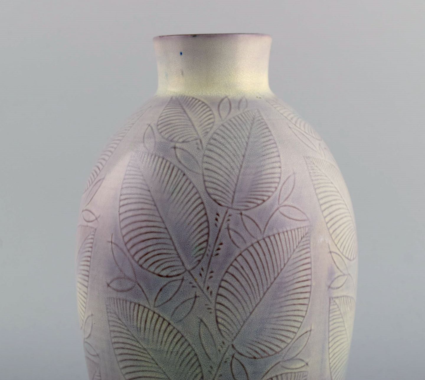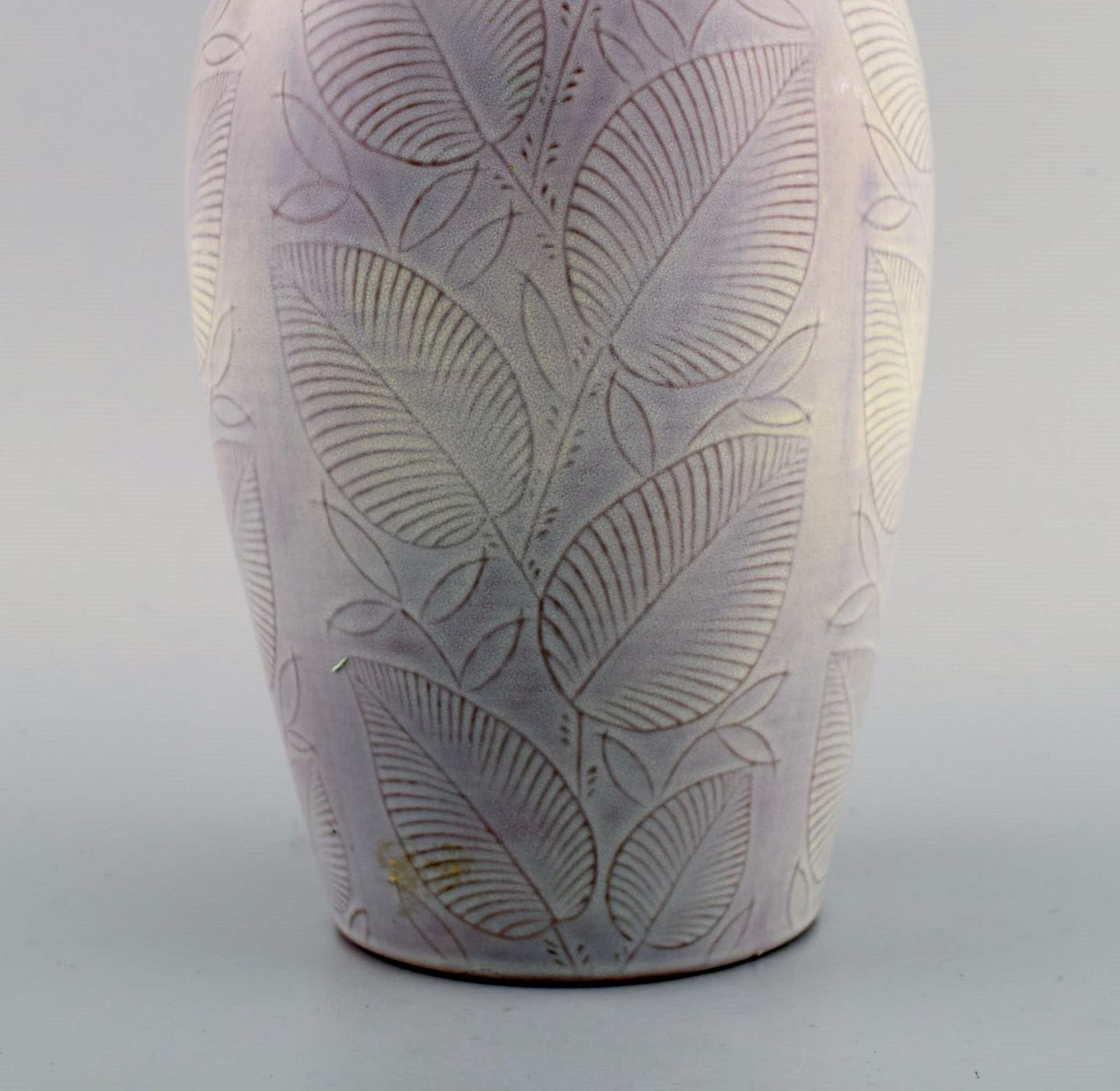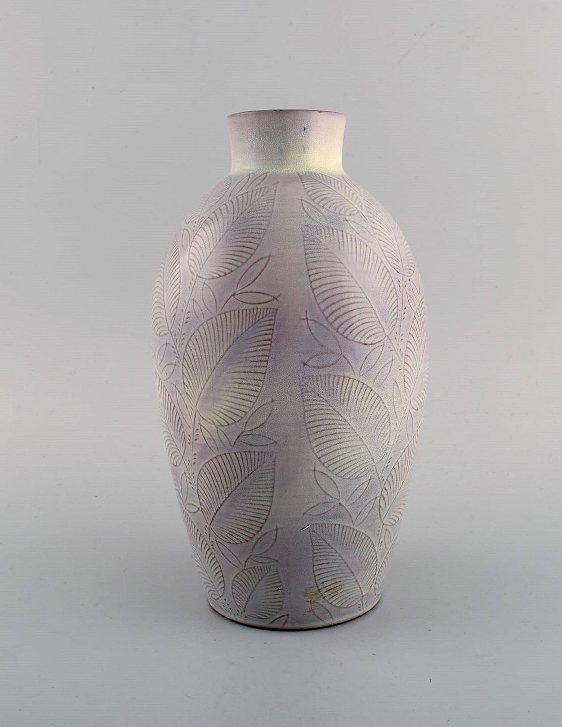 Nils Thorsson for Royal Copenhagen. Vase in glazed ceramics with leaf decoration. Dated 1944. Measures: 24 x 13 cm. In excellent condition. Stamped. 1st factory quality.