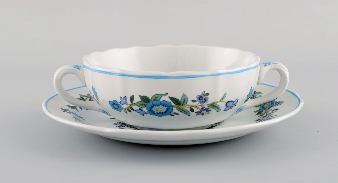 Spode, England. Fem Mulberry boullionkopper med underkopper i håndmalet porcelæn med blomster- og fuglemotiver. 1960/70'erne.