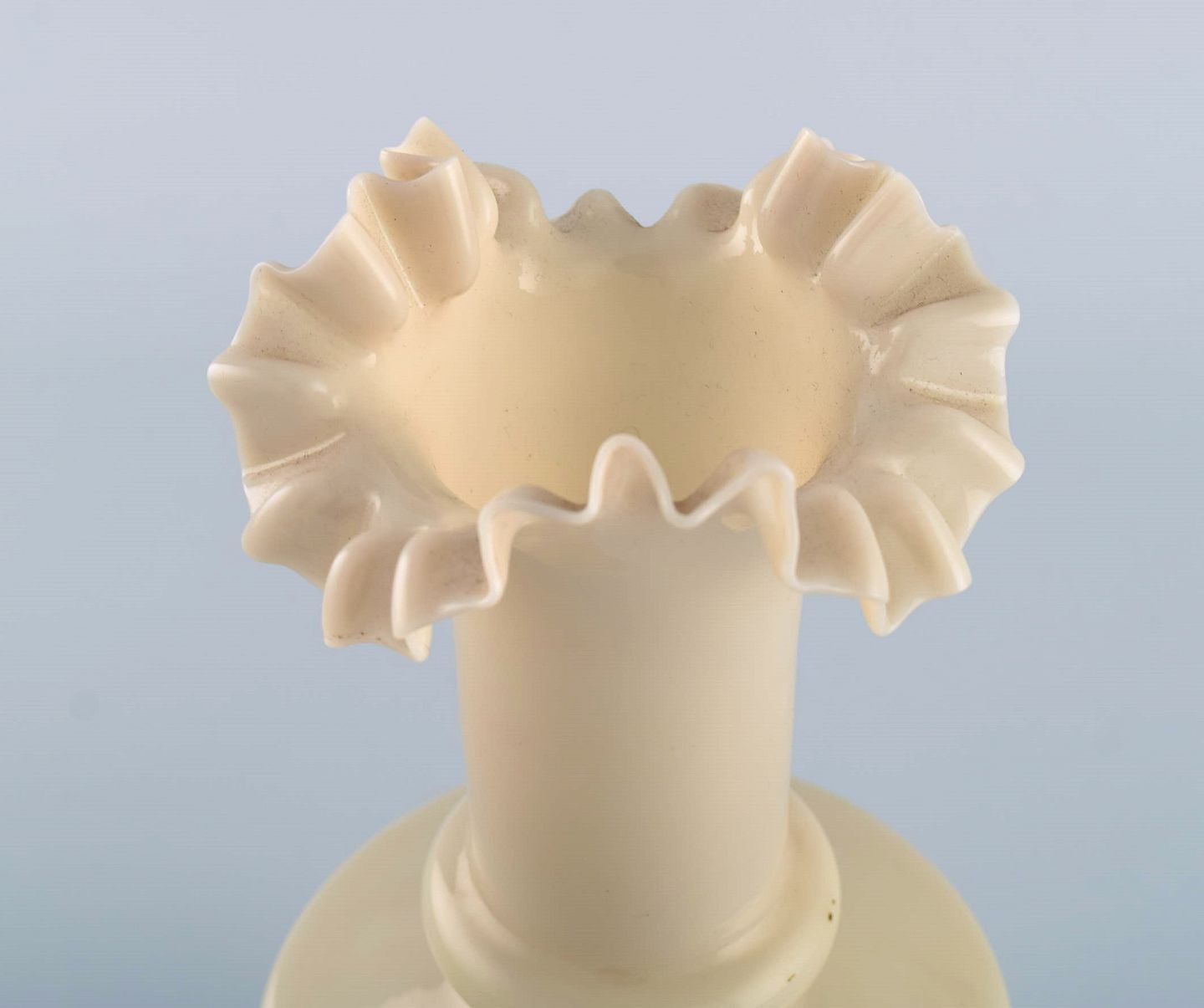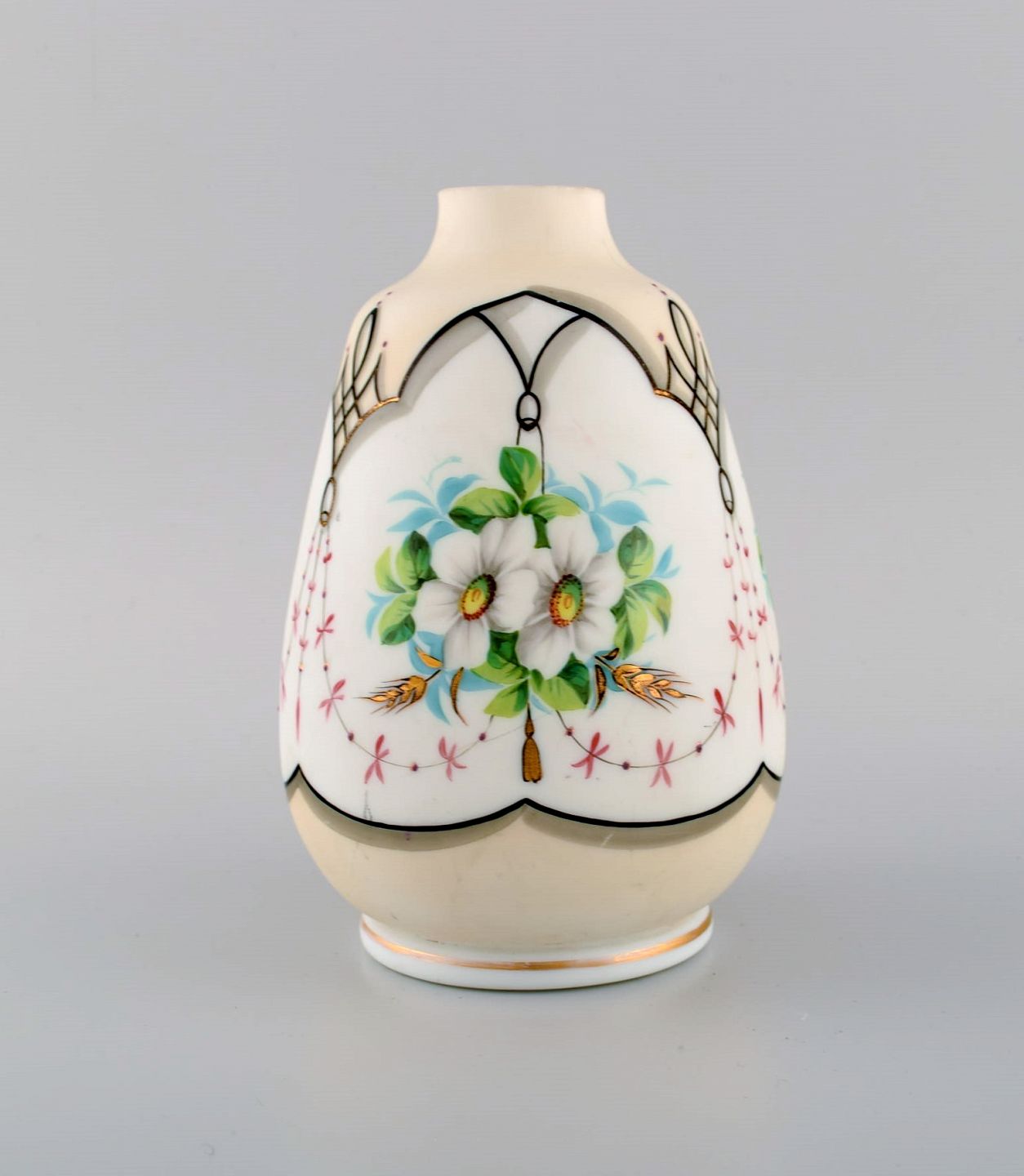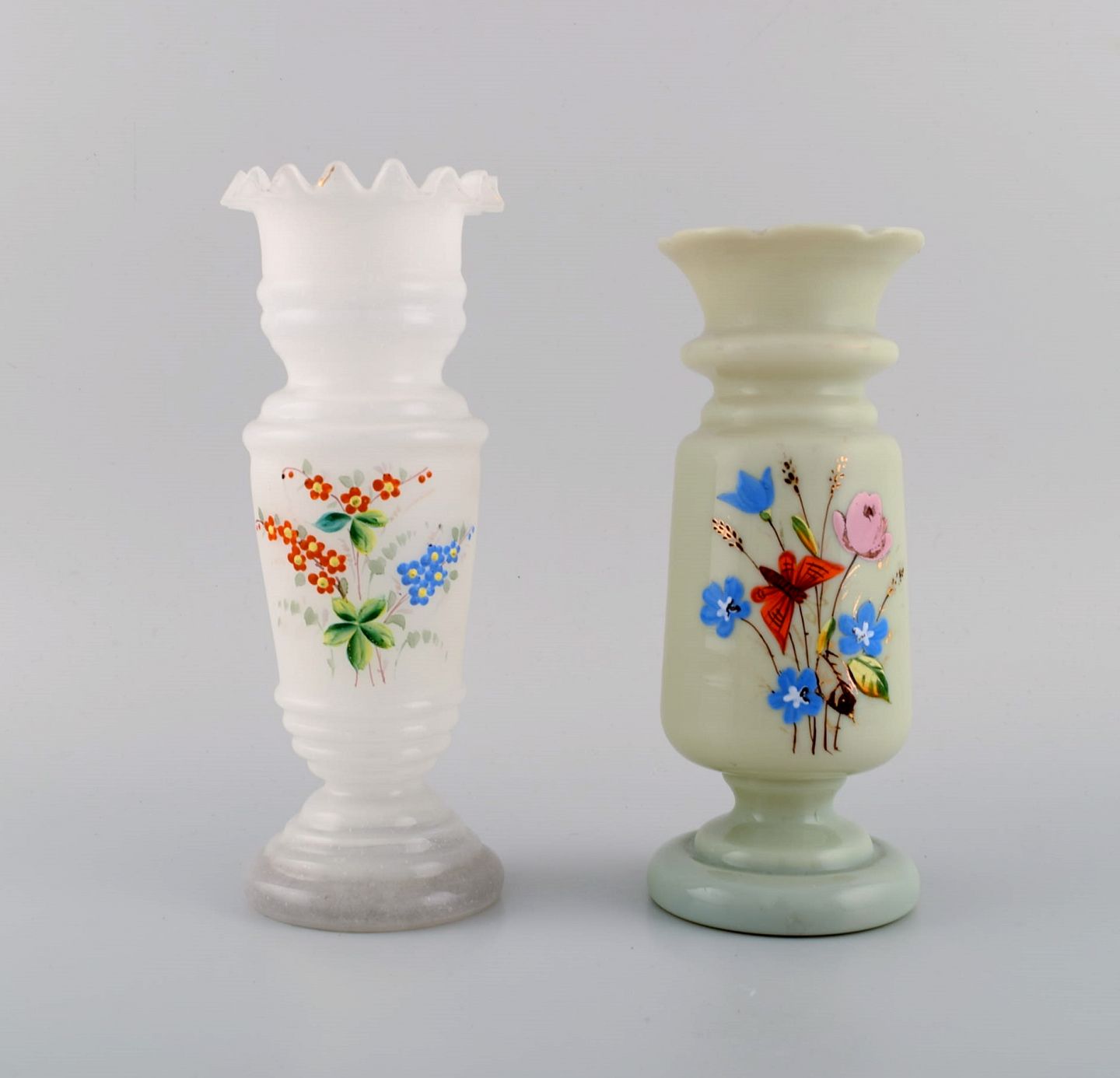 Fire antikke vaser i håndmalet mundblæst opalineglas. Ca. 1900. Største måler: 25,5 x 12,5 cm. I flot stand.