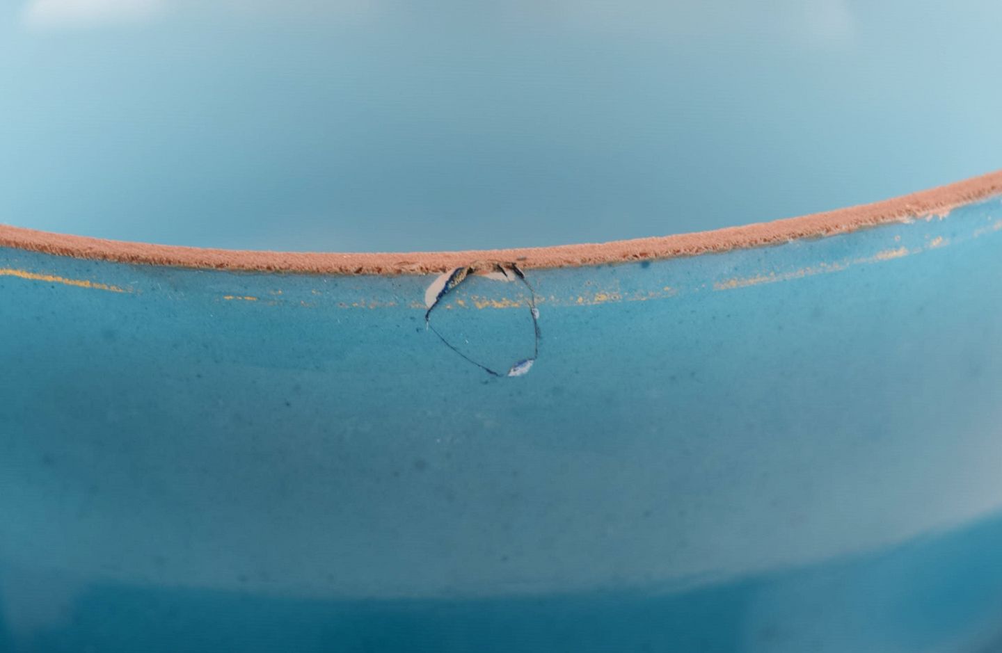 Antik vase i mundblæst opalineglas med håndmalede blomster og bladværk på blå baggrund. Ca. 1900. Måler: 32 x 16,5 cm. I flot stand. Lille skår.