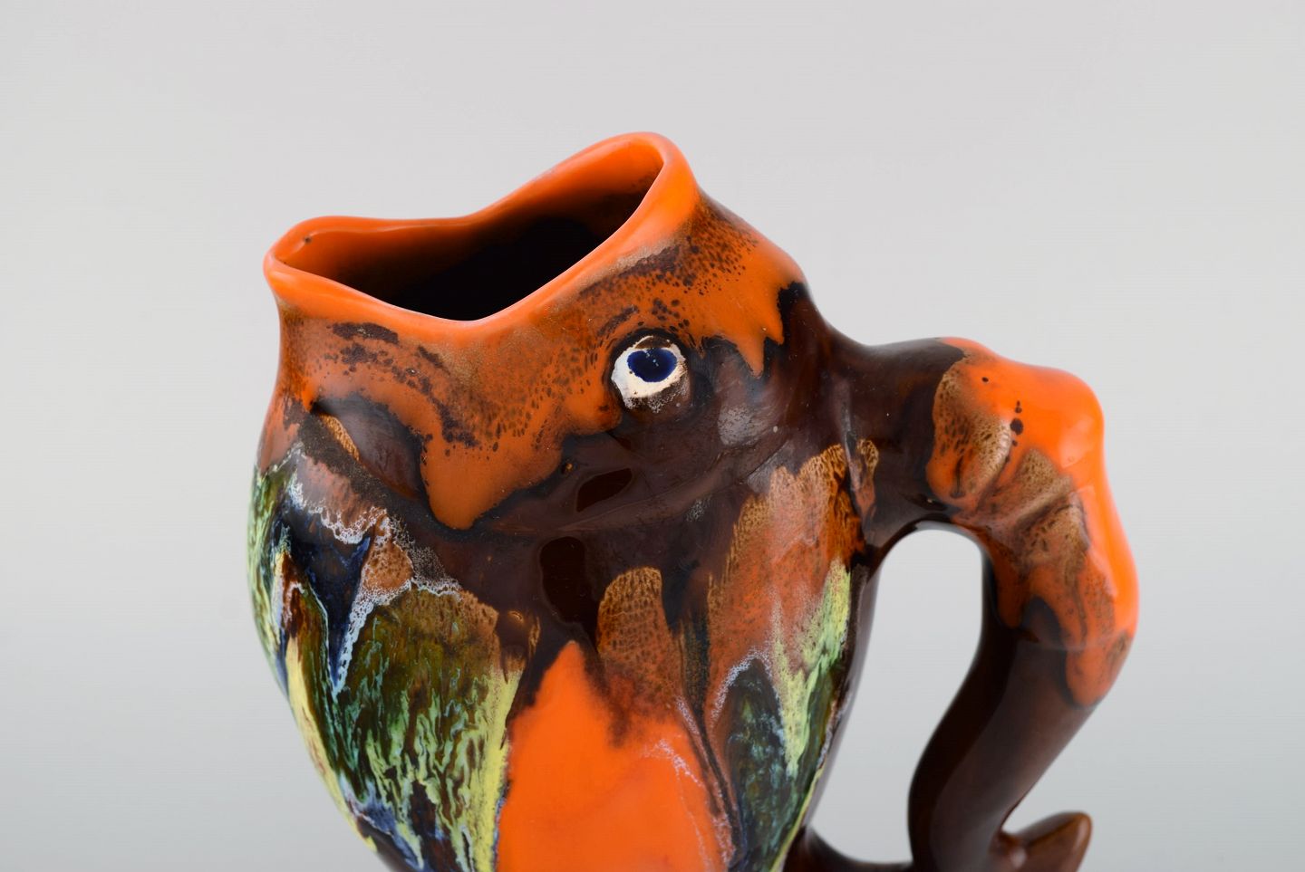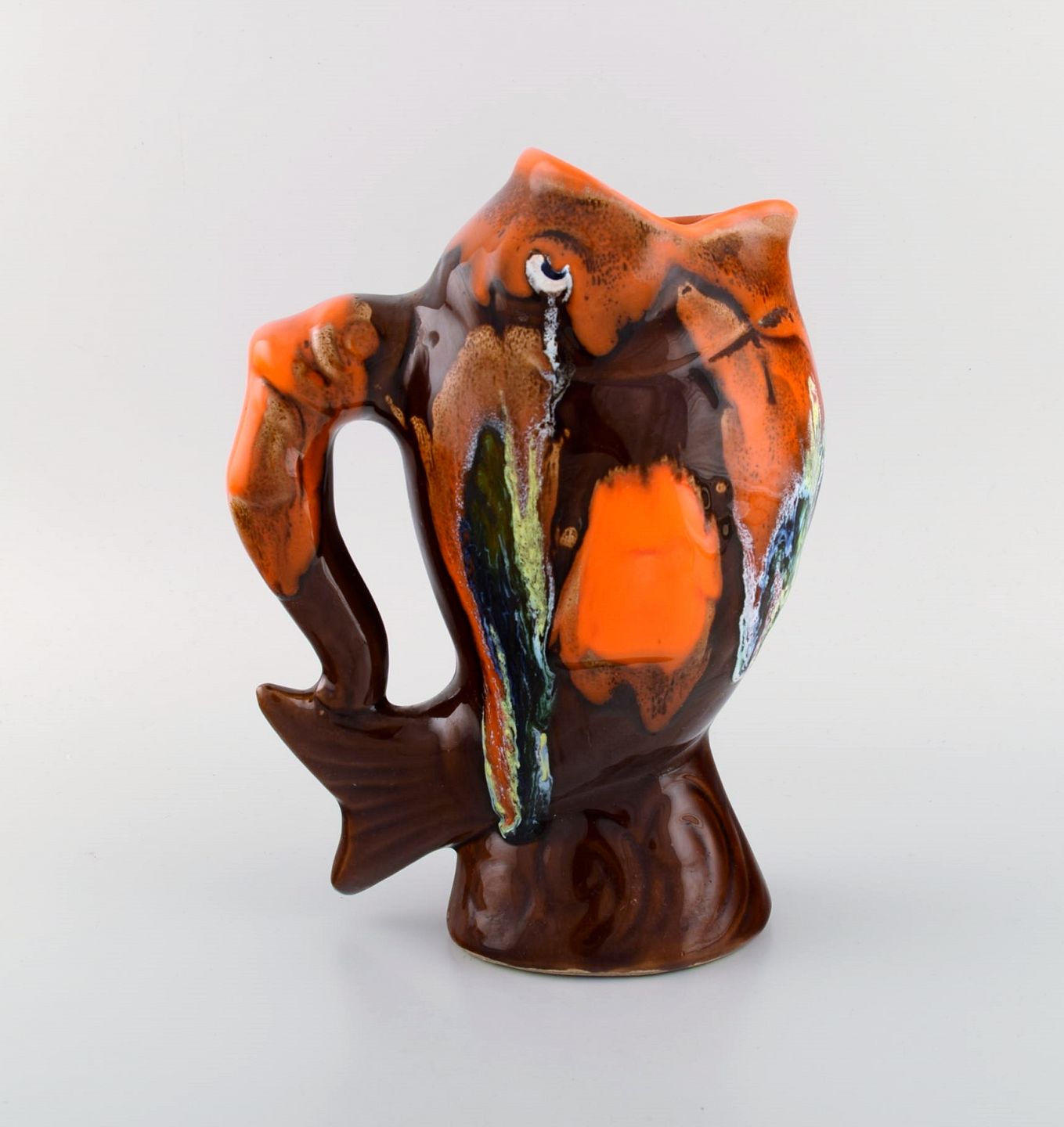 Belgisk studio keramiker. Retro kande i glaseret keramik udformet som fisk. Smuk glasur i brune og orange nuancer. 1960/70'erne.