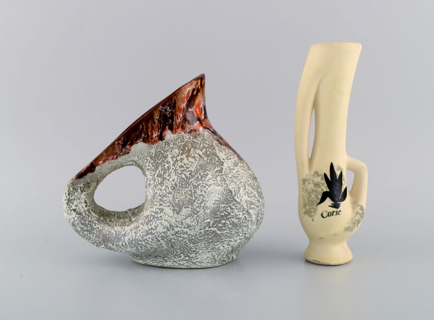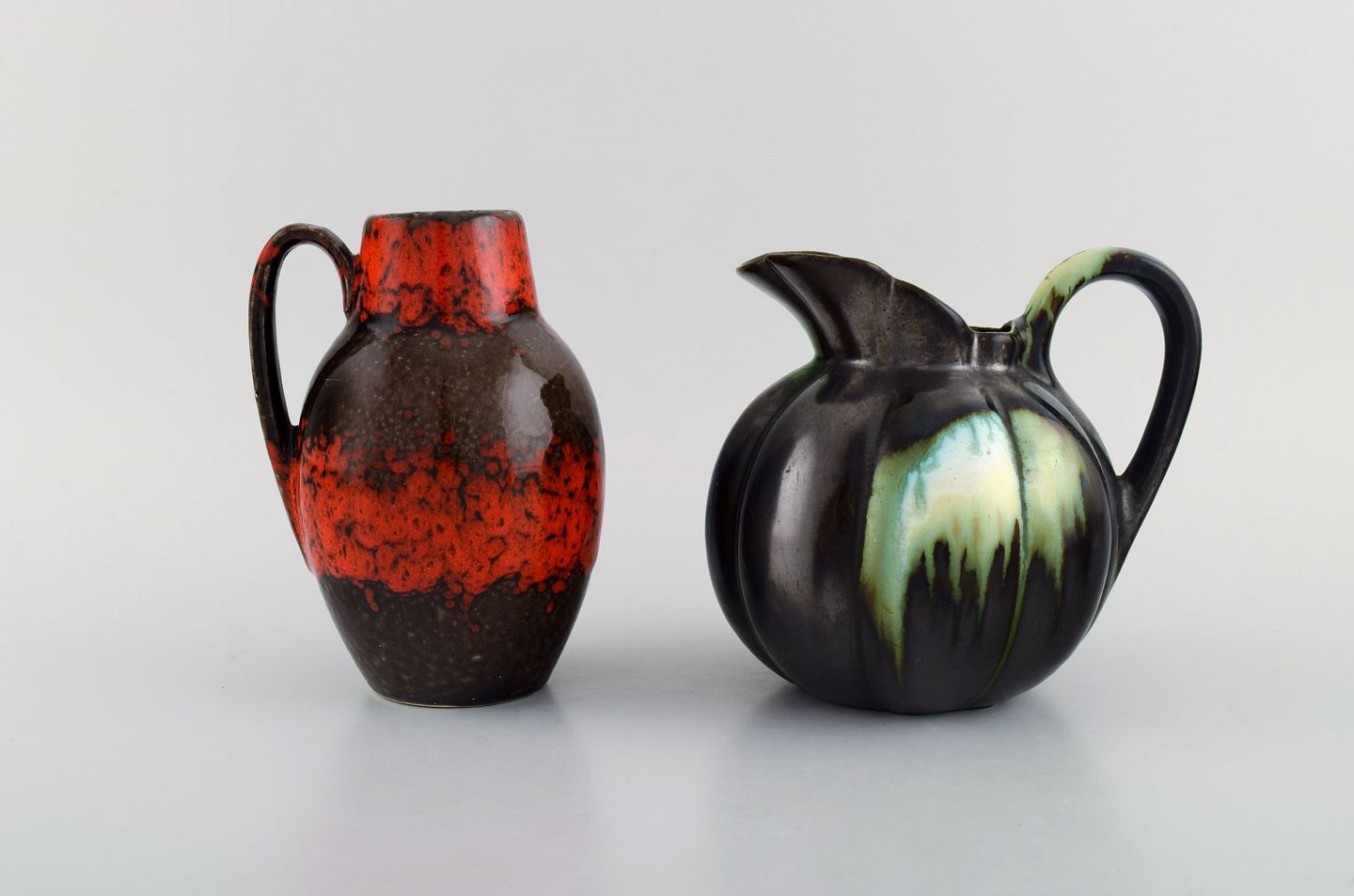Fem retro kander i glaseret keramik. Smukke glasurer og former. Belgien, 1960/70'erne. Største måler: 23,5 x 13 cm. I flot stand. Stemplet.