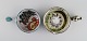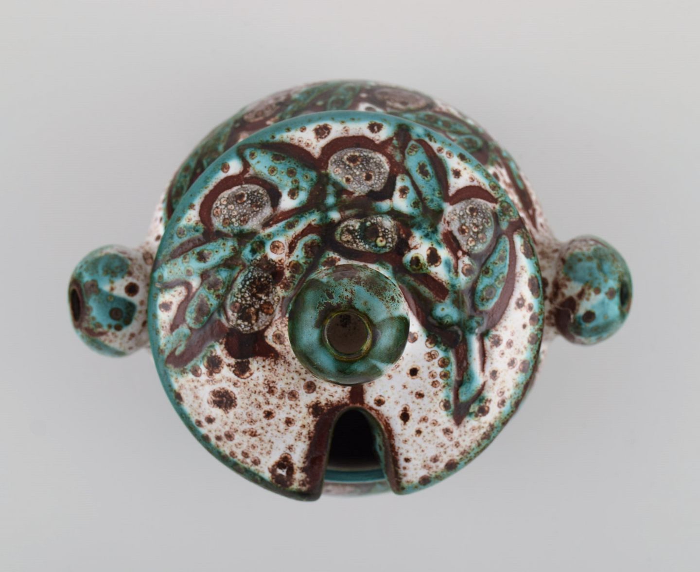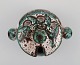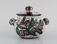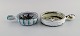 Skål, lågkrukke og tre crème brûlée skåle med hank i håndmalet glaseret stentøj. Belgien, 1960/70'erne.
