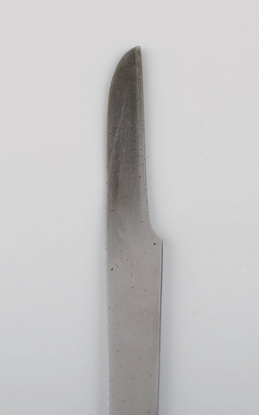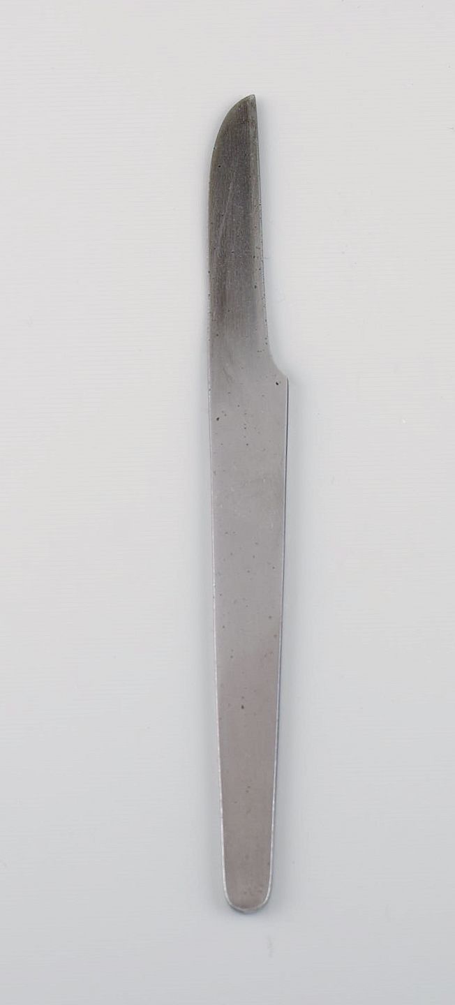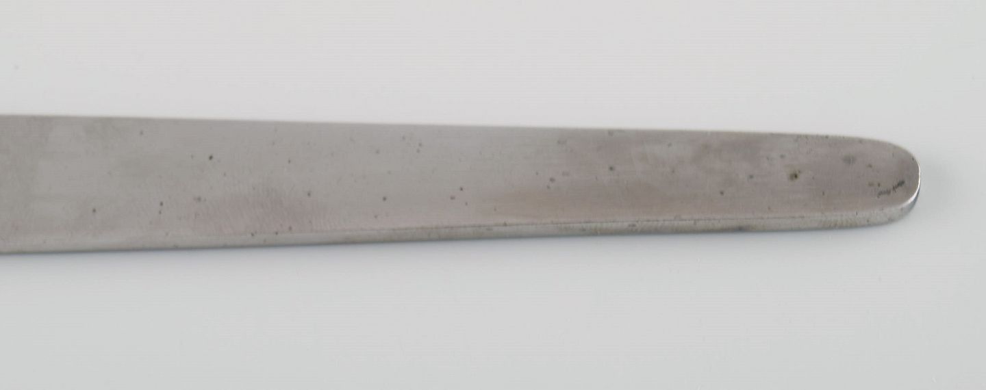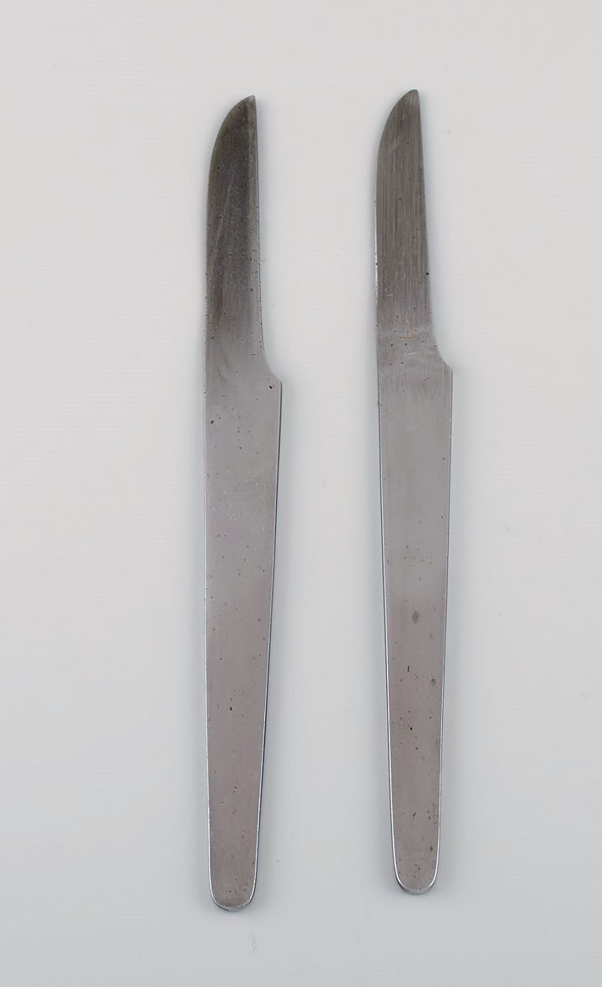 Arne Jacobsen for Georg Jensen. Modernistisk AJ bestik. To middagsknive i rustfrit stål. Sent 1900-tallet. Længde: 20 cm. I flot stand. Ustemplet.