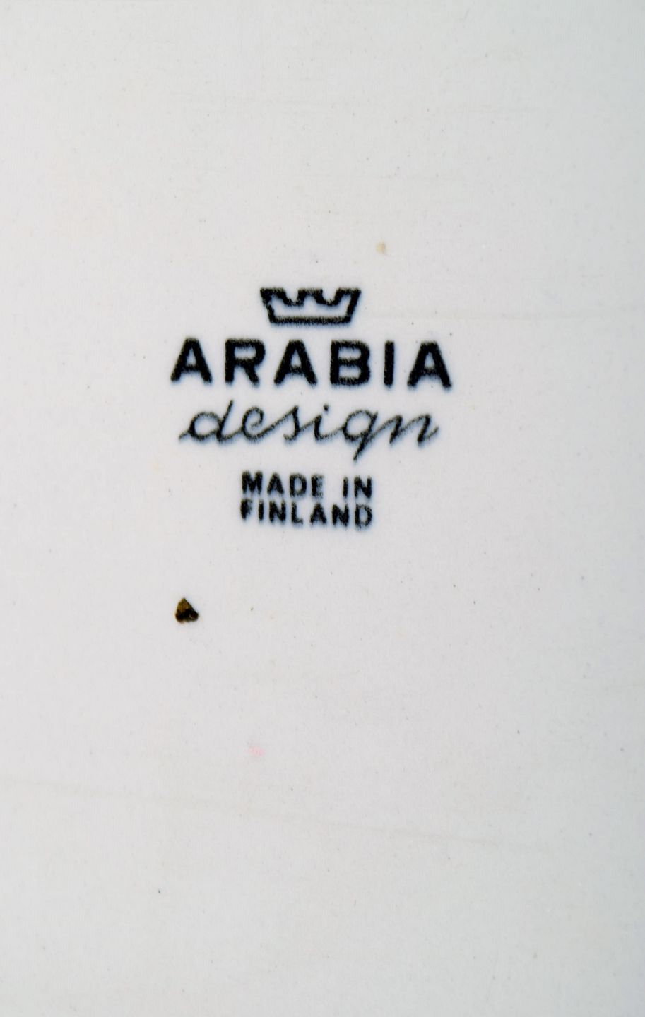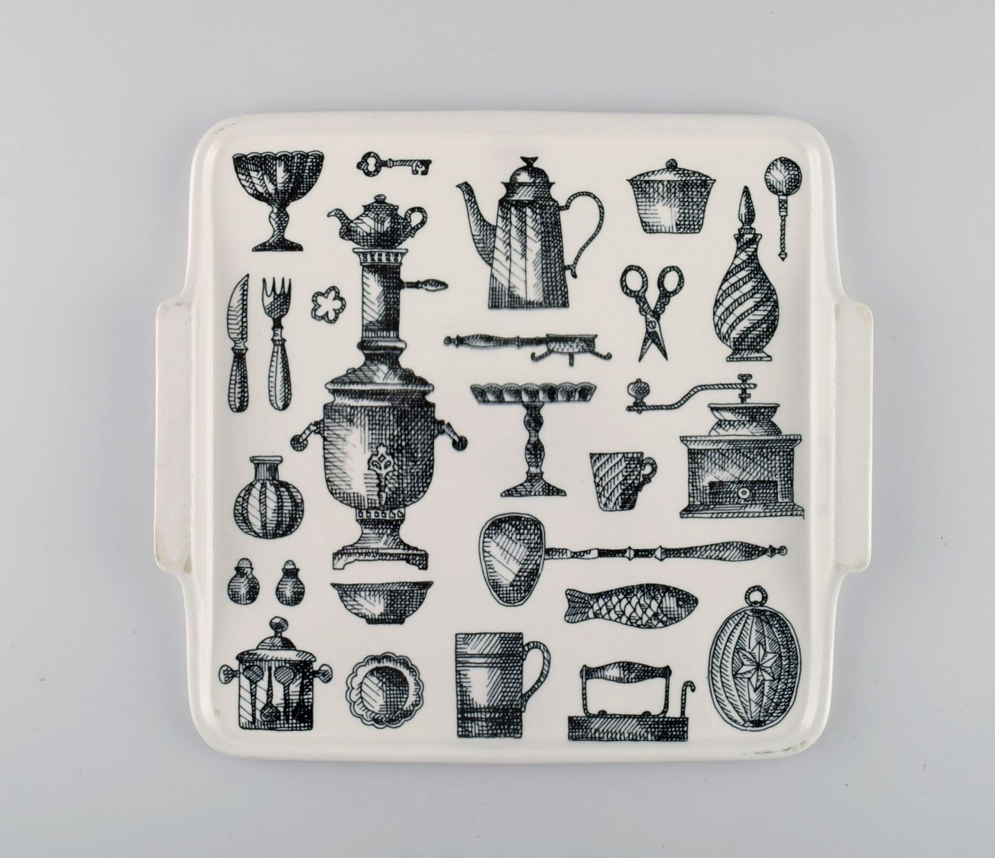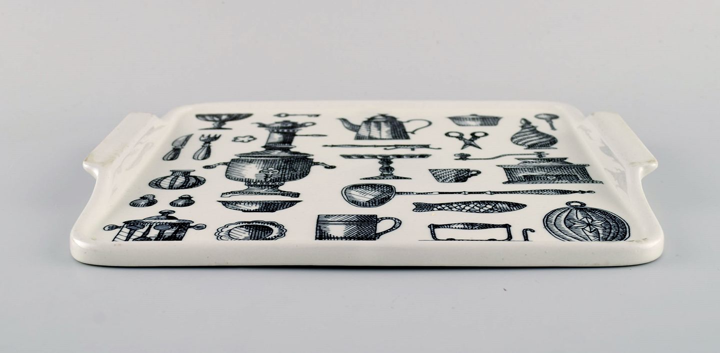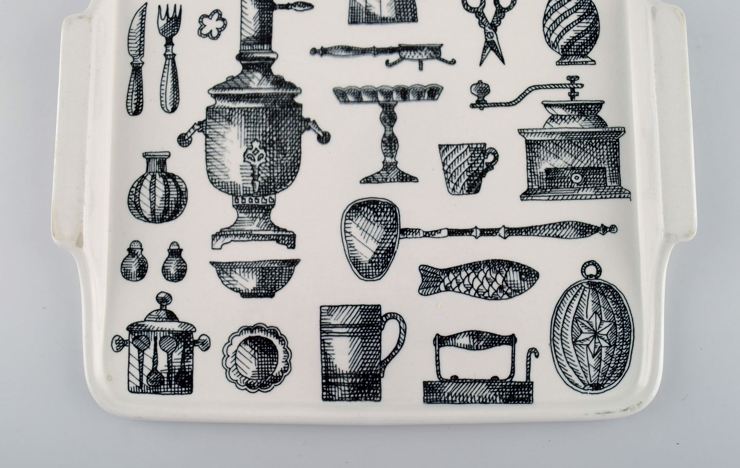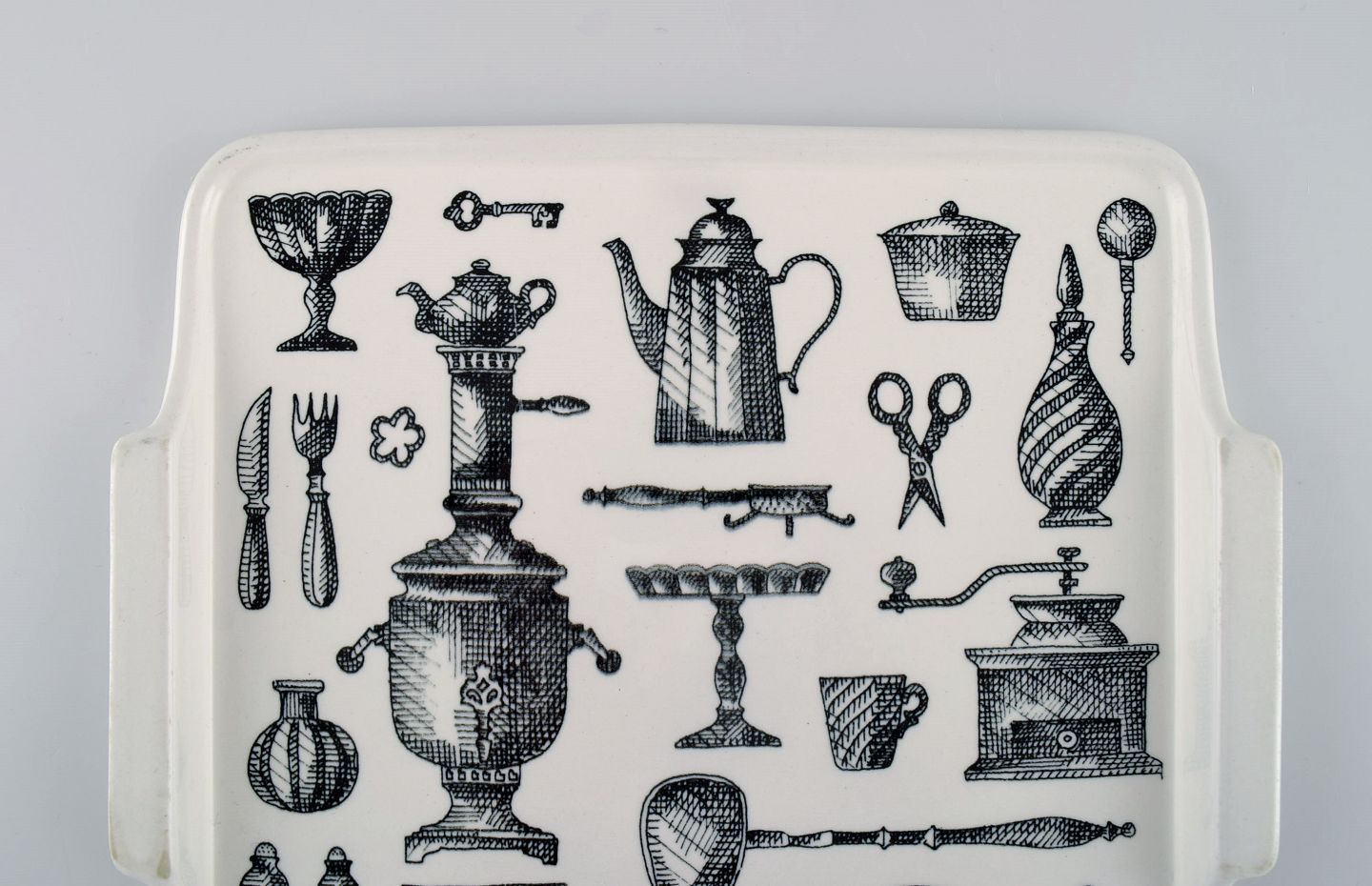 Arabia bakke i porcelæn dekoreret med køkkenredskaber. Finsk design, 1960/70'erne.