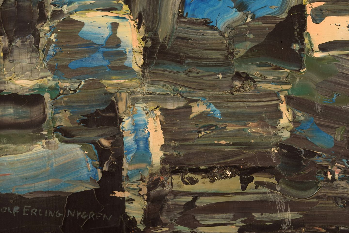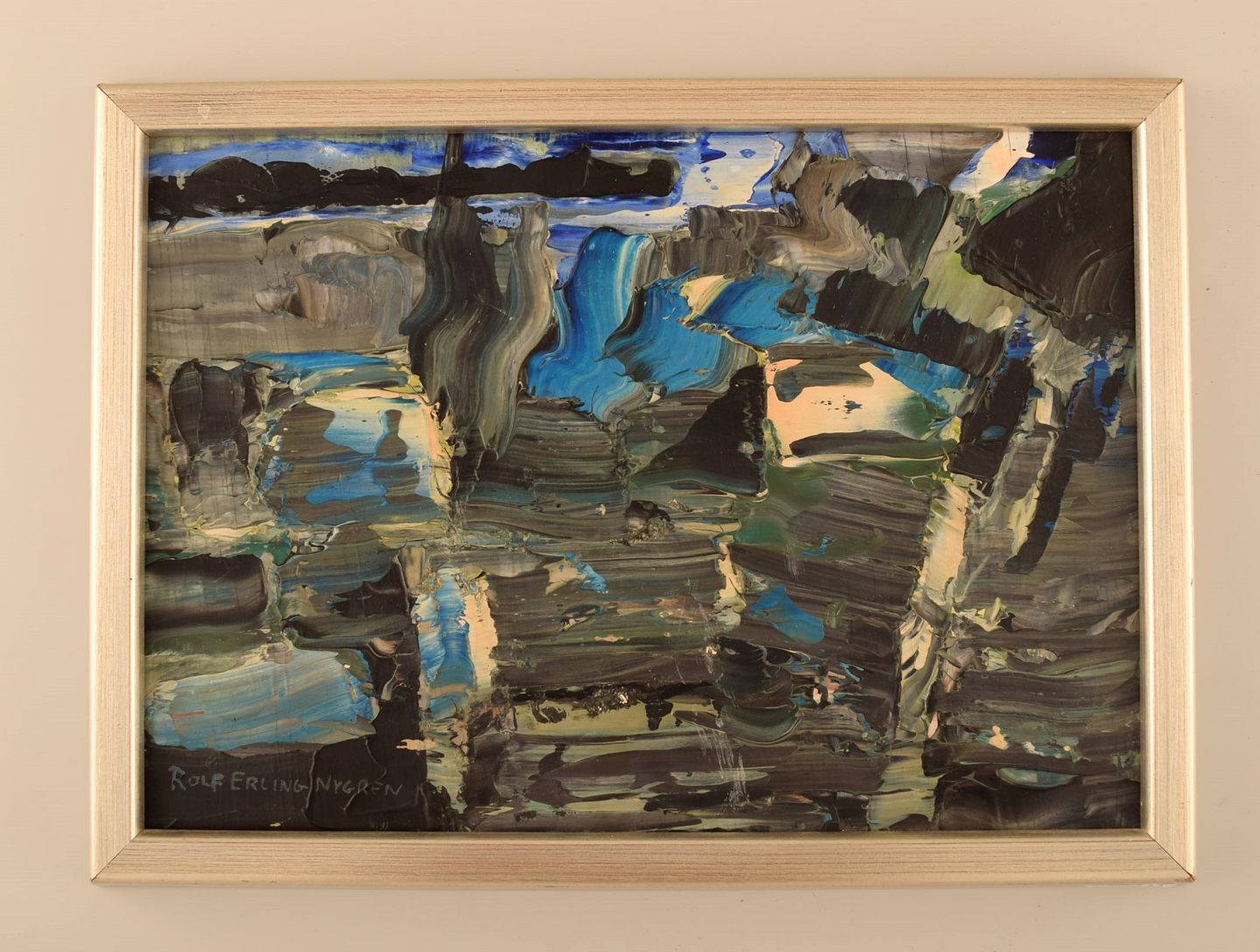 Rolf Erling Nygren (1925-2010), Sverige. Olie på lærred. Abstrakt komposition. 1960'erne. Lærredet måler: 27 x 19 cm. Rammen måler: 2 cm. I flot stand. Signeret.