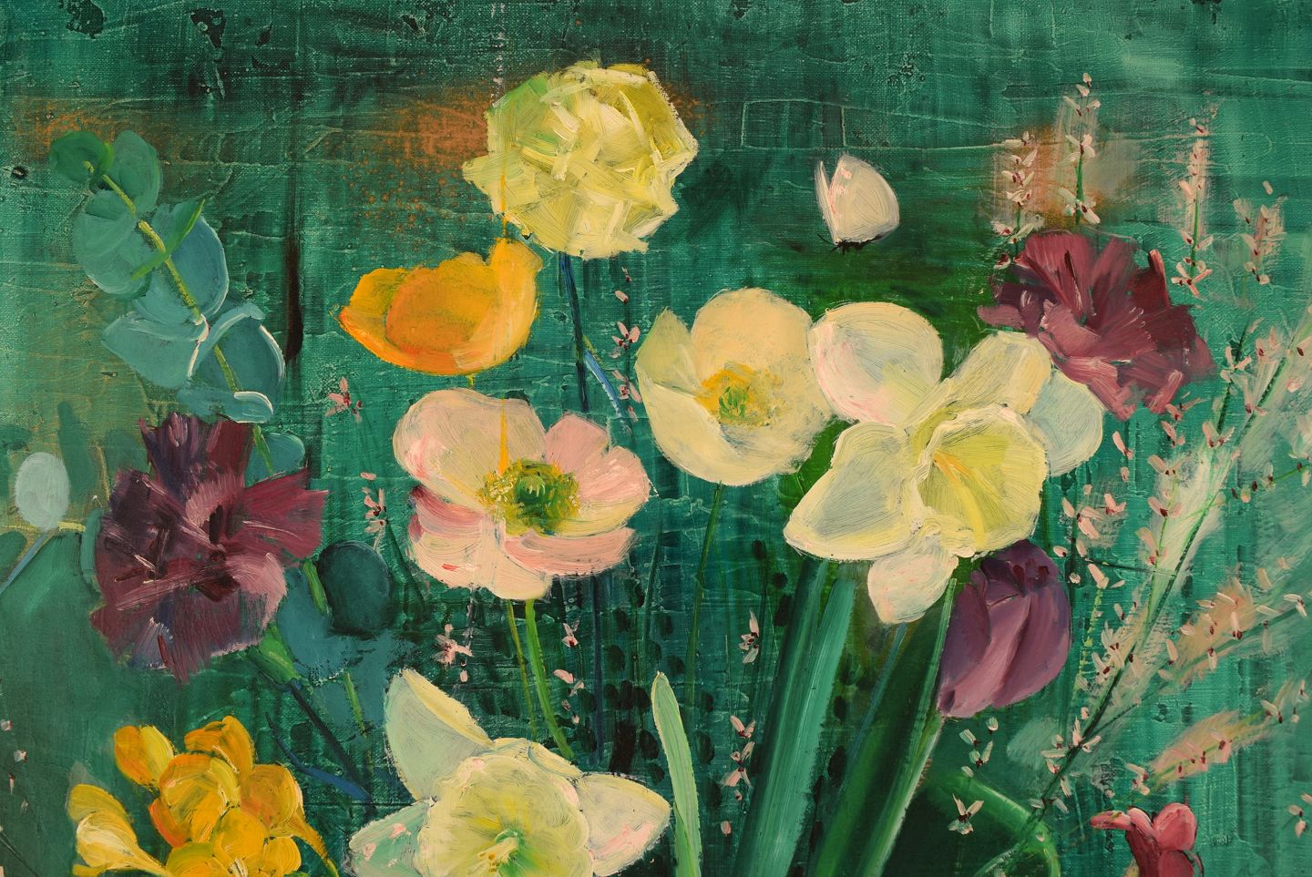 Hans Ripa (1912-2001), svensk kunstner. Olie på lærred. Opstilling med blomster. 1970'erne. Lærredet måler: 72 x 59 cm. Rammen måler: 6 cm. Signeret og dateret. I flot stand.