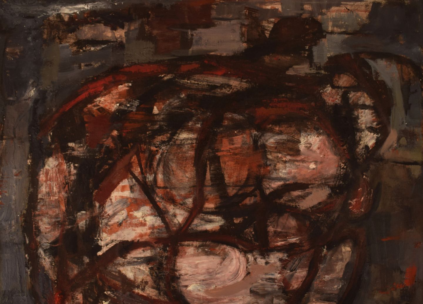 Pipin Henderson (f. 1924), Danmark. Olie på lærred. Abstrakt komposition. Midt 1900-tallet. Lærredet måler: 69 x 57 cm. Rammen måler: 7 cm. I flot stand. Usigneret.