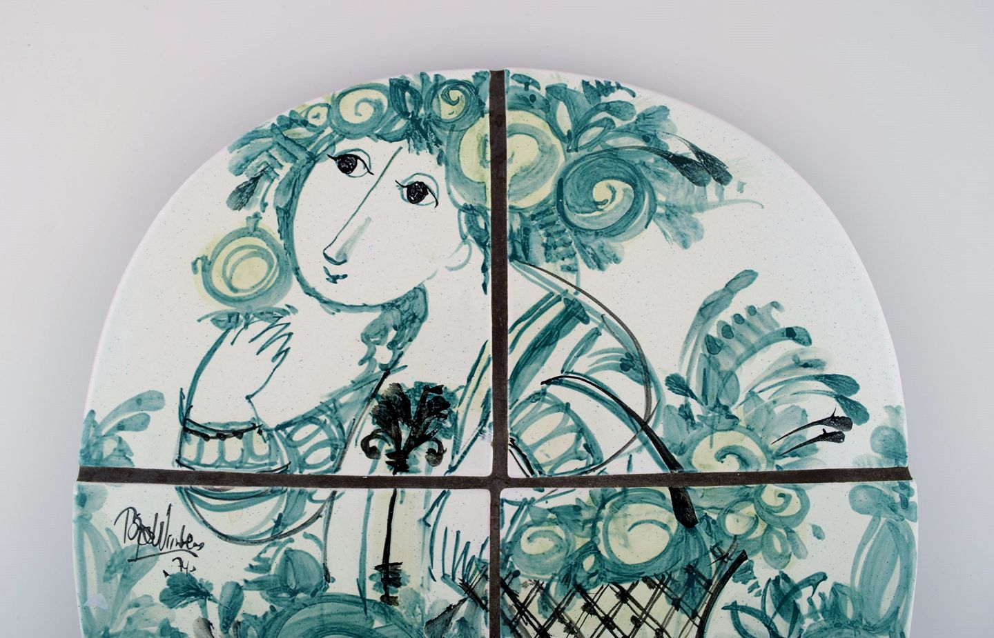 Bjørn Wiinblad (1918-2006). Unika væglysestage/relief med to lysarme udført i grønglaseret keramiske kakler, dekoreret med kvinde med blomsterkurv. Dateret 1974.