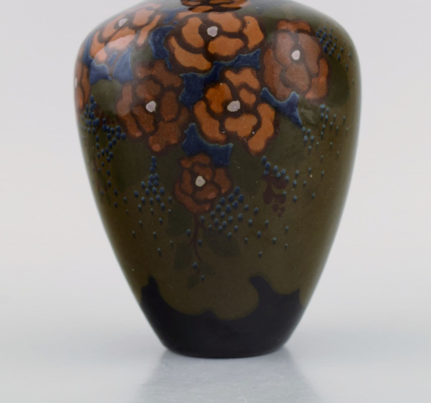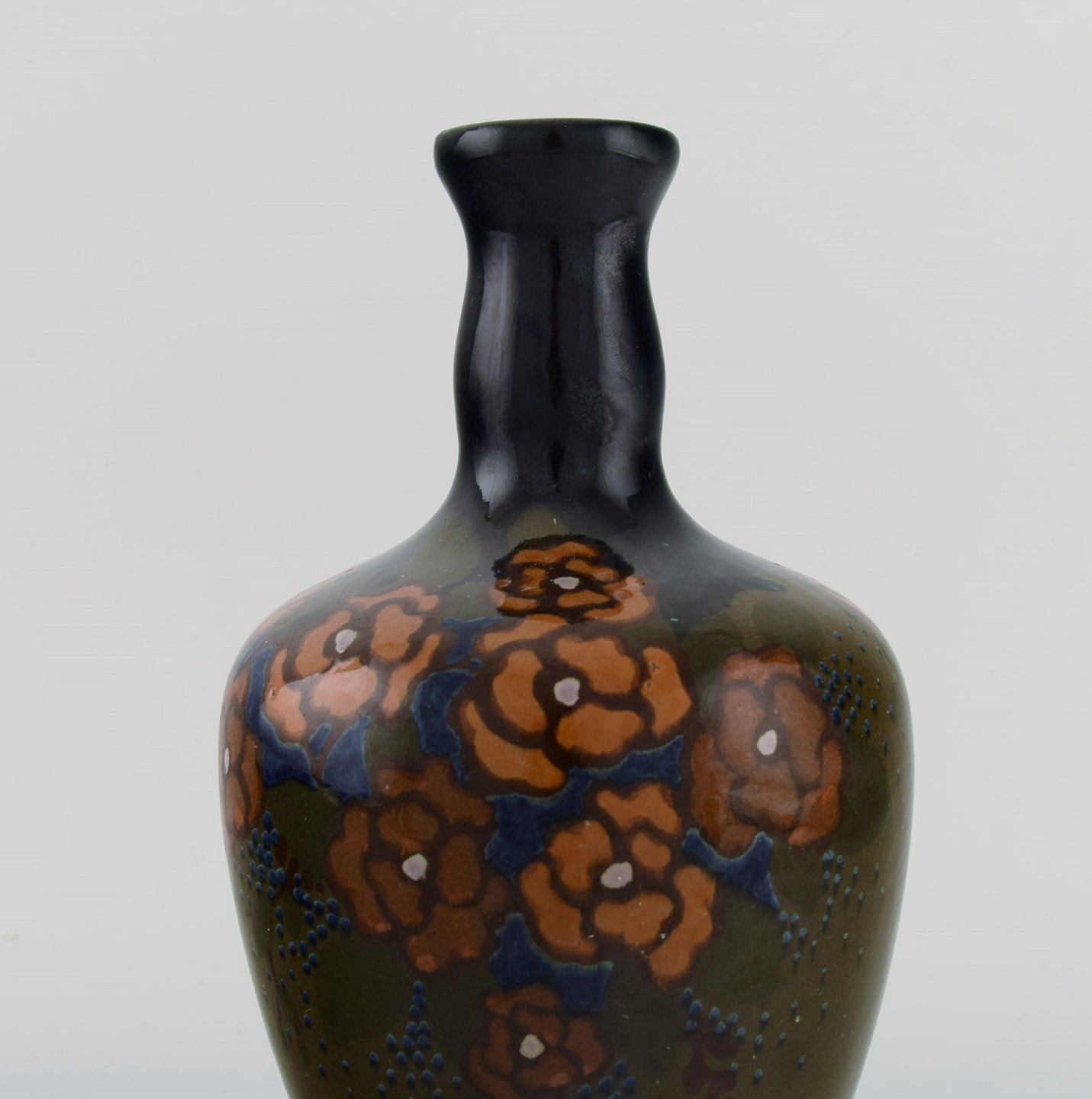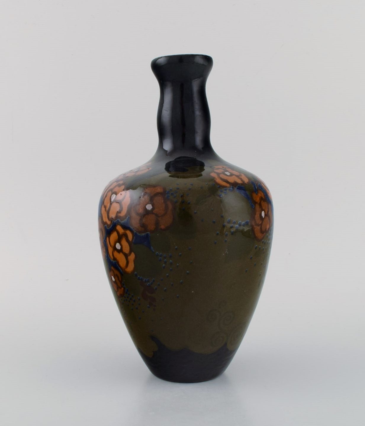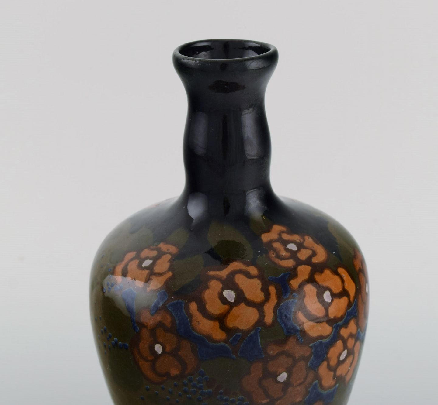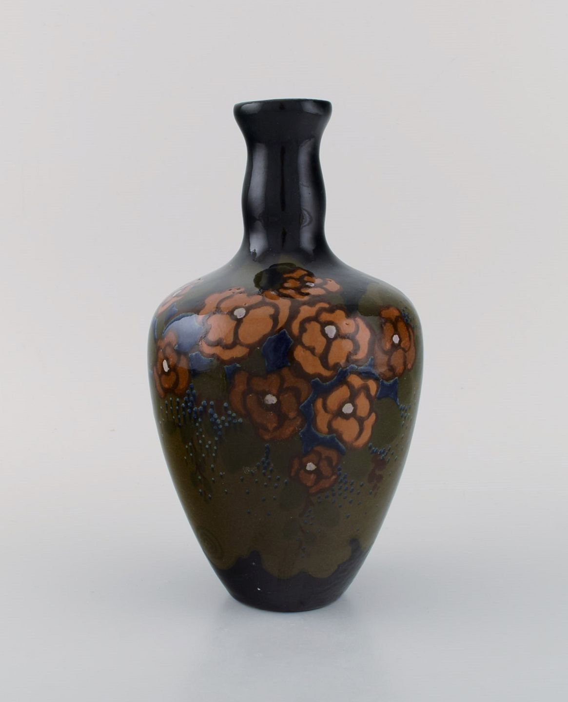 Arnhem, Holland. Antik art nouveau vase i glaseret keramik med håndmalede blomster og bladværk. Ca. 1910. Måler: 23 x 13 cm. I flot stand. Stemplet.
