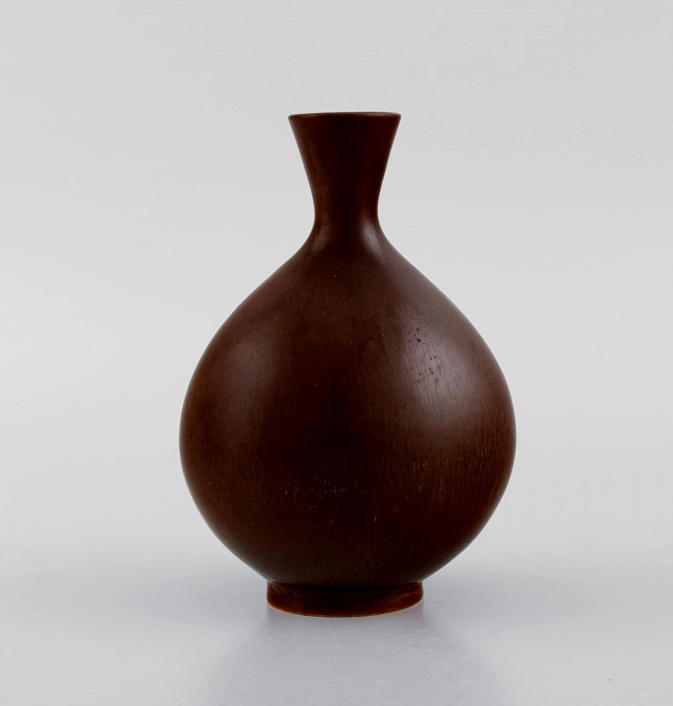 Berndt Friberg (1899-1981) for Gustavsberg Studiohand. Vase i glaseret stentøj. Smuk glasur i brune nuancer. 1960'erne. Måler: 13,3 x 9,5 cm. I flot stand. Stemplet.