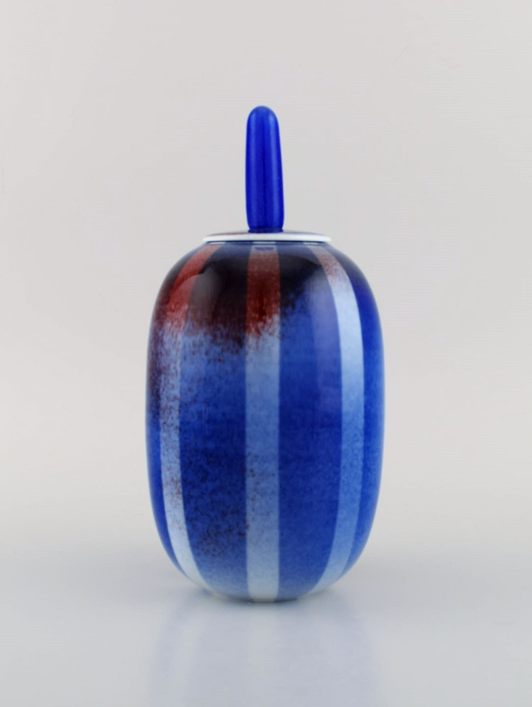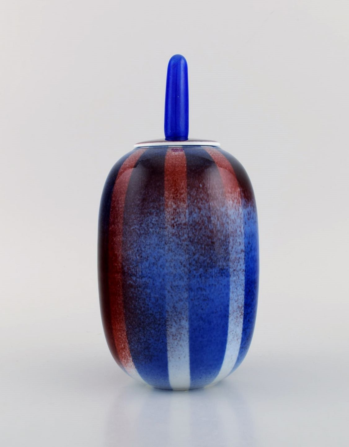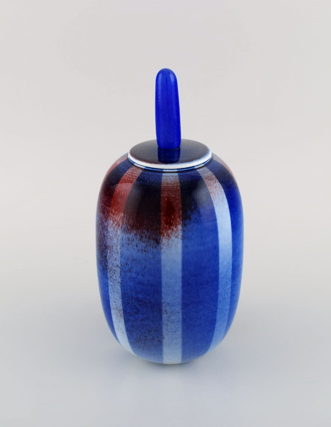 Suzanne Öhlén for Rörstrand. Lågkrukke i glaseret stentøj. Smuk glasur i blå og røde nuancer. Stribet design. 1980'erne.