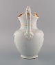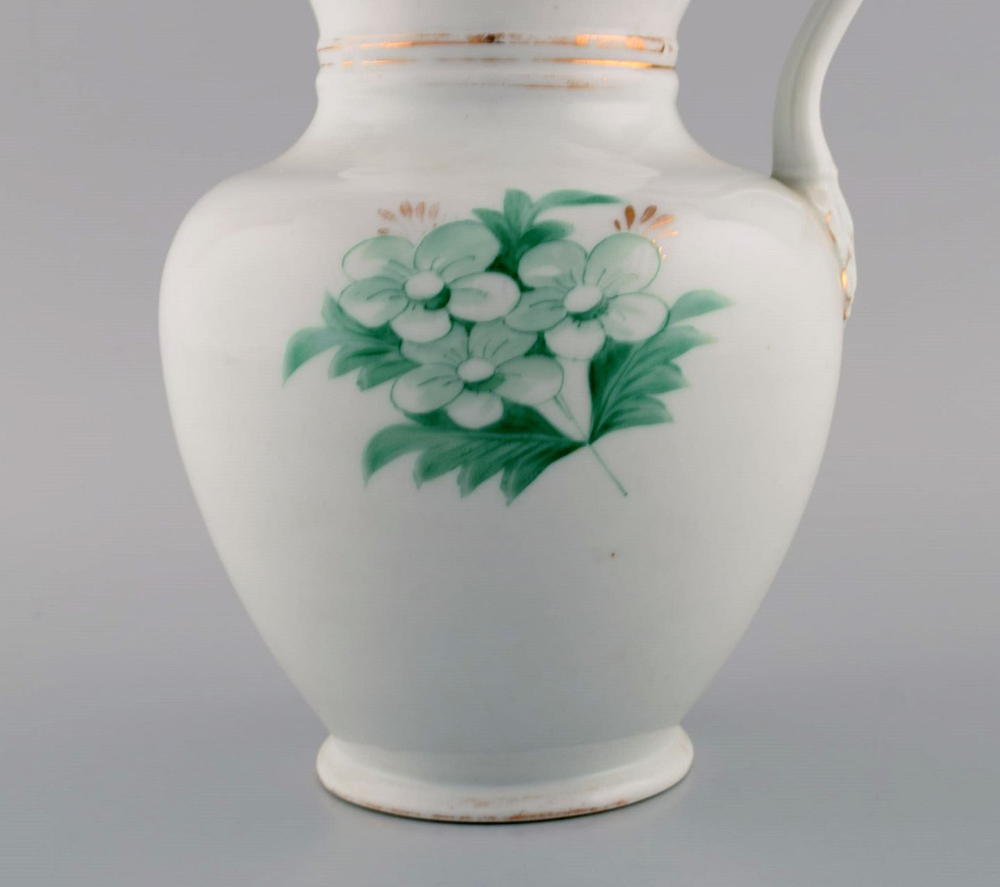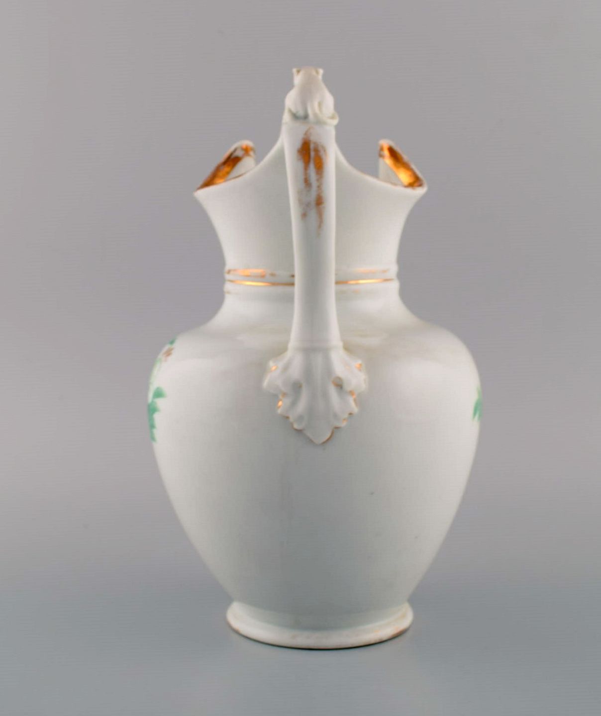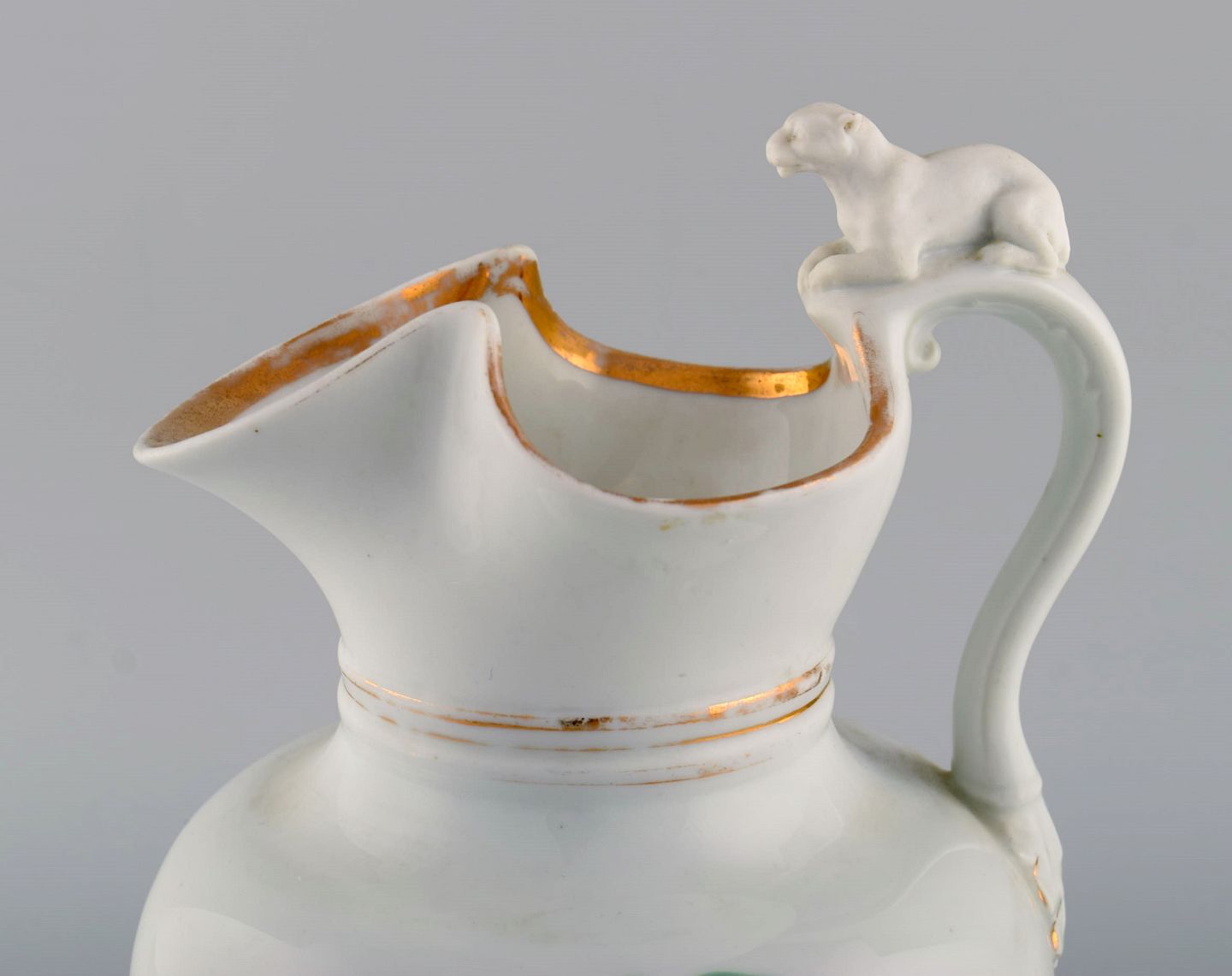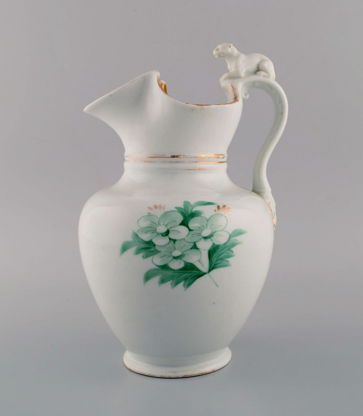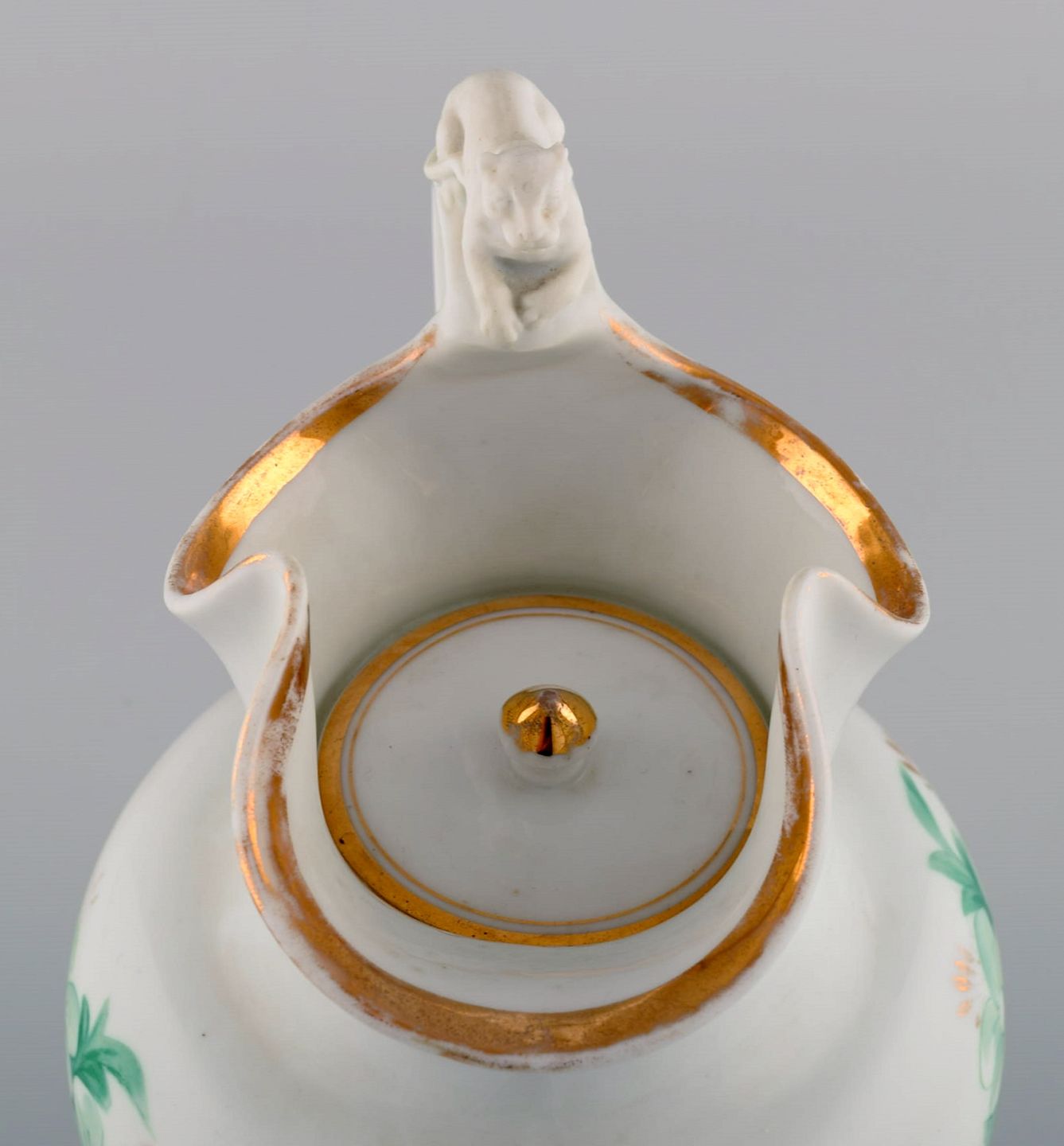 Antik Bing & Grøndahl chokoladekande i porcelæn modeleret med løve på hanken. Håndmalede blomster og gulddekoration. 1870'erne.