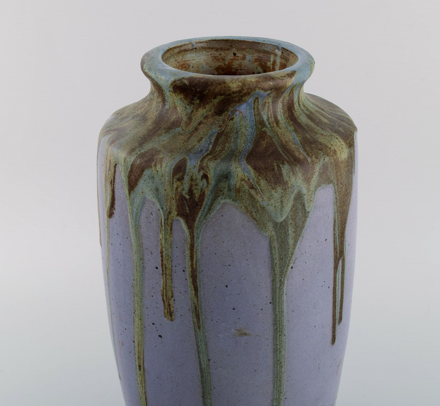 Leon Pointu (1879-1942), Frankrig. Stor art deco vase i glaseret stentøj. Smuk løbeglasur på lilla baggrund. 1930'erne. Måler: 35 x 17 cm. I flot stand. Signeret.