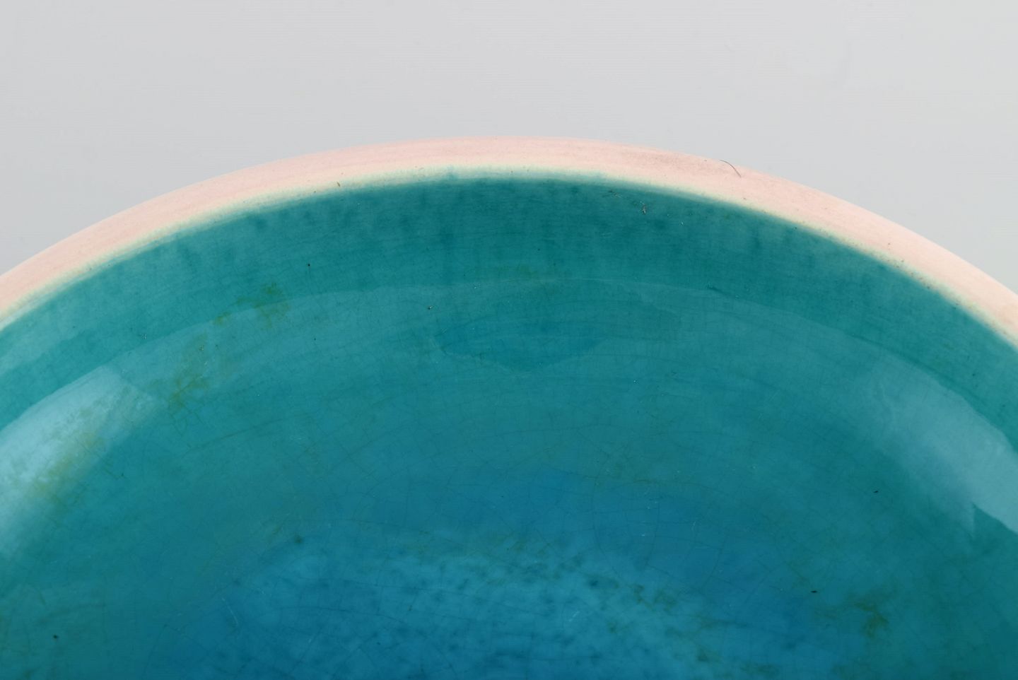 Keramos Sèvres, Frankrig. Stor skål i glaseret stentøj. Smuk indvendig turkis glasur. Stilrent design, midt 1900-tallet.