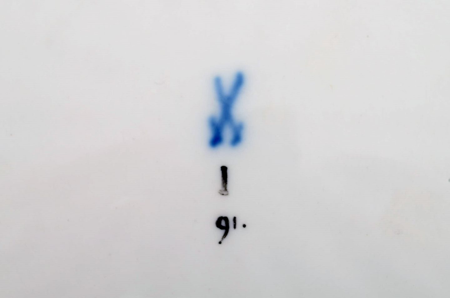 To antikke Meissen tallerkener i håndmalet porcelæn. Blå blomster og gulddekoration. Tidligt 1900-tallet. Største diameter: 21,5 cm. I flot stand. Stemplet. 1. Sortering.