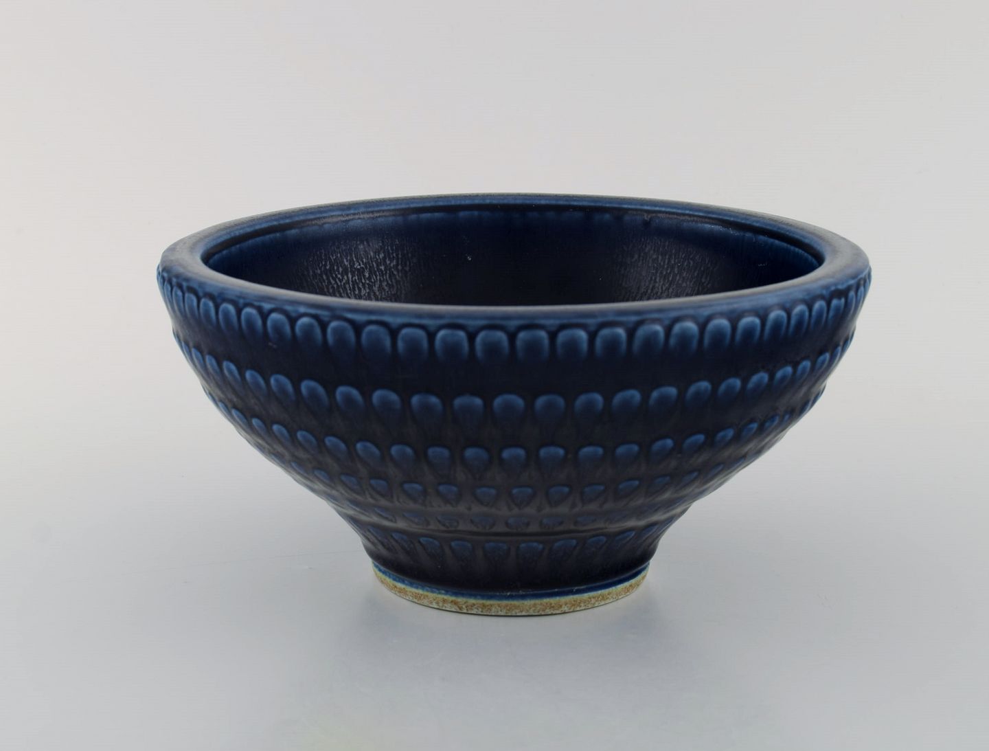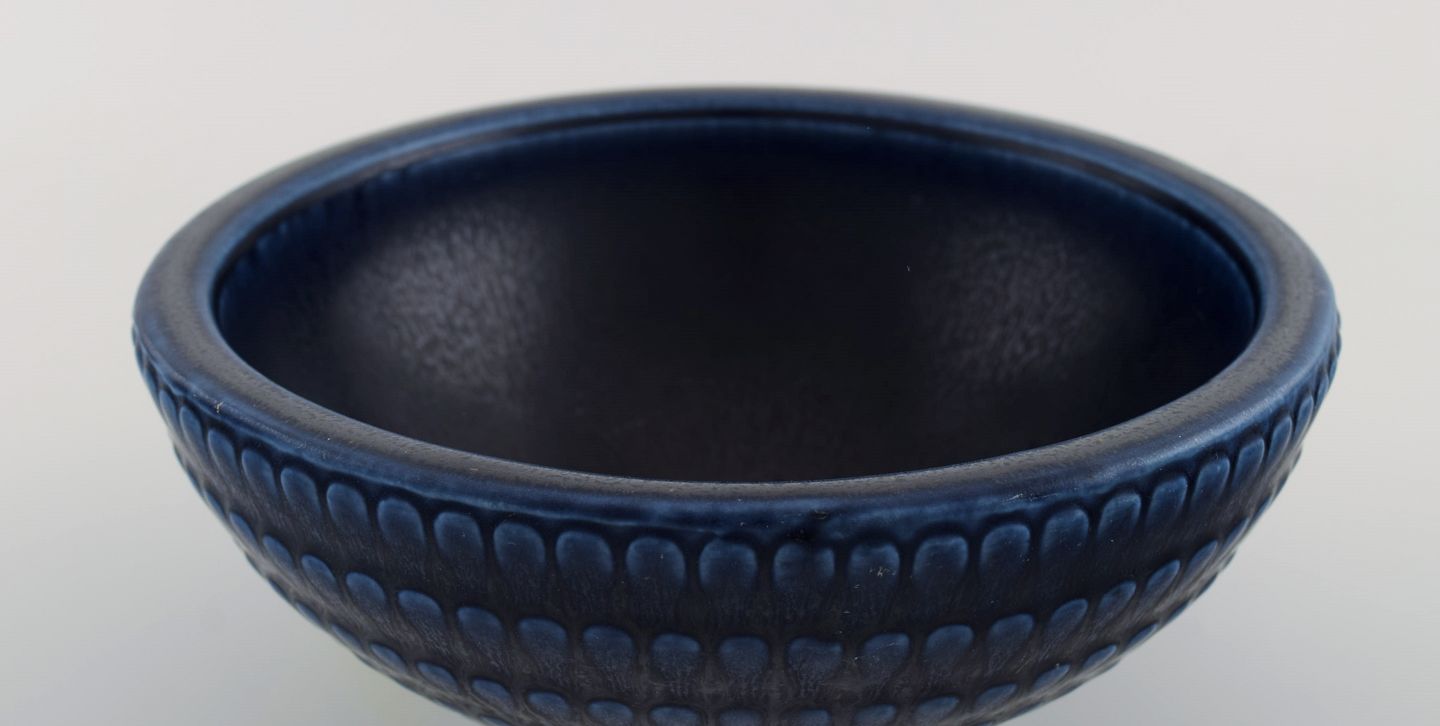 Wilhelm Kåge (1889-1960) for Gustavsberg. Stor skål i glaseret stentøj. Smuk glasur i blå/brune nuancer. Midt 1900-tallet. Måler: 21 x 10 cm. Stemplet. Gustavsberg Kåge Verkstad. I flot stand.