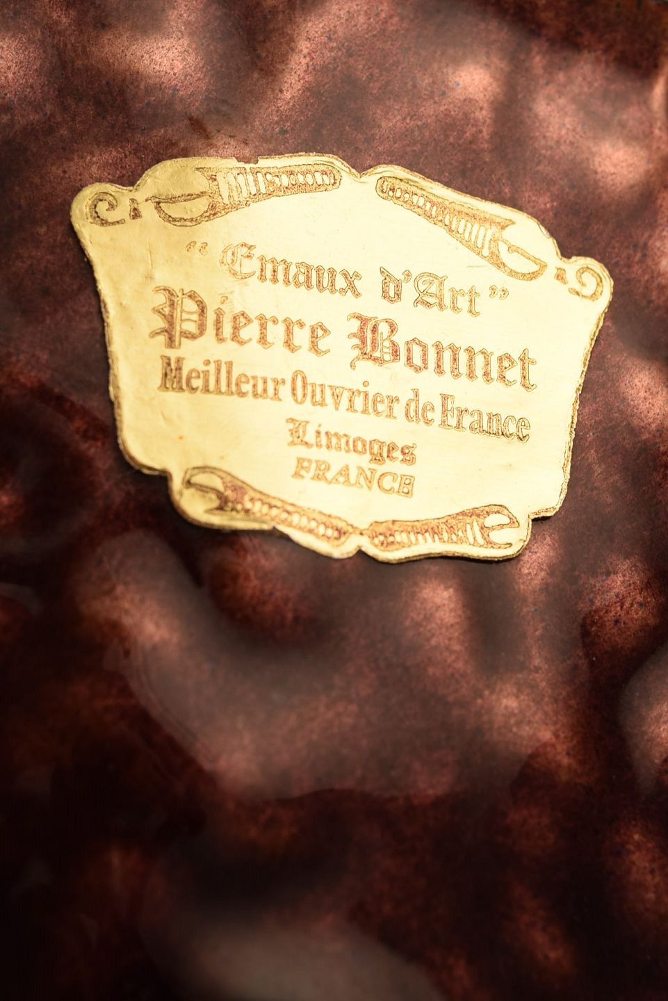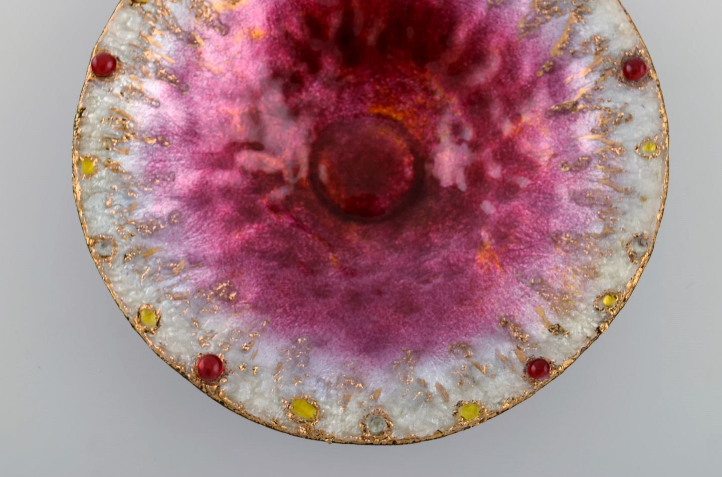 Pierre Bonnet for Limoges. Bronze bowl in enamel work with red and yellow art glass stones inlaid on a pink background. Mid-20th century. Measures: 19.5 x 4 cm. In excellent condition. Sticker.