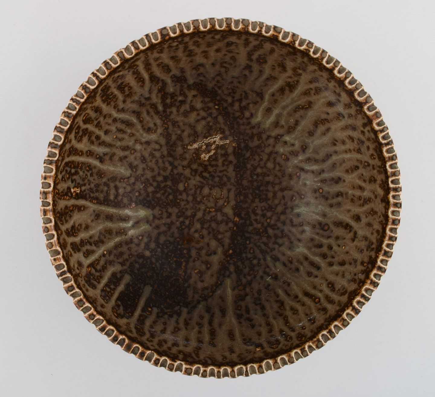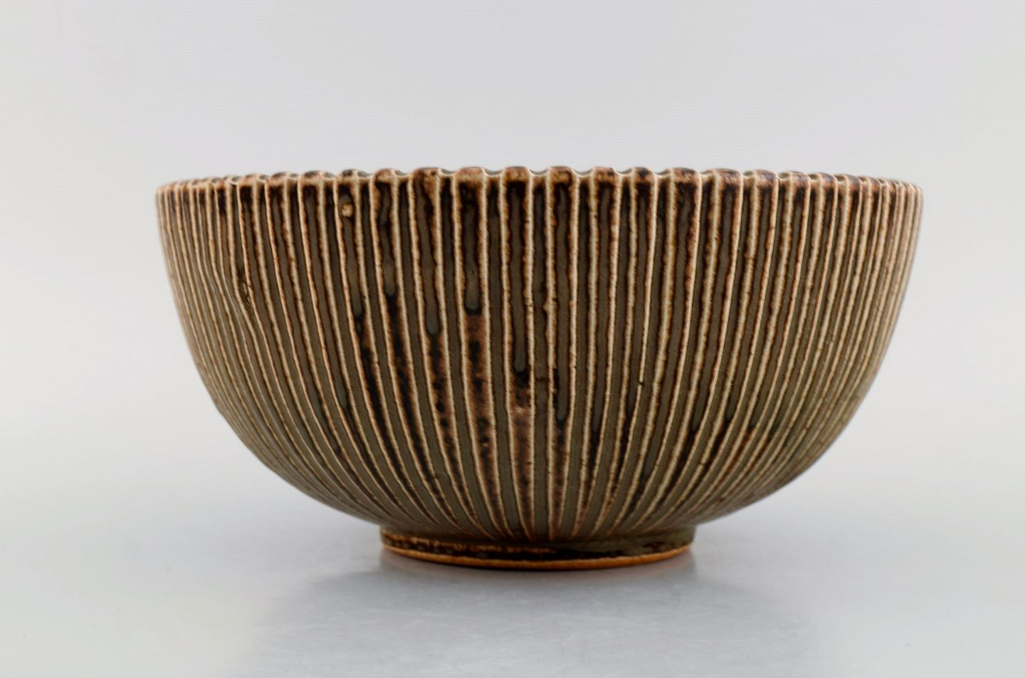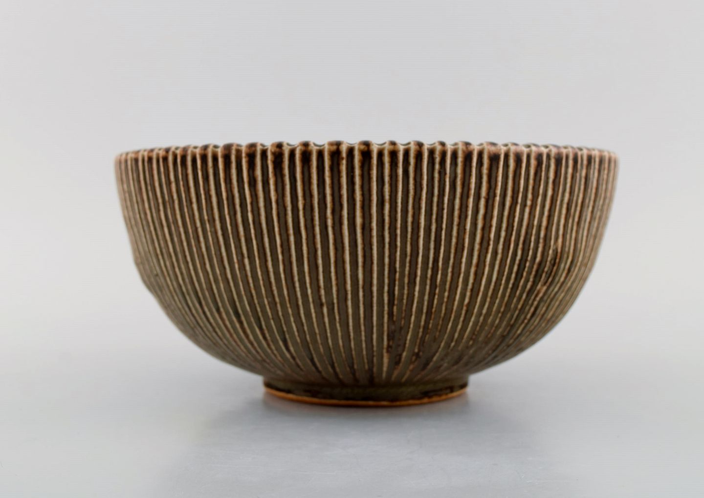 Arne Bang (1901-1983), Danmark. Skål i glaseret keramik modelleret med rillet korpus. Modelnummer 122. Smuk glasur i lyse brune nuancer. 1940/50'erne.