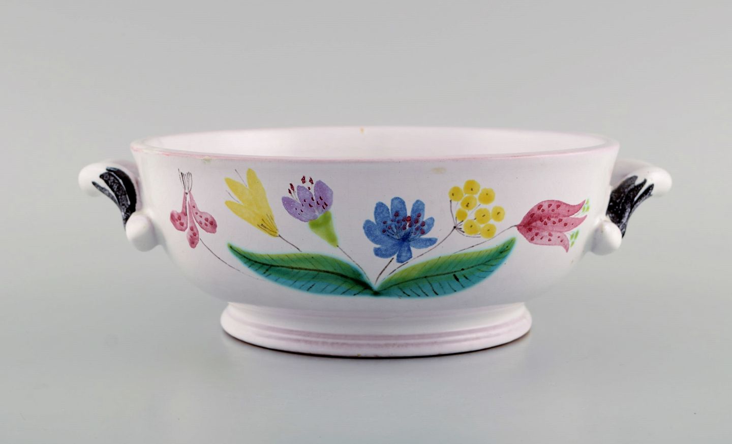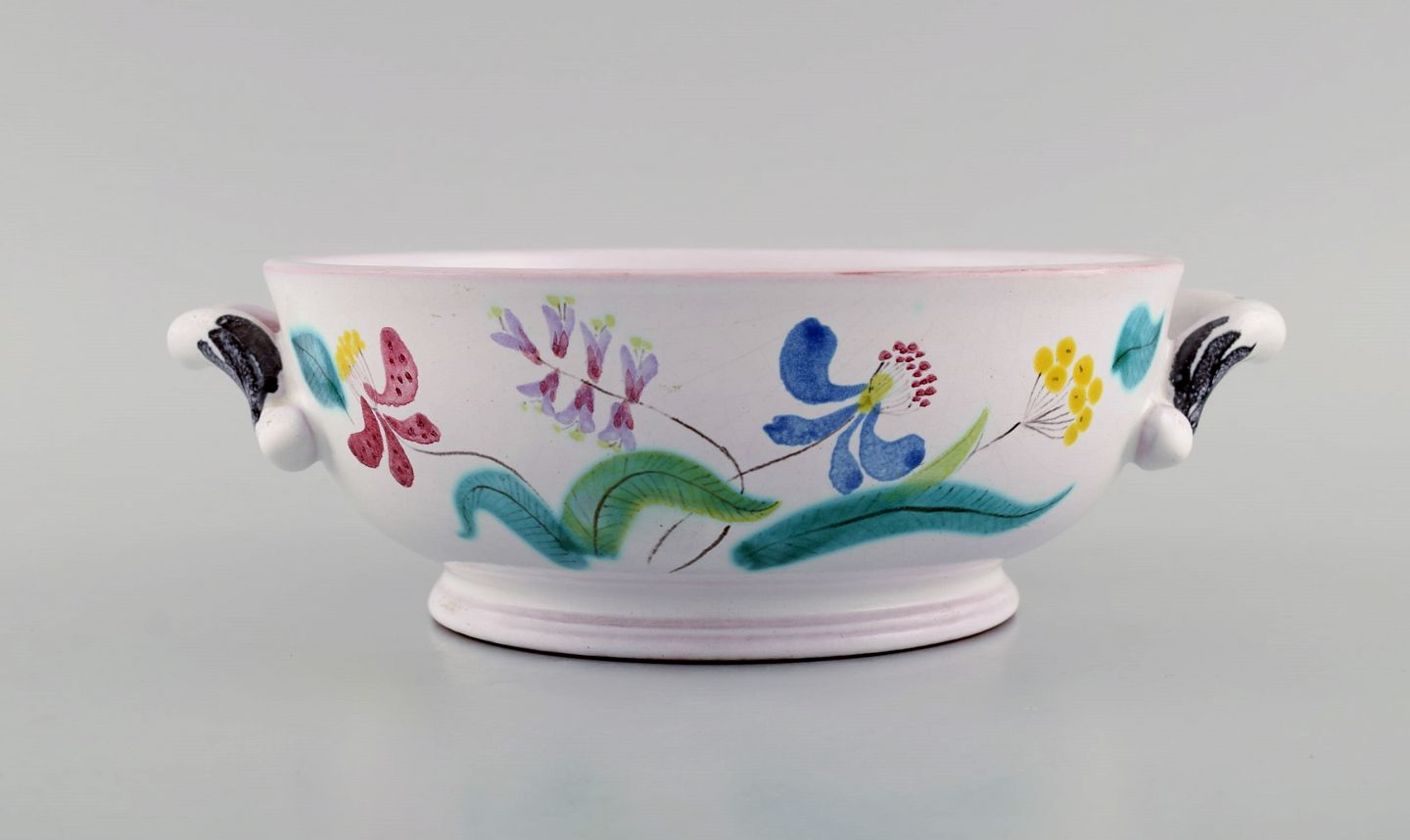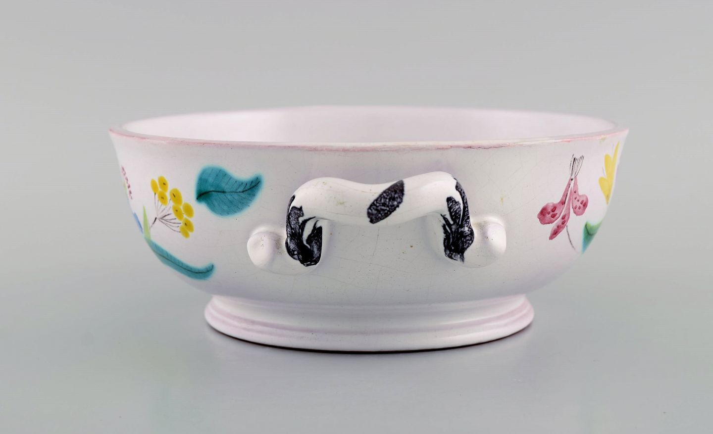 Stig Lindberg for Gustavsberg Studio Hand. Skål med hanke i glaseret fajance med håndmalede blomster. 1940'erne.