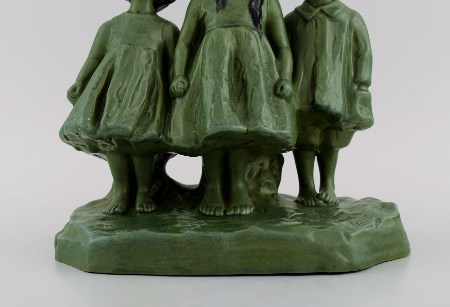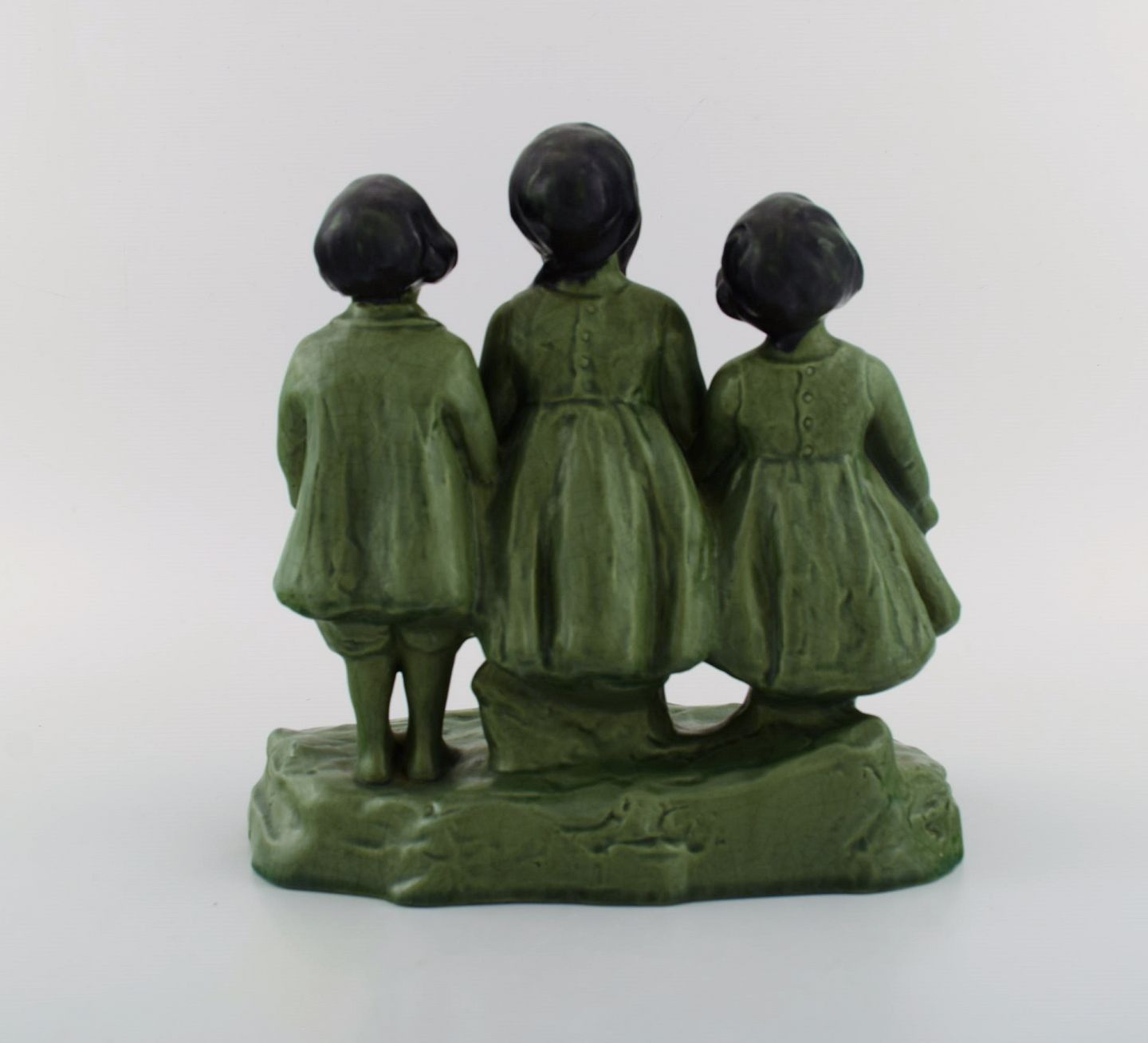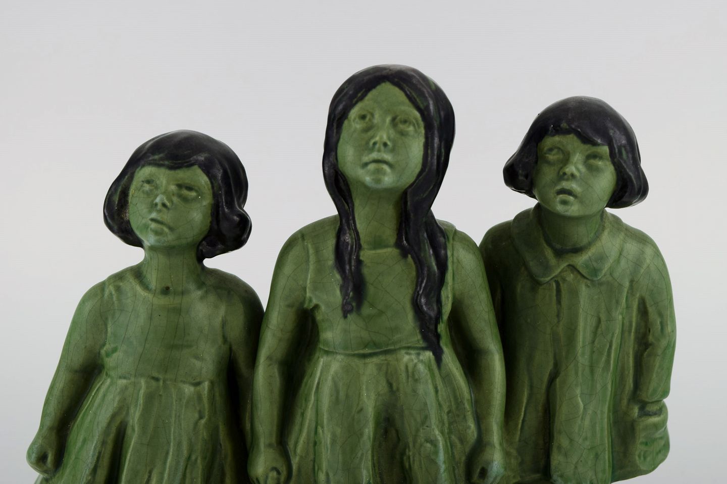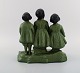 Alice Nordin for Ipsens Enke. Stor skulptur i jadegrøn glaseret keramik. Tre piger spejder efter vildgæs. Ca. 1920. Måler: 23,5 x 22,5 cm. I flot stand. Signeret.