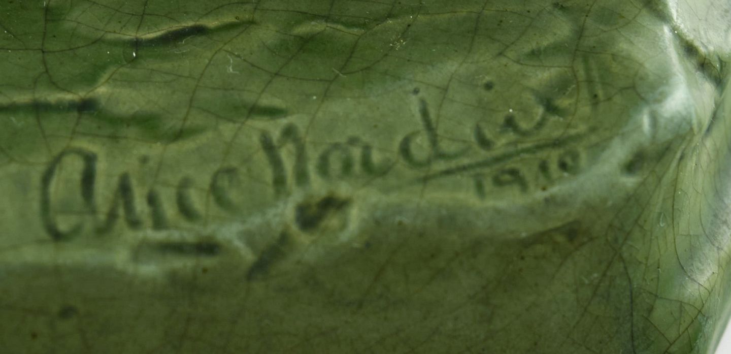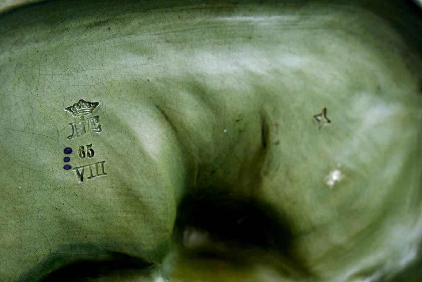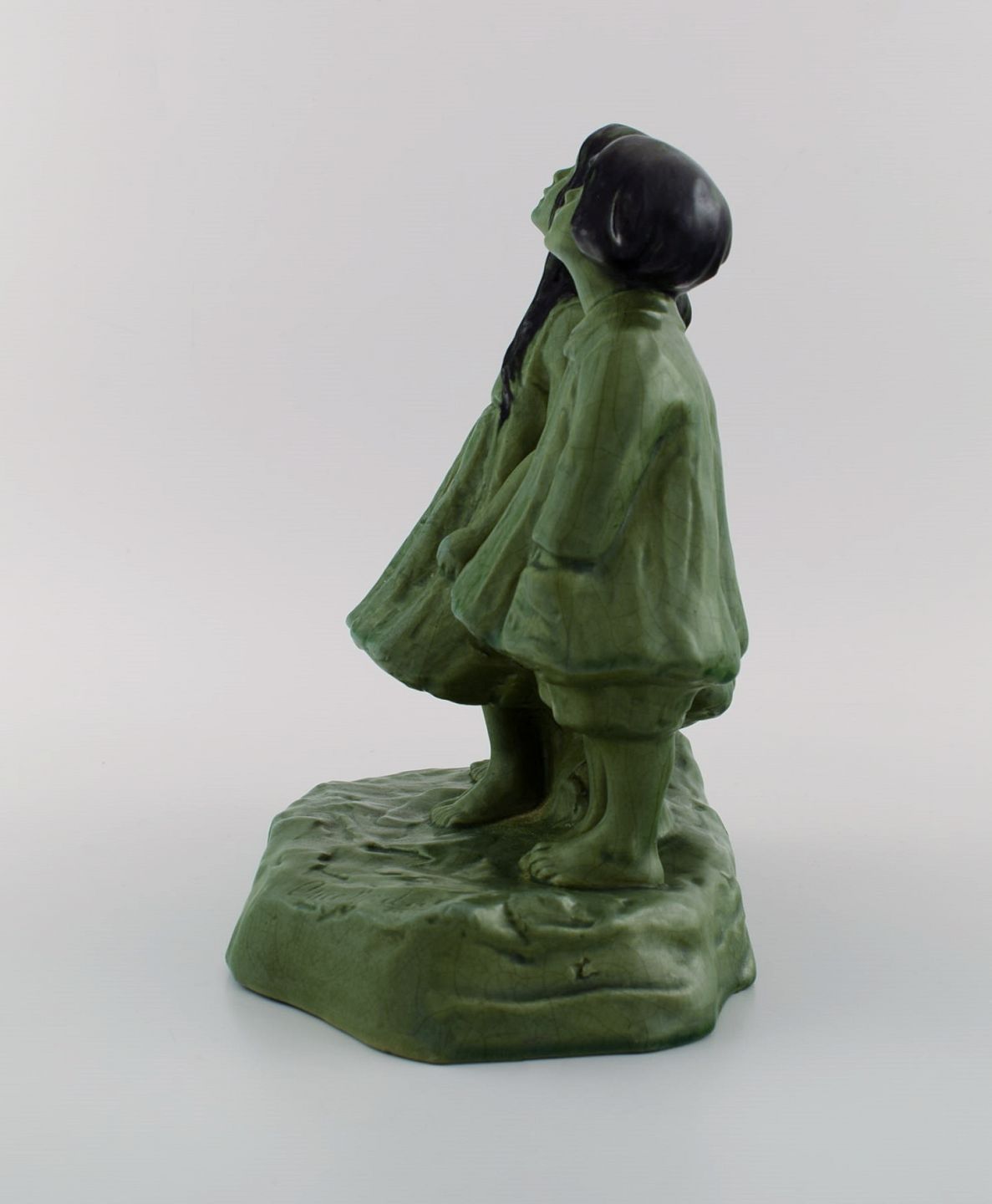 Alice Nordin for Ipsens Enke. Stor skulptur i jadegrøn glaseret keramik. Tre piger spejder efter vildgæs. Ca. 1920. Måler: 23,5 x 22,5 cm. I flot stand. Signeret.