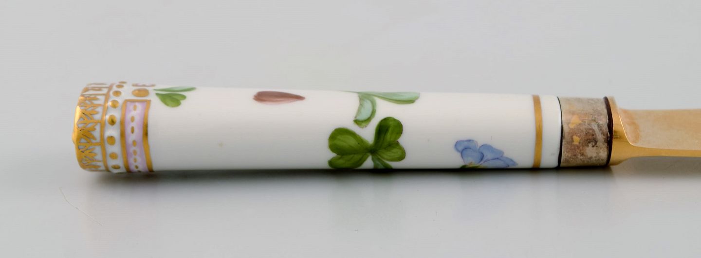 Royal Copenhagen Flora Danica lunch knife of gold plated sterling silver. Porcelain handle decorated in colors and gold with flowers. In excellent condition. Stamped. Measures: 23.5 cm.