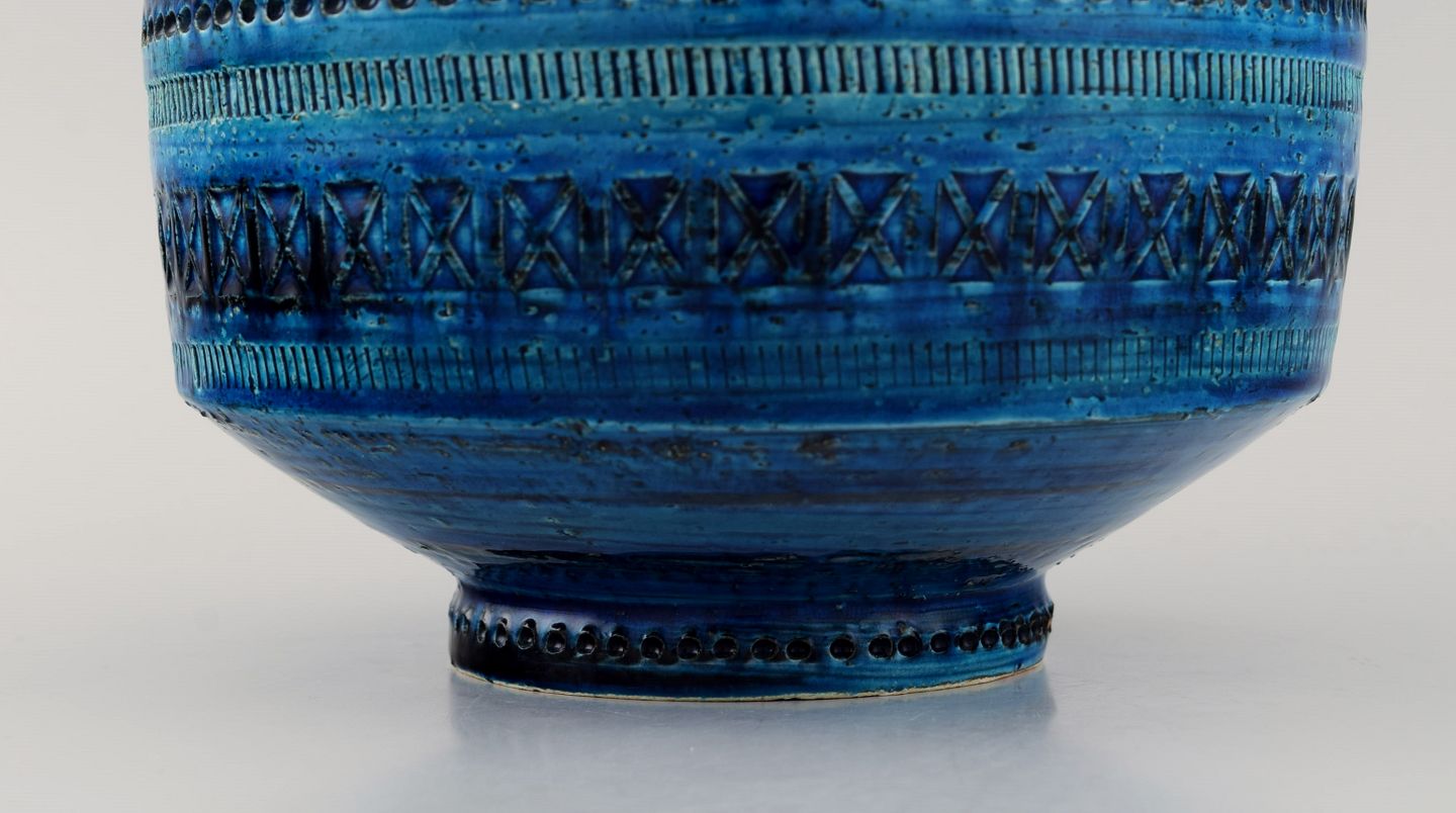 Aldo Londi for Bitossi. Skål / blomsterkrukke i Rimini-blå glaseret keramik med geometriske mønstre. 1960'erne. Måler: 19 x 11 cm. I flot stand. Stemplet.