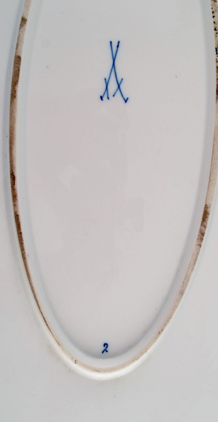 Gigantisk antikt Meissen Løgmønstret serveringsfad i håndmalet porcelæn. Sent 1800-tallet. Måler: 55 x 42 x 6,5 cm. I flot stand. Stemplet. 1. Sortering.