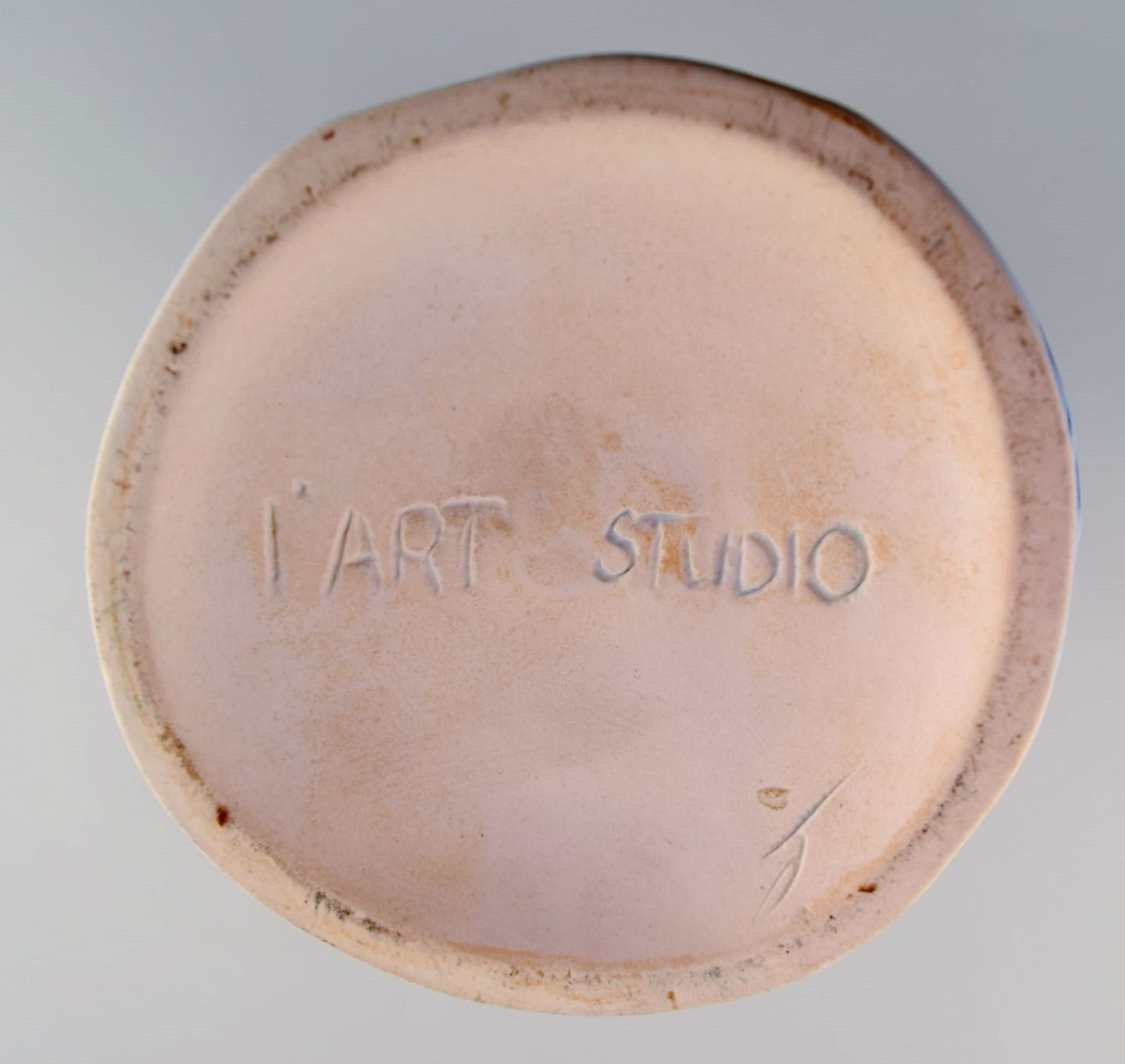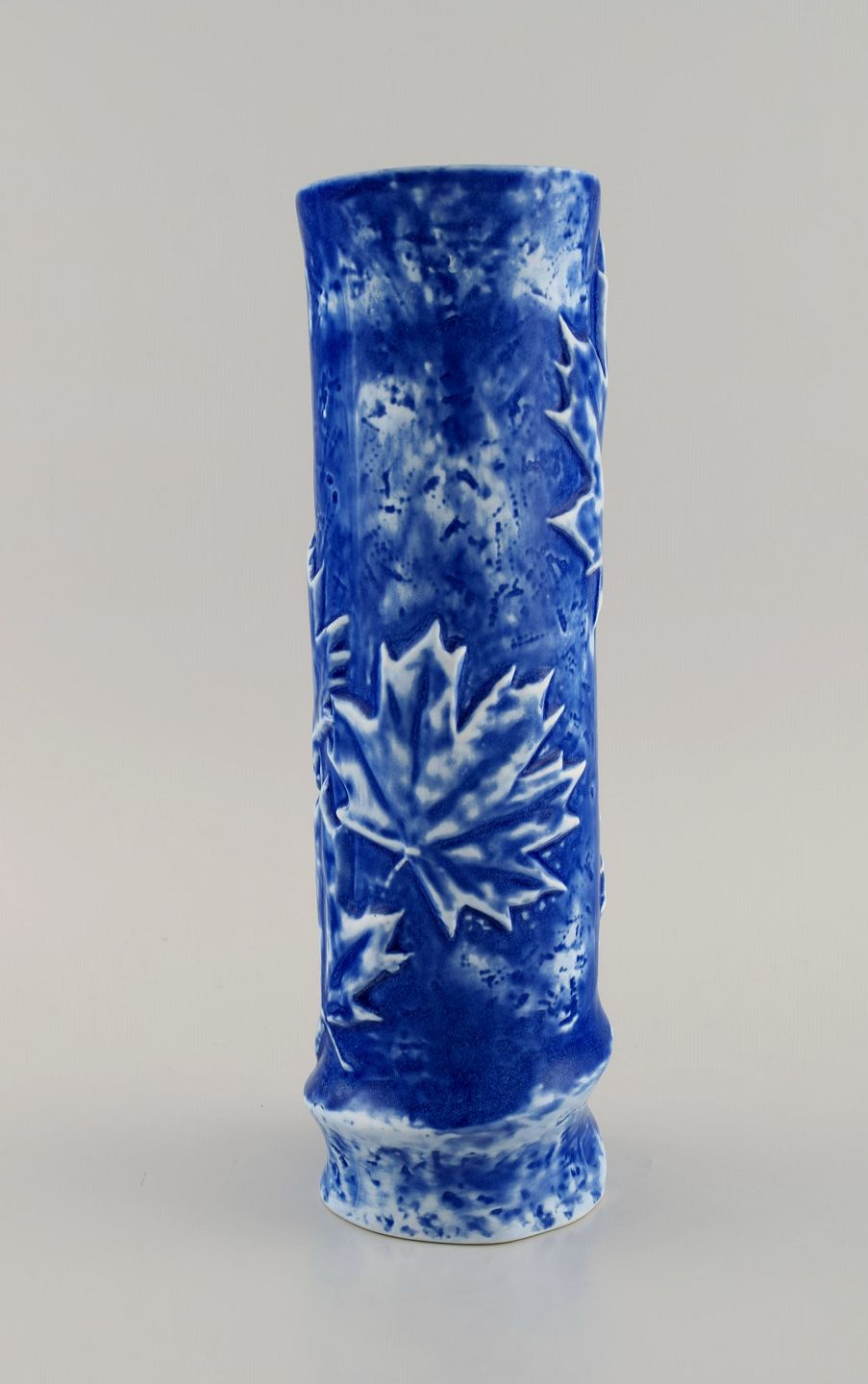 Europæisk studiokeramiker. Cylindrisk vase i glaseret keramik dekoreret med ahornblade. Smuk glasur i blå nuancer. Sent 1900-tallet. Måler: 30 x 10 cm. I flot stand. Signeret.