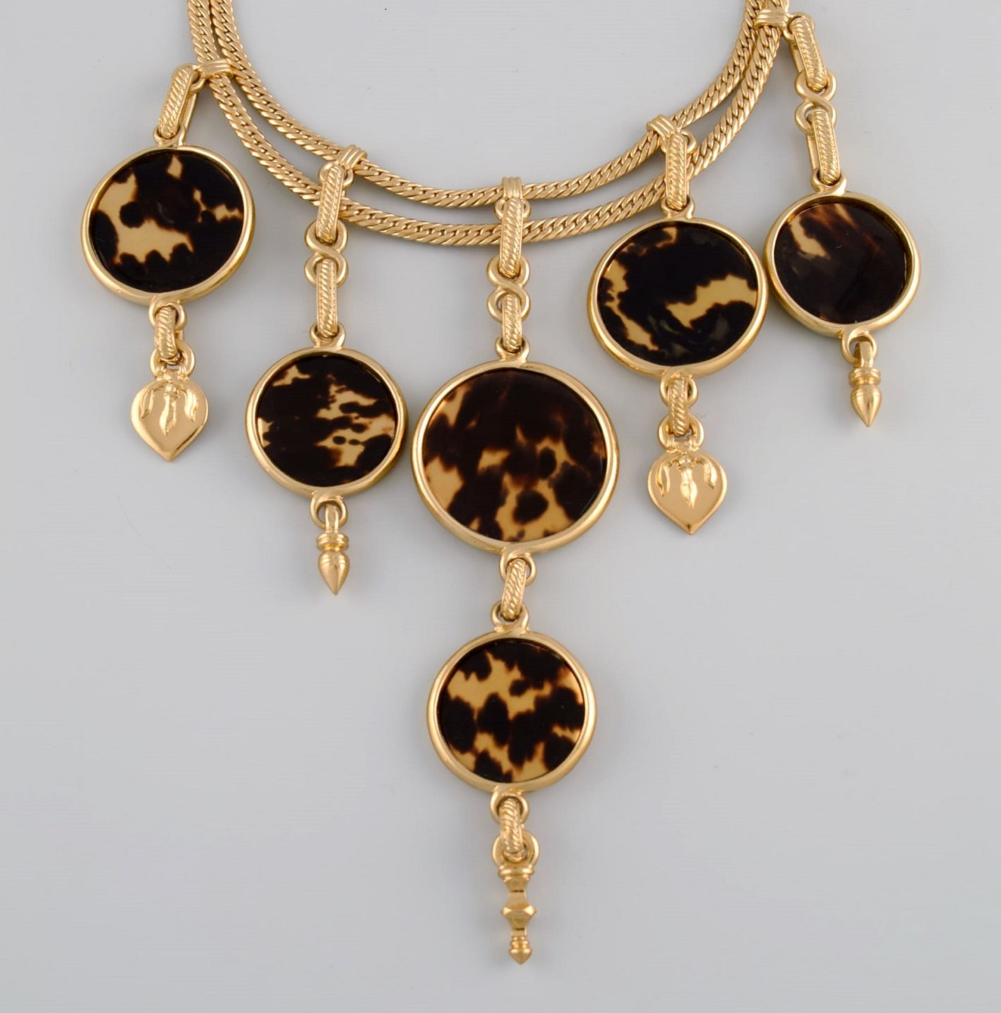 Stor vintage Yves Saint Laurent "Gold" halskæde med fem vædhæng. 1970/80'erne. Total længde: 40-50 cm. (justerbar). Kædens bredde: 5 mm. Største vedhæng diameter: 4,5 cm. I flot stand. Stemplet.