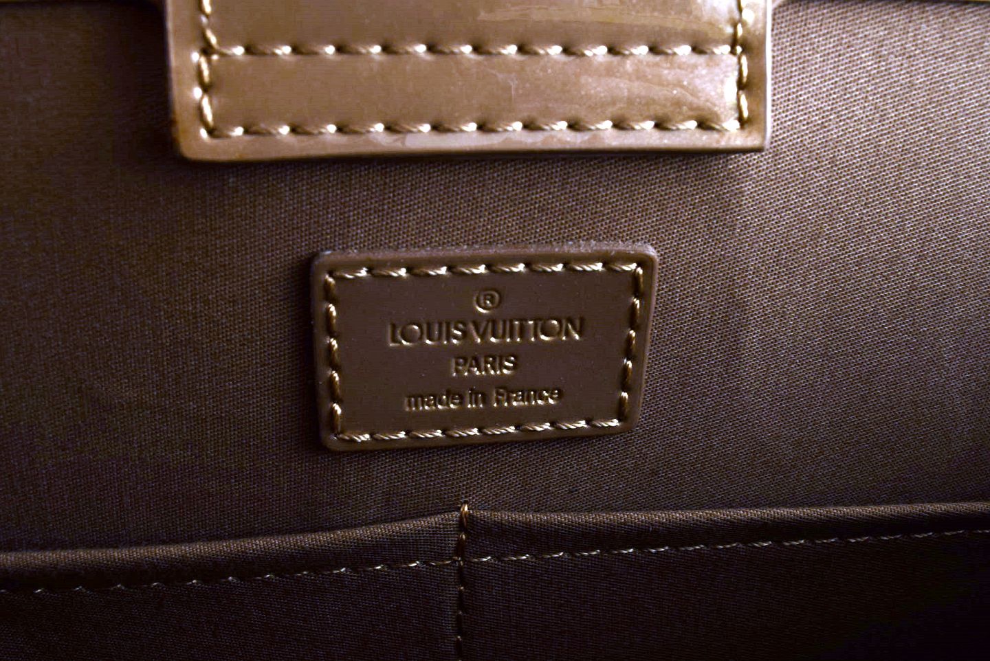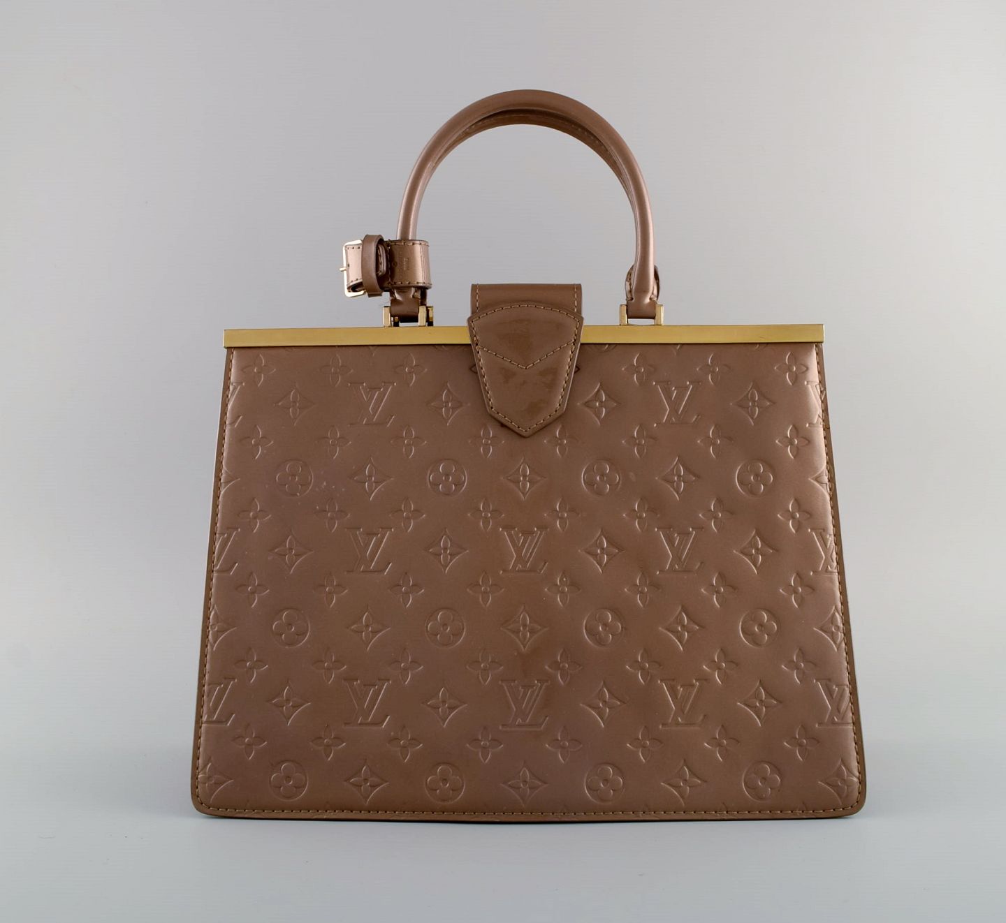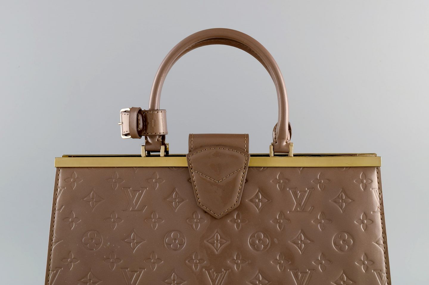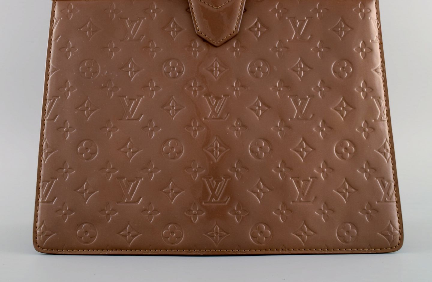 Monogram-embossed vernis patent leather in chocolate brown colour with details in gold-coloured metal. Interior in brown fabric, three compartments including one with a zipper. Stamped "LOUIS VUITTON Paris made in France".