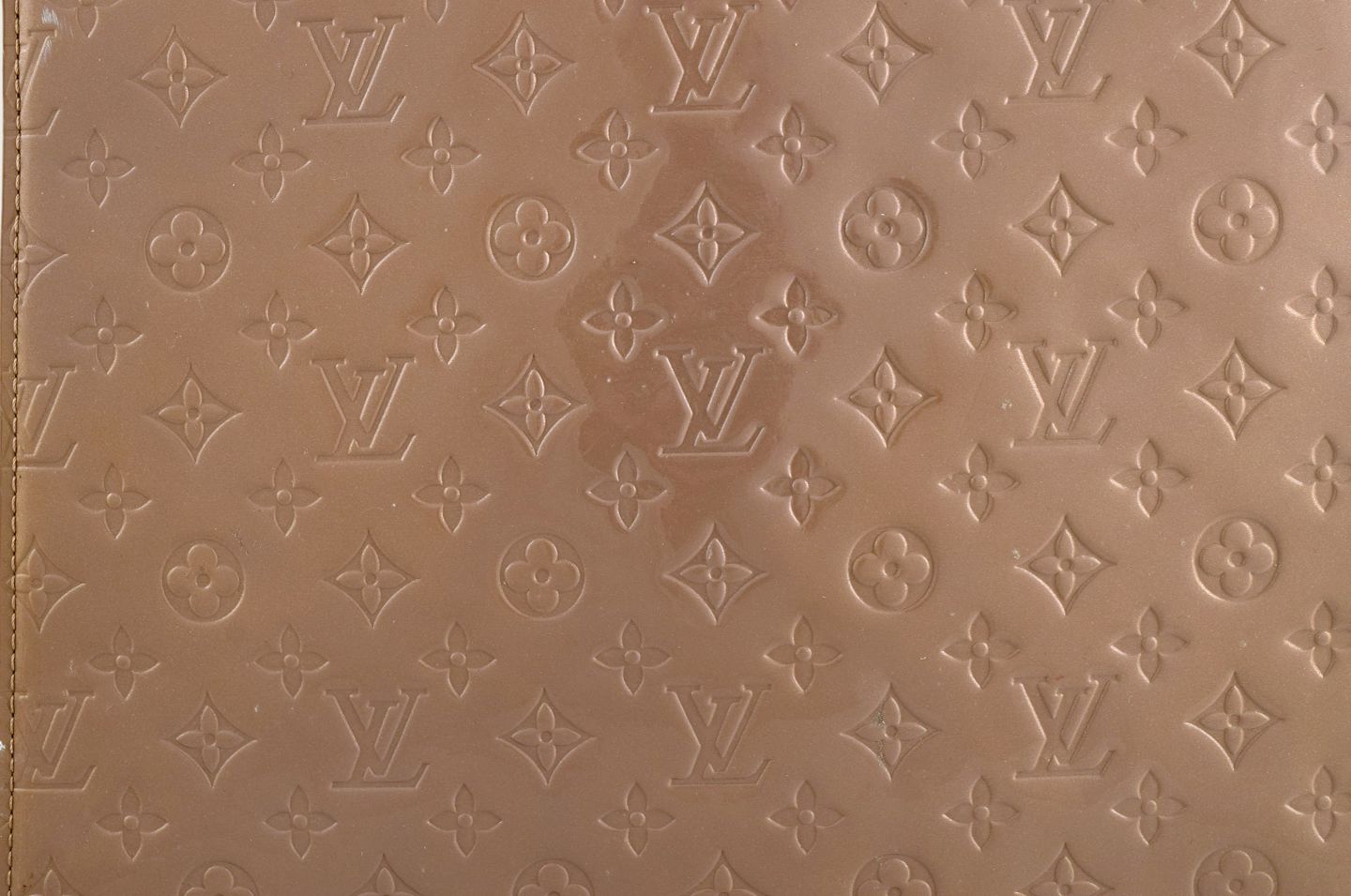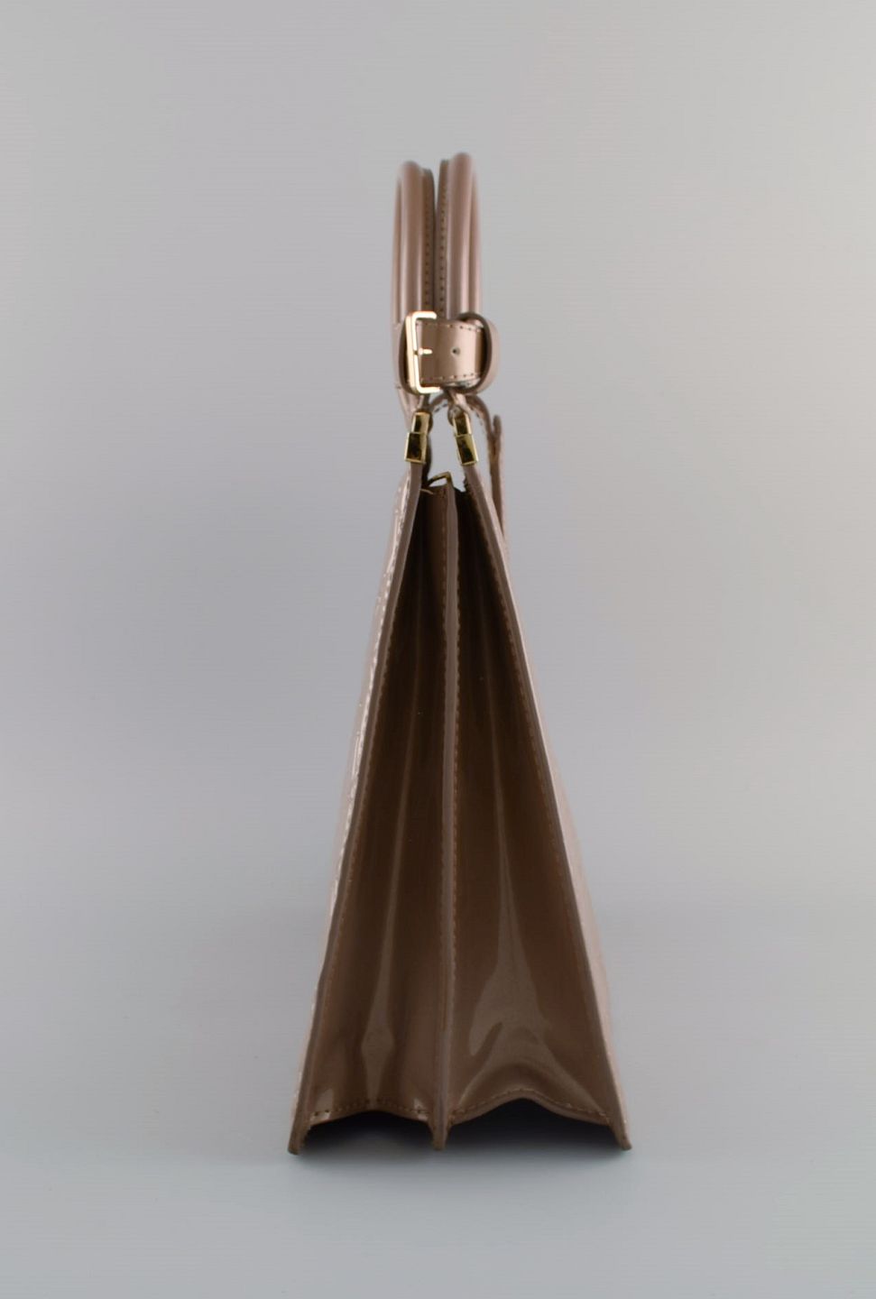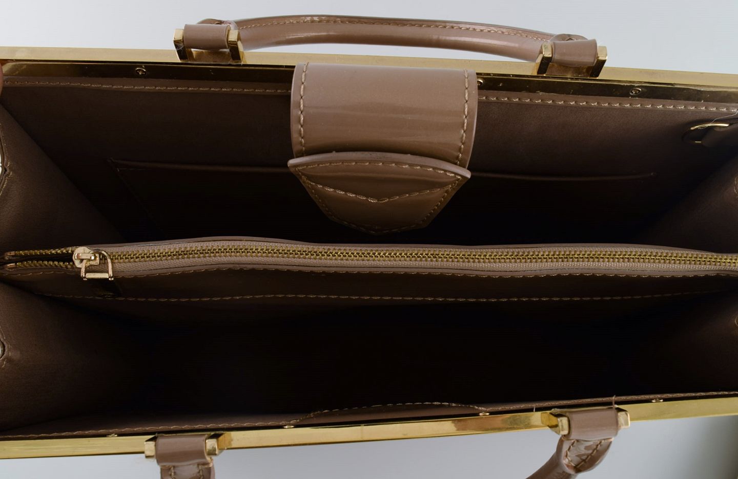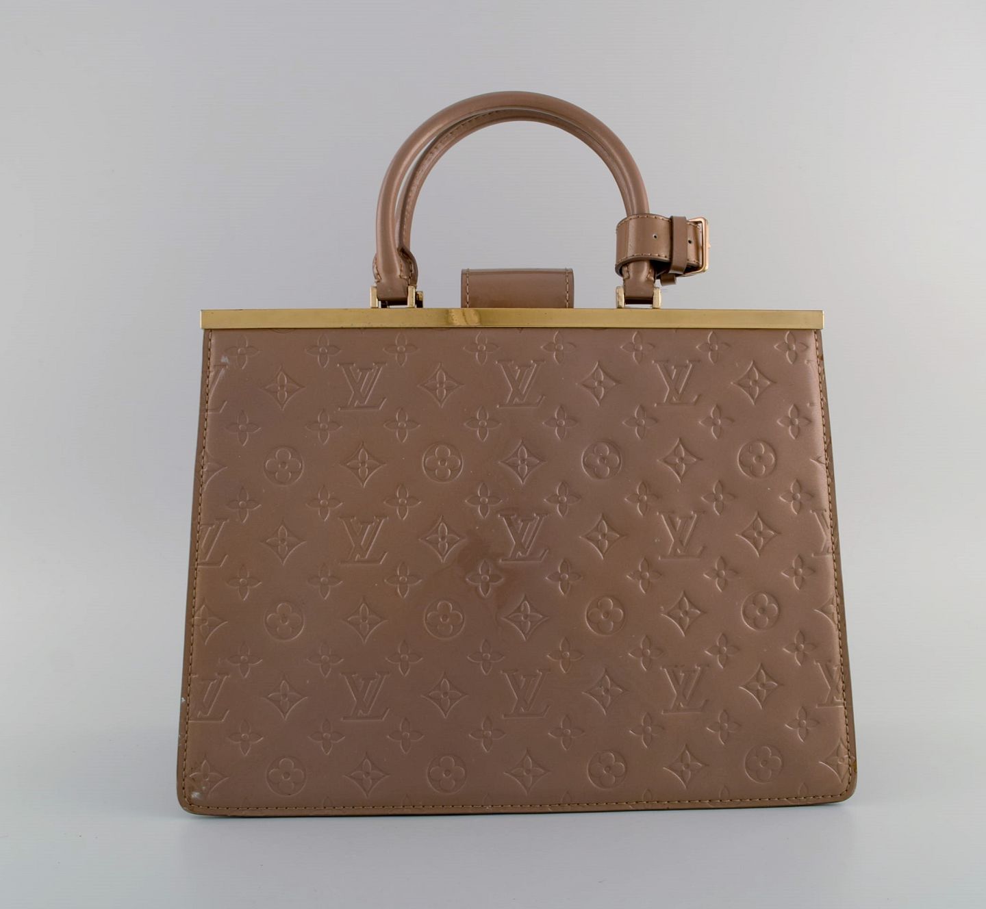 Monogram-embossed vernis patent leather in chocolate brown colour with details in gold-coloured metal. Interior in brown fabric, three compartments including one with a zipper. Stamped "LOUIS VUITTON Paris made in France".