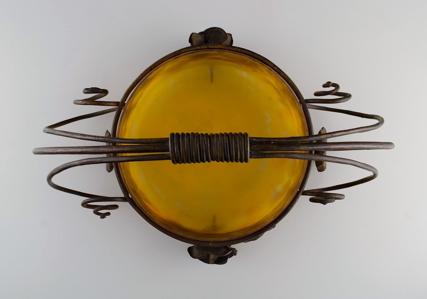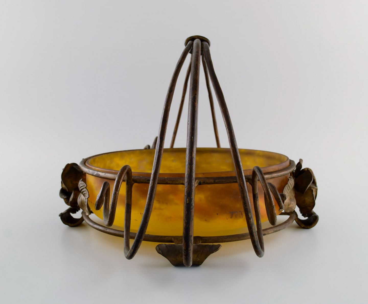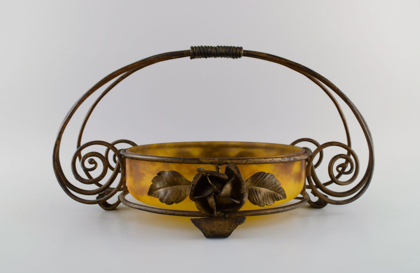 Muller Frères, Luneville. Art deco skål i mundblæst kunstglas med hank og holder i smedejern udformet med blomster og blade. Frankrig, 1930'erne. Måler: 46 x 32 cm. I flot stand. Signeret.